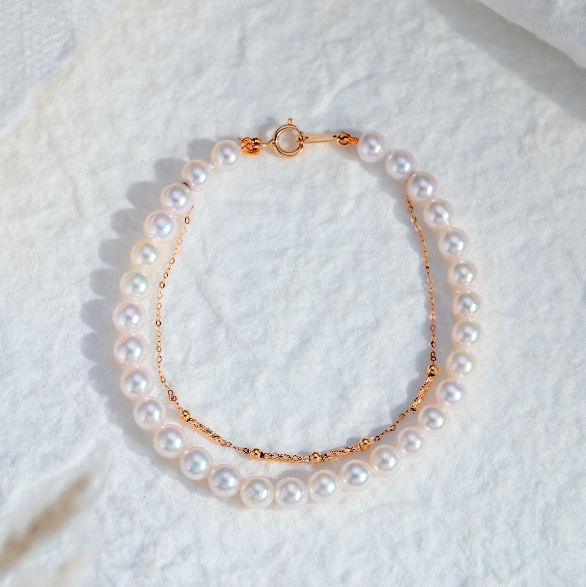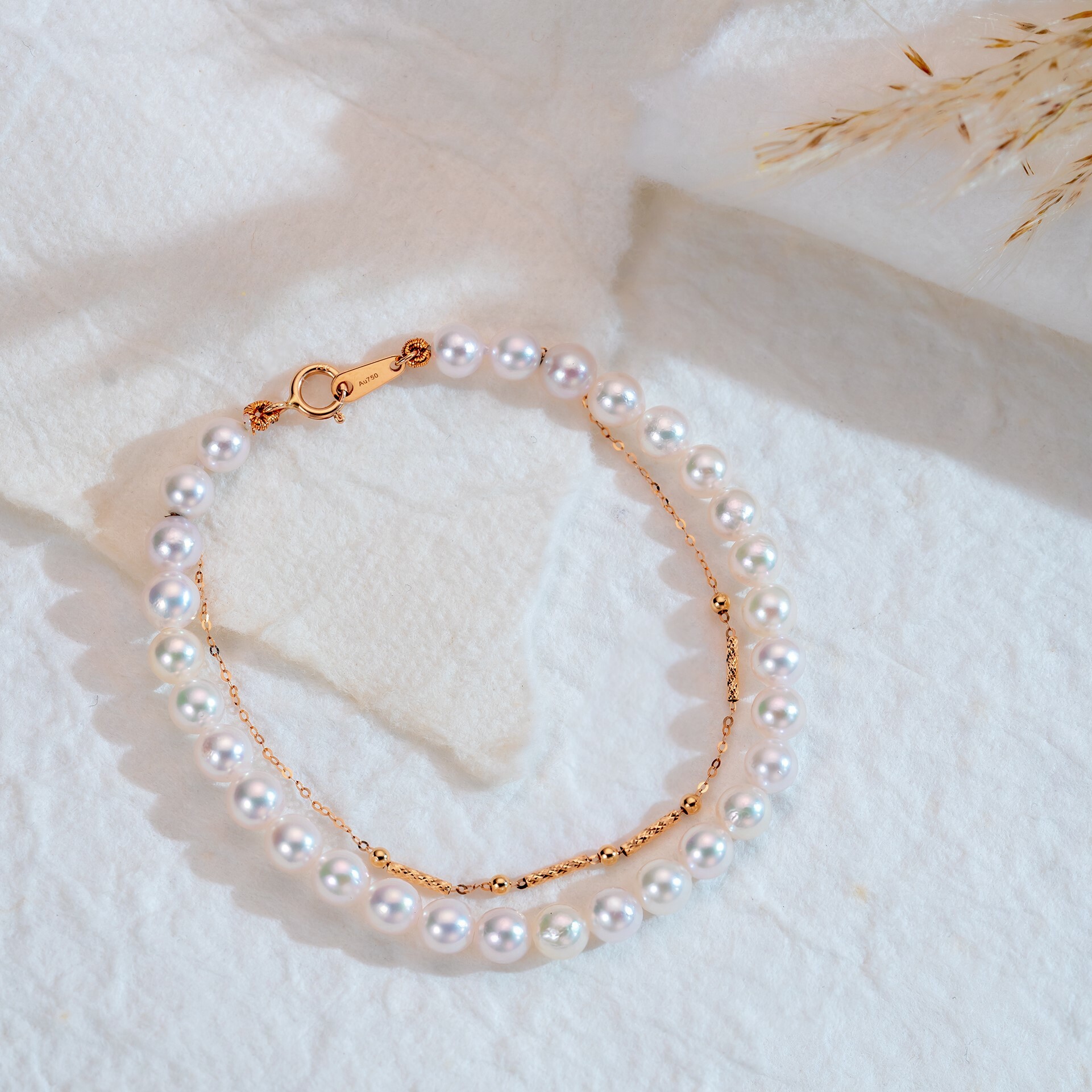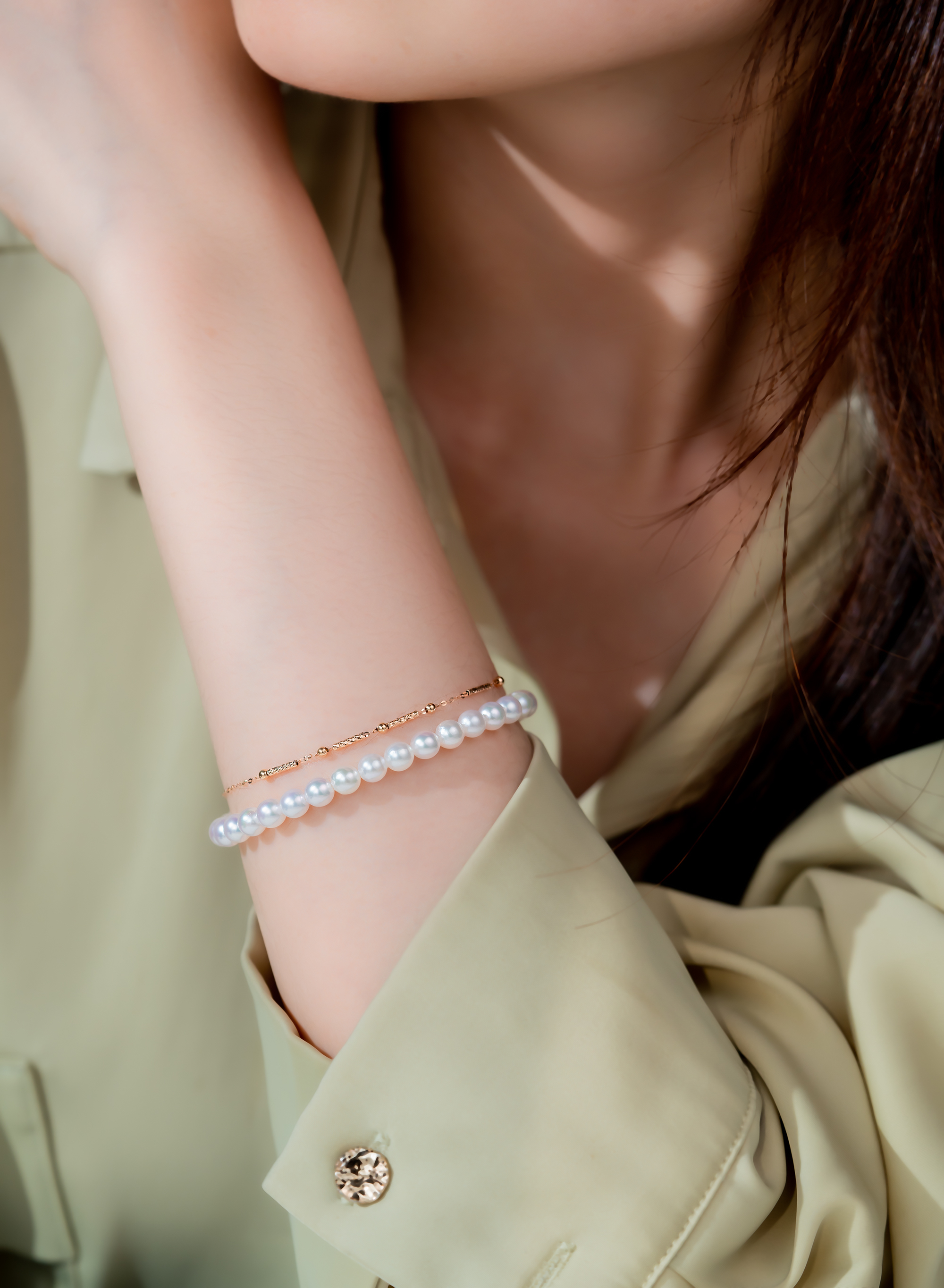 這款連鏈手鏈讓佩戴者不再為選擇珍珠或18K玫瑰金而煩惱,能夠一次擁有珍珠和18K玫瑰金的美感。結合了全Akoya珍珠手鏈和18K玫瑰金手鏈,呈現出一種高貴優雅的氛圍。18K玫瑰金手鏈以金車花管串連而成,令整條手鏈變得精緻高雅。而Akoya珍珠的色調和18K玫瑰金的色澤互相映襯,更顯得低調奢華。