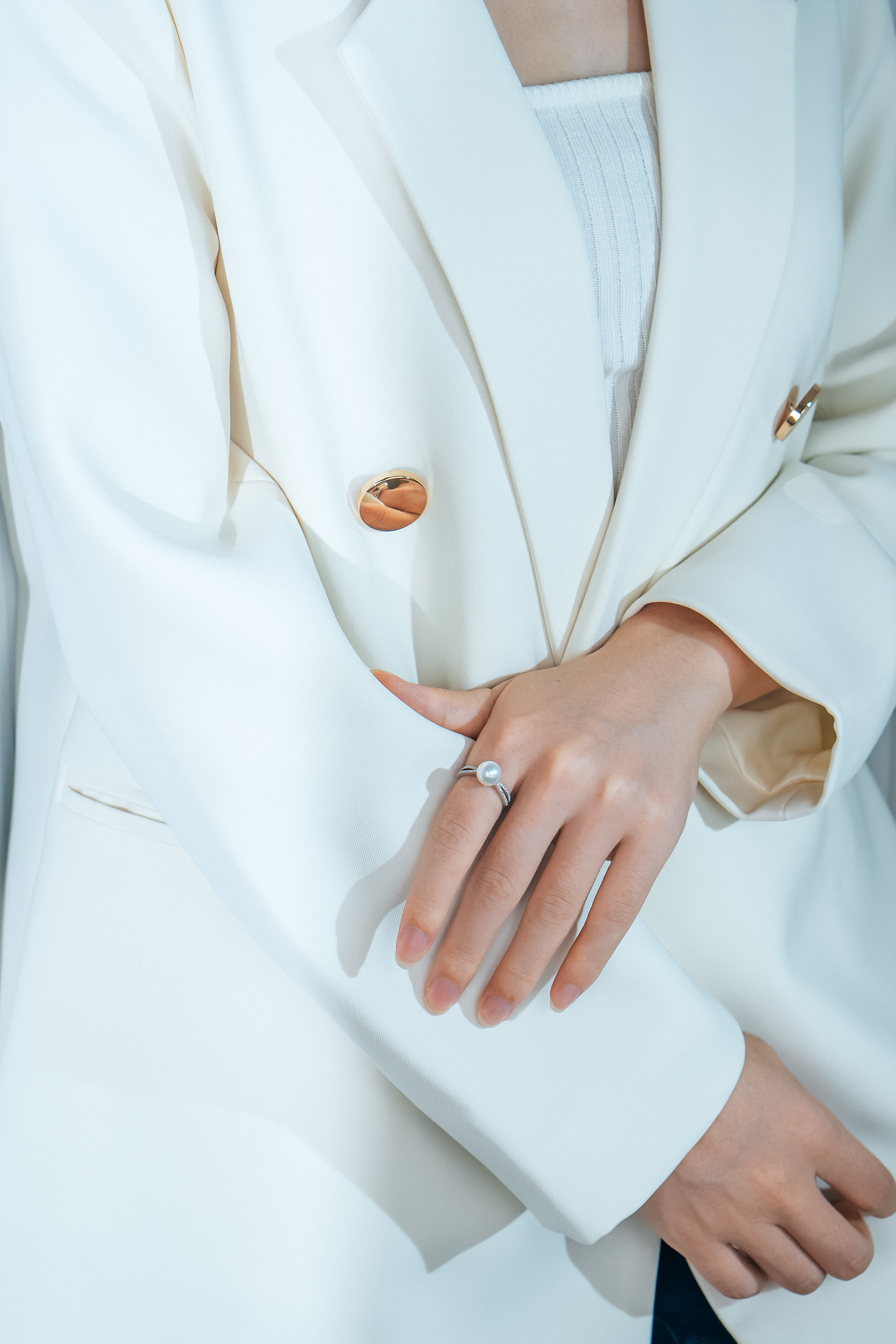這款18K白金戒指以中央迷人的Akoya珍珠為亮點,宛如一顆閃耀的明珠,散發出誘人的光芒。而兩側則巧妙地鑲嵌著兩列閃爍璀璨的碎鑽,如同點點星光,營造出令人驚艷的華麗細節。獨特的雙層設計讓這款戒指與眾不同,不僅展現出時尚的個性,更為你的手指帶來層次感。這種戴上多重疊戒的效果讓你的指尖散發出時尚的魅力,無論是日常搭配還是特殊場合,都能成為你的亮點。