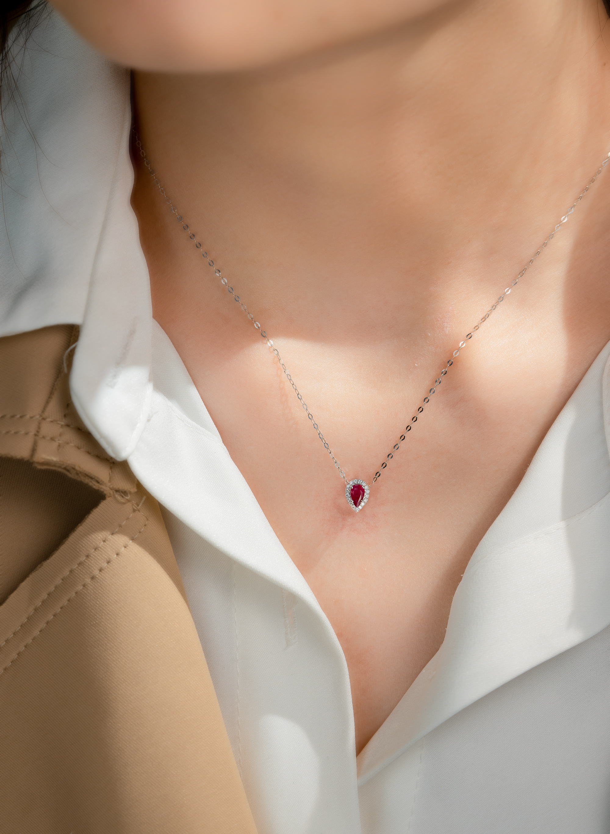 華貴的水滴形紅寶石,散發着如鴿血紅般的火彩。以一圈白碎鑽包圍,兩者結合起來所呈現的色才更是會讓人愛不釋手。紅色的剛烈與珍珠柔潤相互平衡。在選配對珍珠的時候,特意挑選帶粉紅伴色、光澤極強的Akoya珍珠,讓整體呈現出一個高貴、低調奢華的感覺。