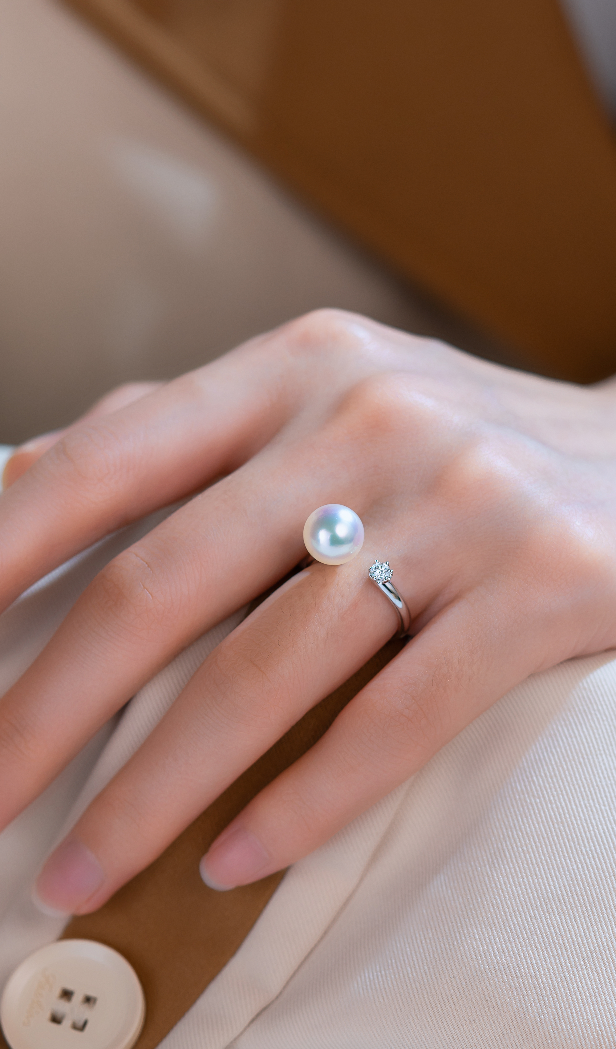 This minimalist open-ended ring showcases a unique Akoya hue, radiating a serene and captivating luster.