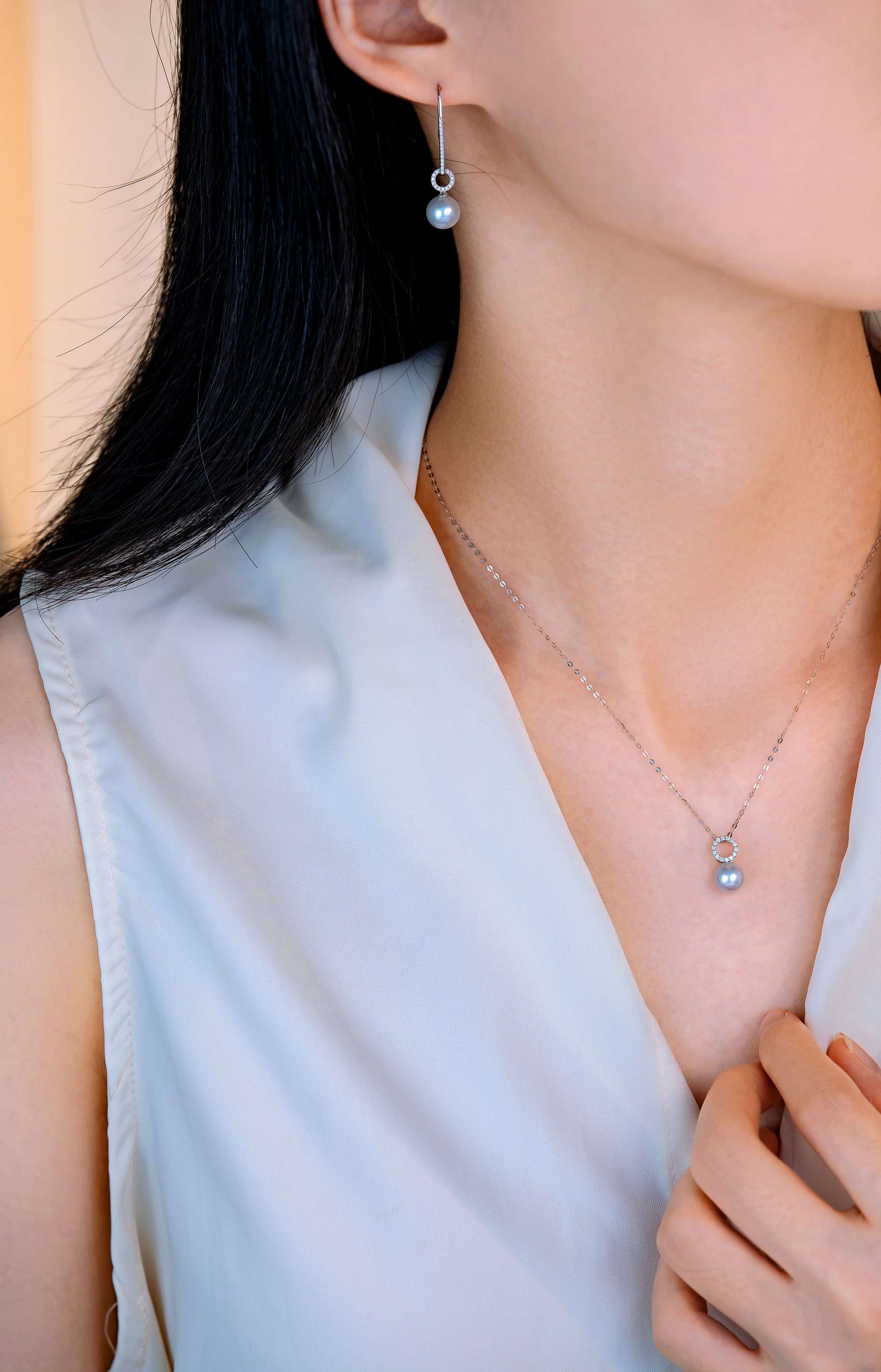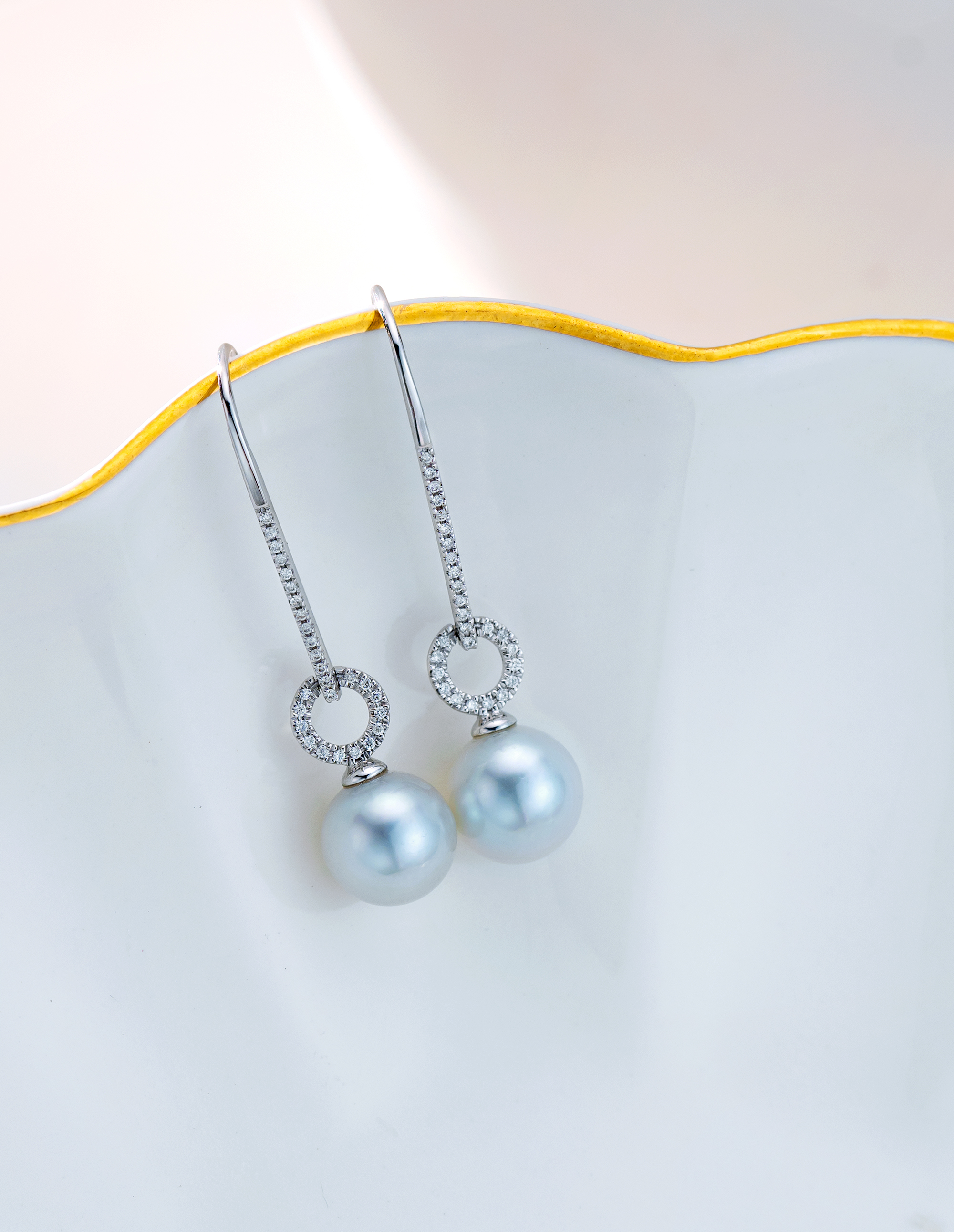 The fusion of silver-blue Akoya pearls and 18K white gold creates a mysterious and cool vibe. The long, dangling earrings, accompanied by a vibrant 7.5-8mm silver-blue Akoya pearl, exude an enchanting allure. The halo elements add an air of nobility and elegance, captivating all who encounter them.