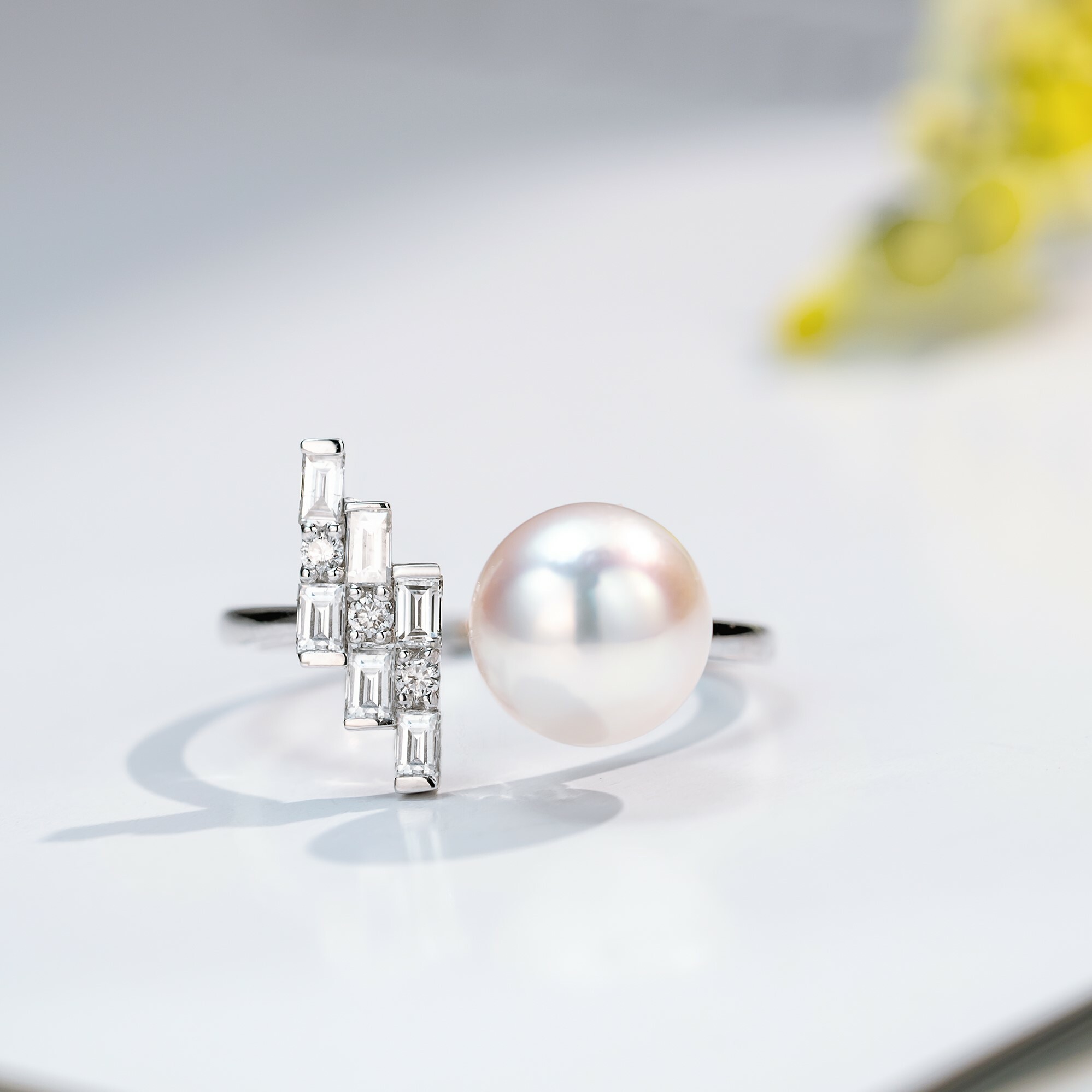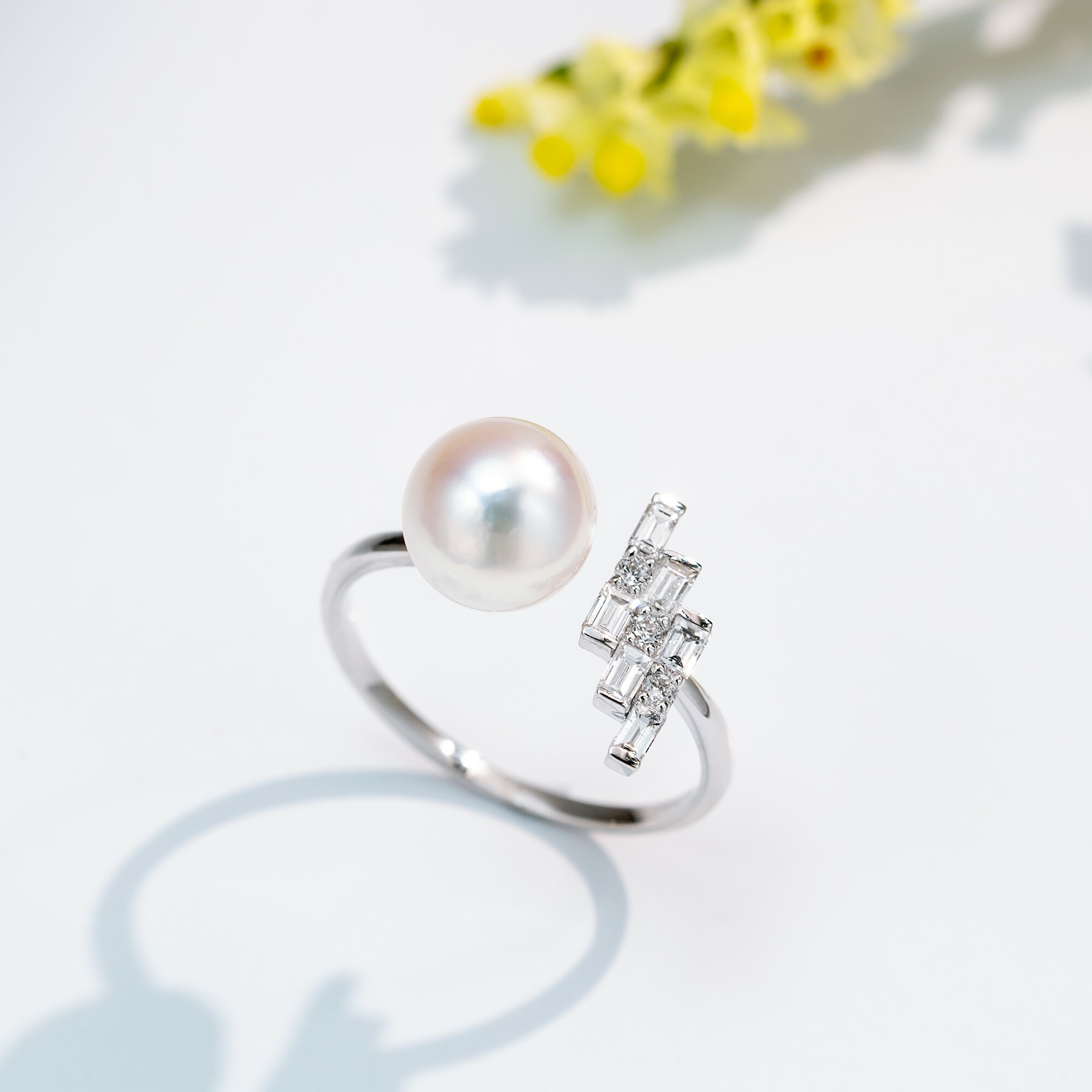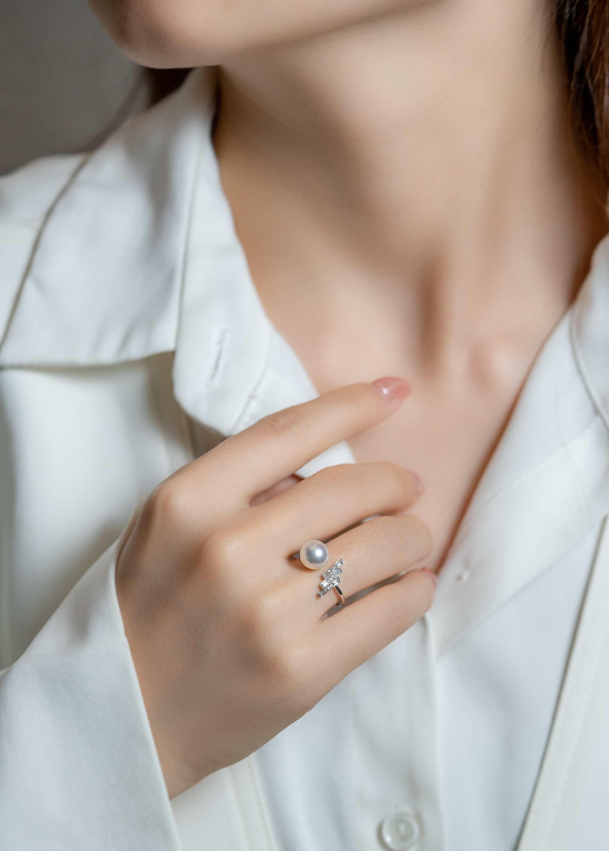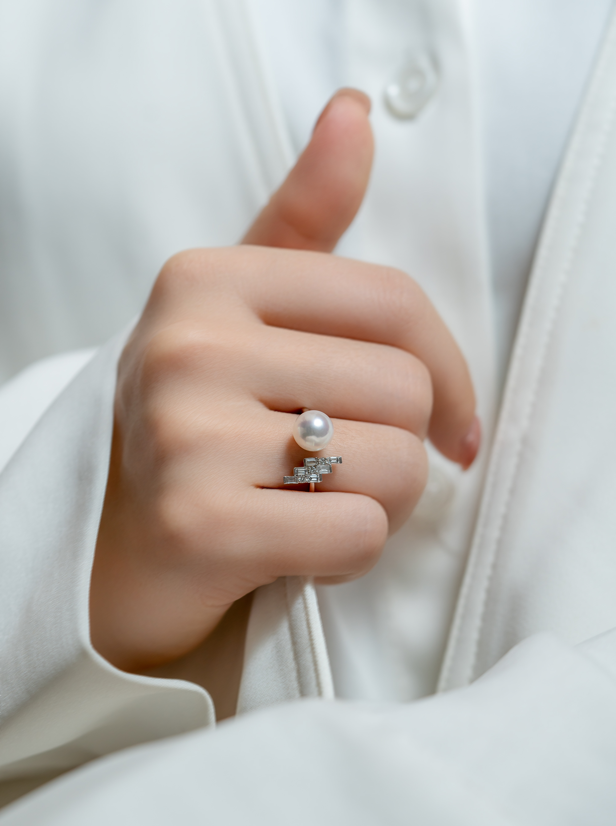 由三塊長條型的18K白金組合成的階梯,鑲嵌著3顆鑽石作為點綴,設計簡約卻不顯平凡。筆直的線條配搭上渾圓的7.5mm-8mm的Akoya,形成了鮮明的對比,卻又能在型格與優雅之中取得平衡。這款戒指配上任何穿搭,都能駕馭得游刃有餘。