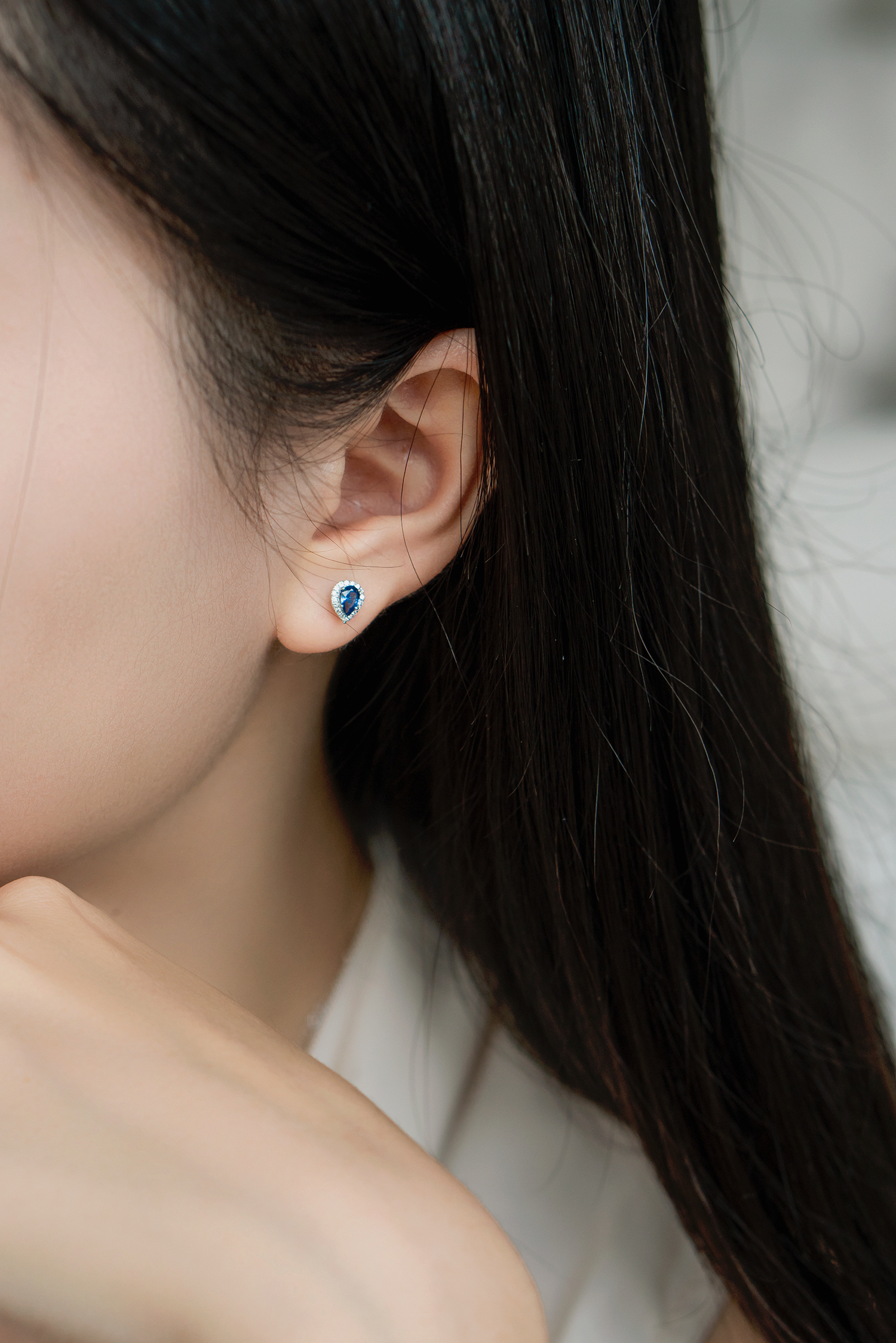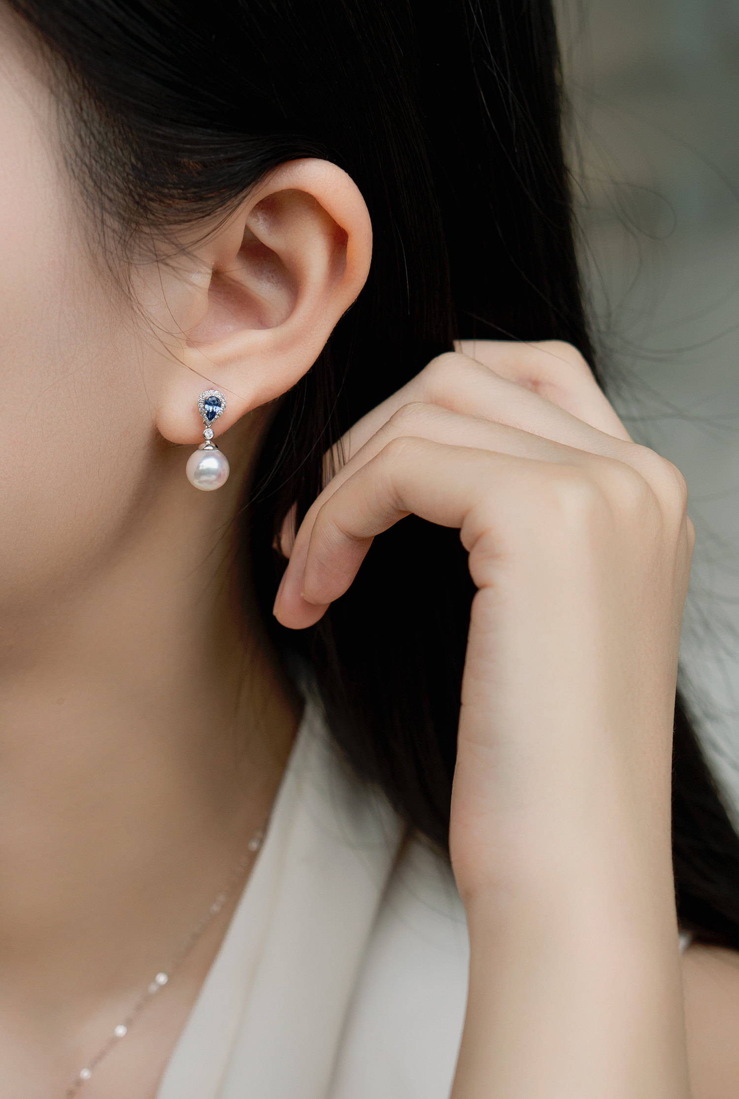 湛藍的水滴形藍寶石以一圈白碎鑽包圍著,寶石的柔美線條與圓潤的Akoya相互輝映,小巧玲瓏的藍寶石在鑽石包圍之中低調閃耀,日本Akoya 輕柔擺動,亦顯得端莊卻活潑,我們在物色配搭藍寶石的Akoya時也費了小心思,特意挑選微粉伴色中間有白/藍彩光的,如此經典的設計使佩戴者盡顯雍容華貴,是低調奢華之選,試上後或者耳朵也會醉了。