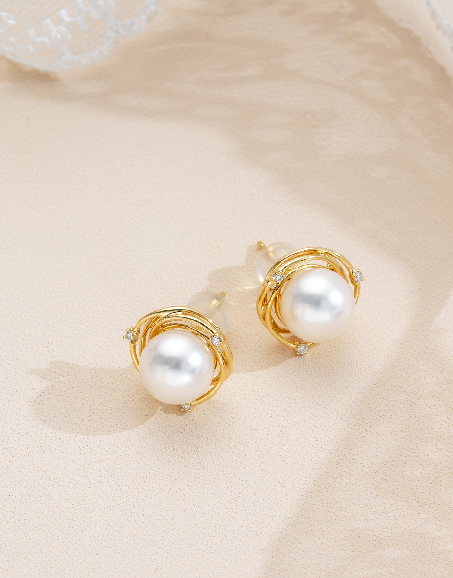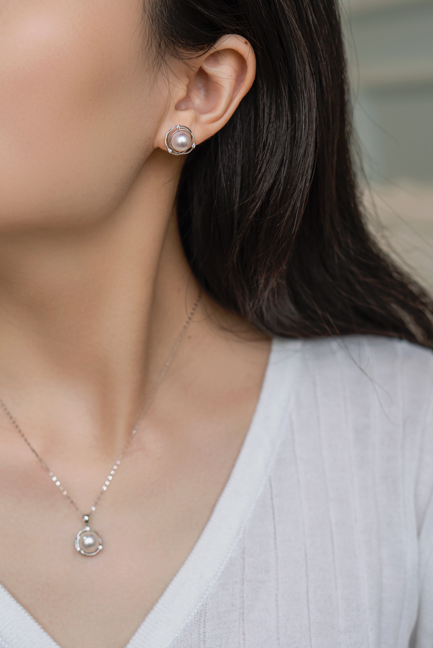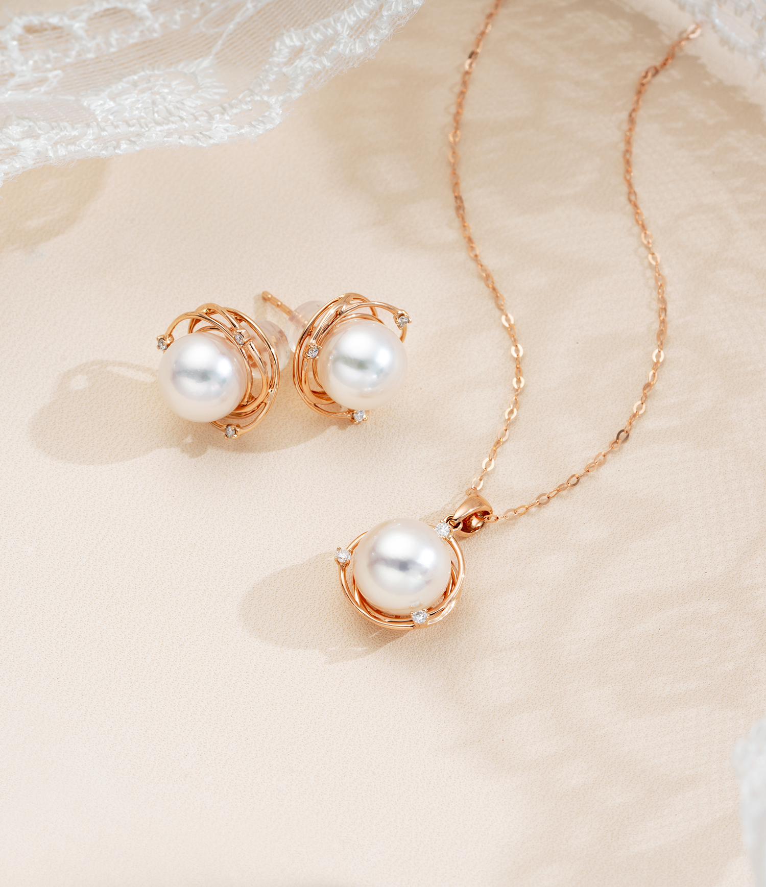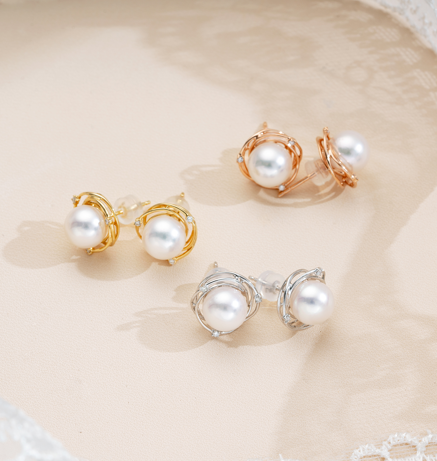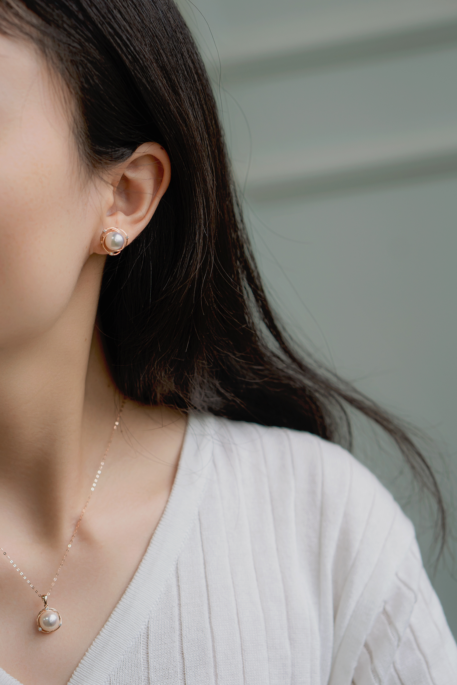 立體巧妙的玫瑰花環造型,大氣簡約又不失華貴,外圈多層18k金 環形線條鑲嵌着三顆精緻鑽石,猶如雨後露珠晶瑩閃耀地襯托着玫瑰花形設計,更襯托出Akoya珍珠的絢麗多姿。