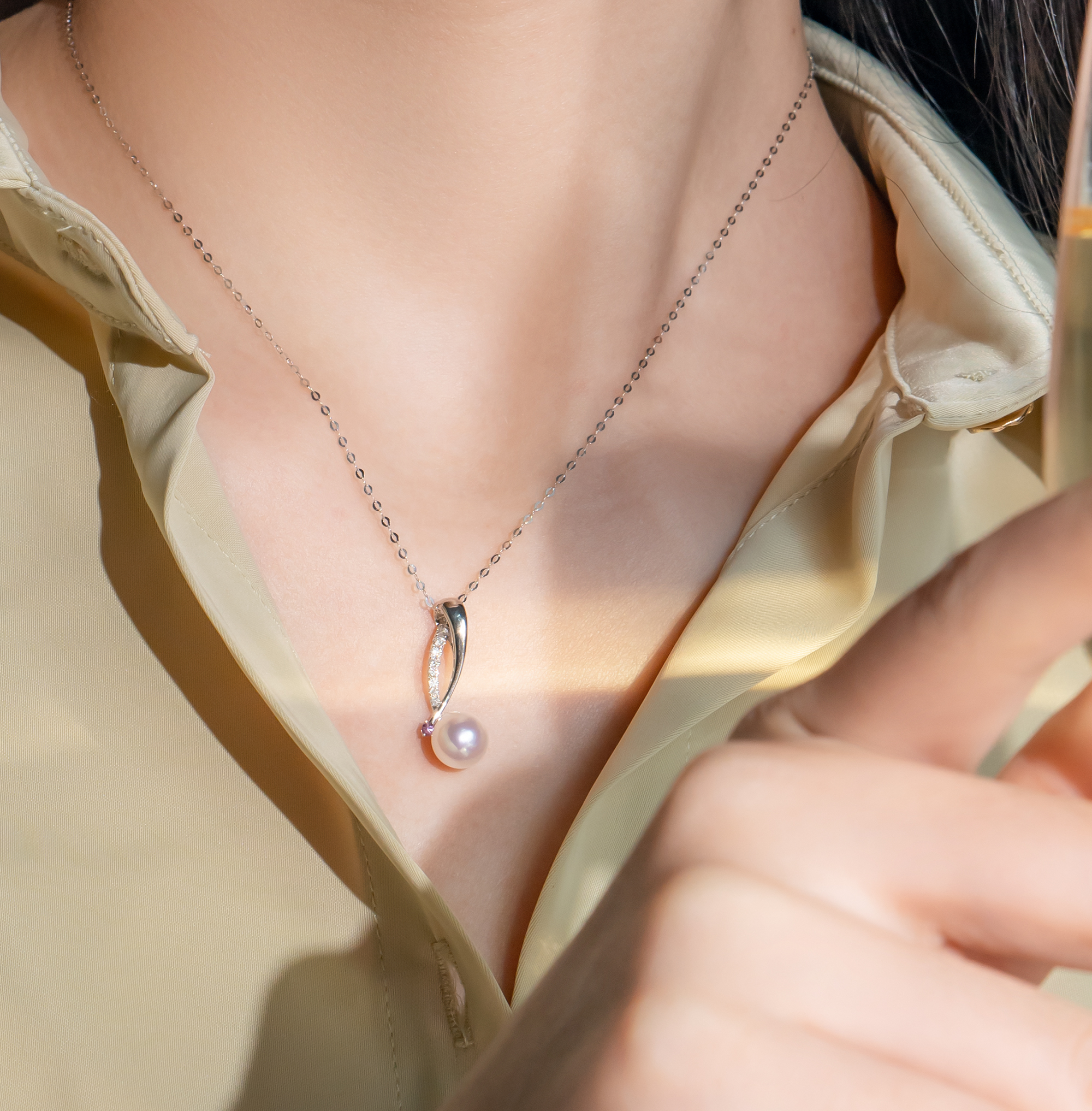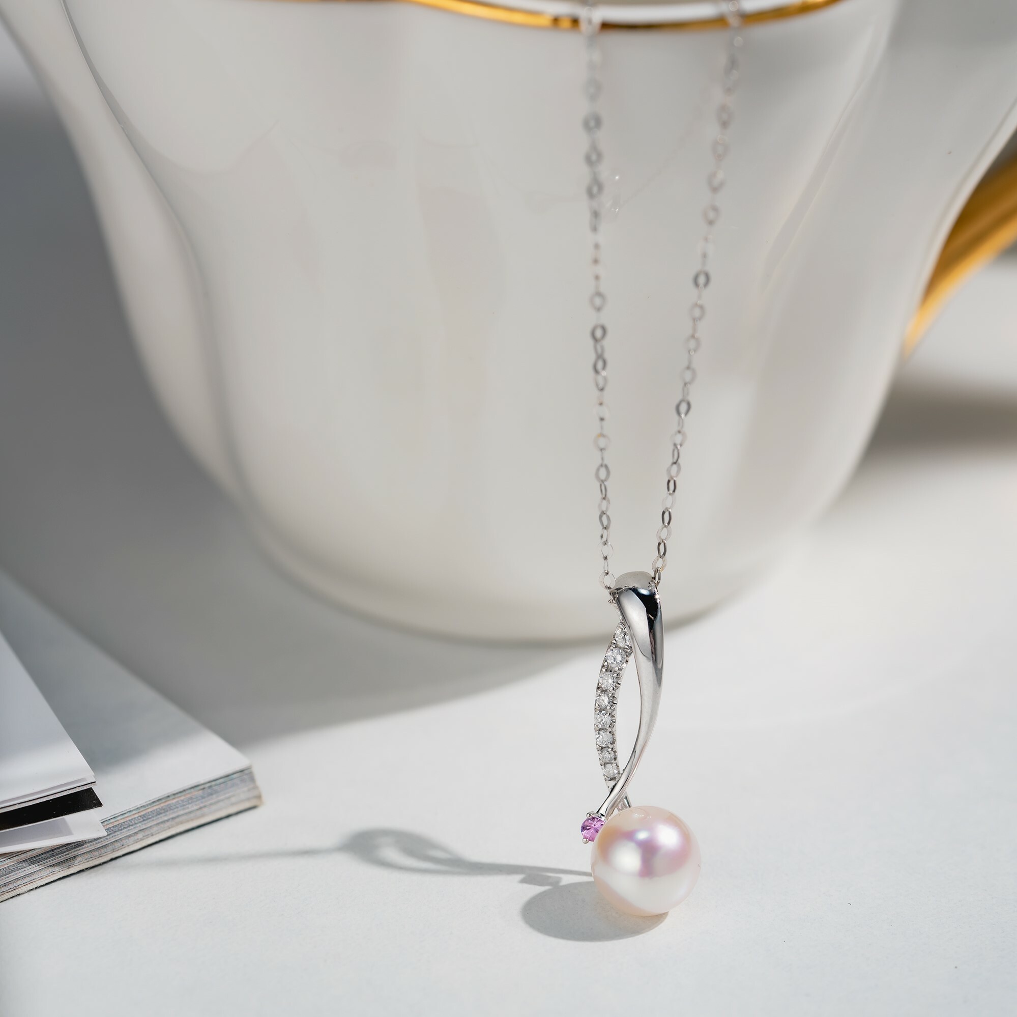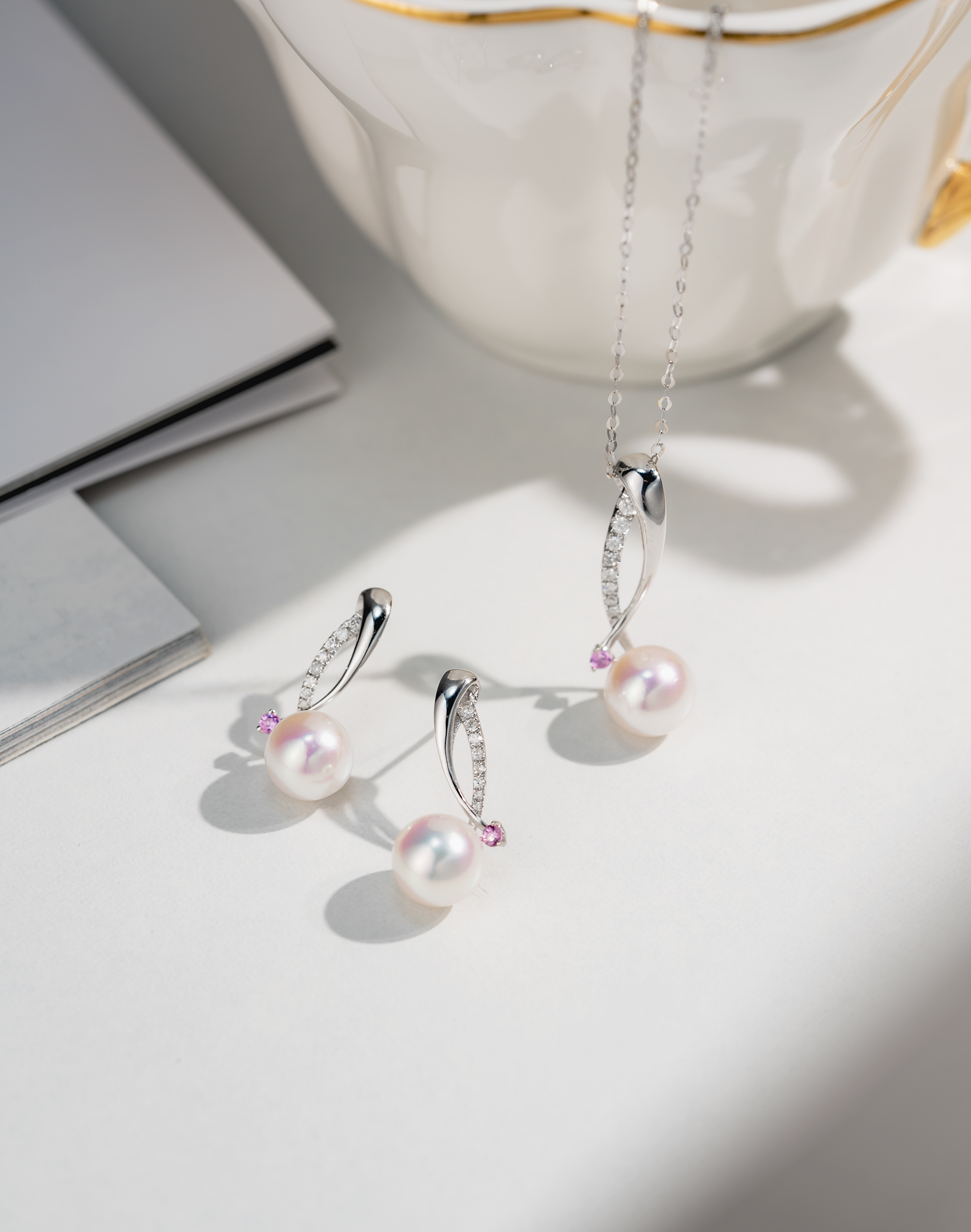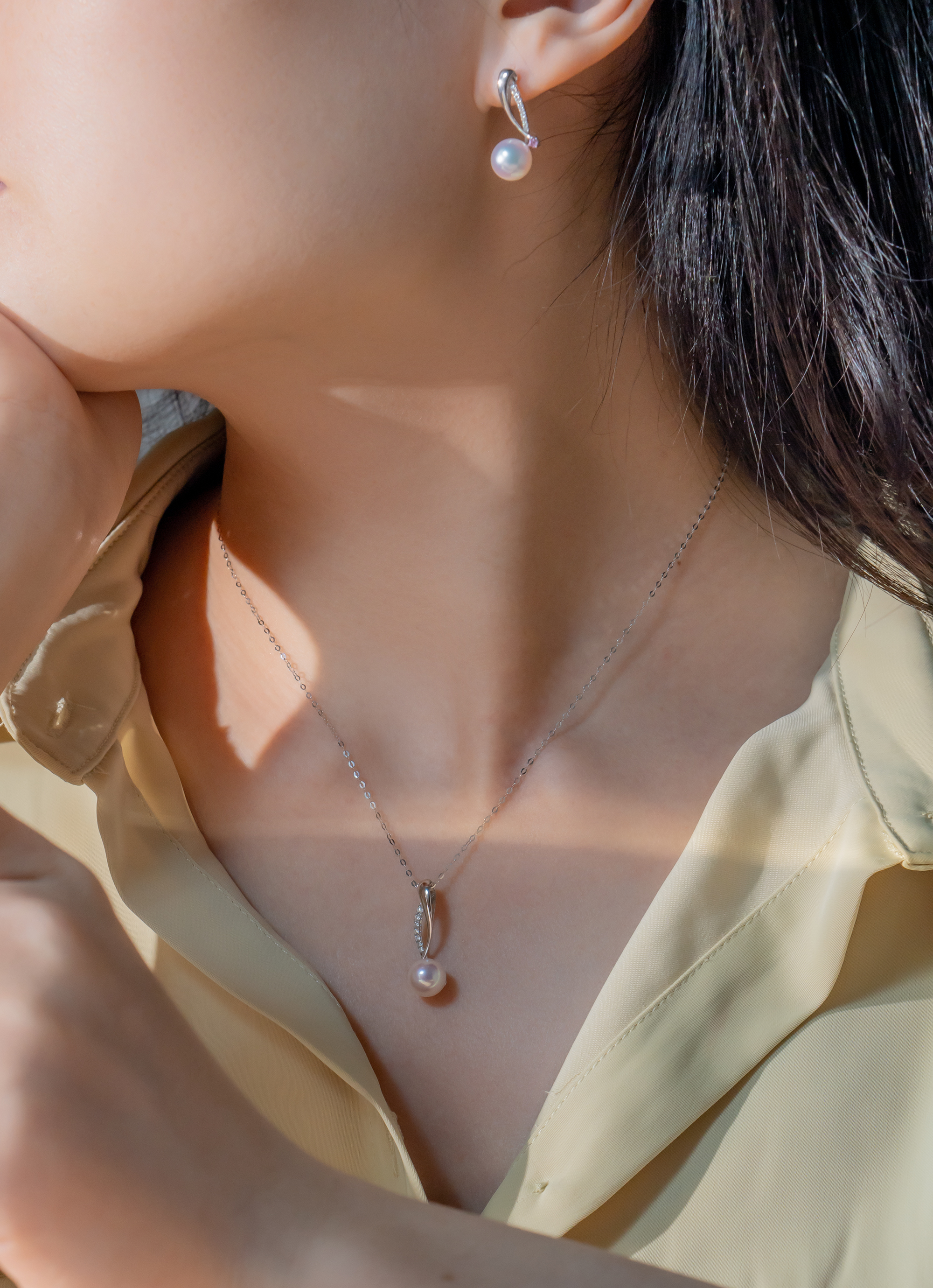 18K金的獨特流線型設計,配以閃爍動人的鑽石為點綴,簡約中不失優雅。加上滿滿少女心的粉色藍寶石襯托,使Akoya珍珠自身發出的粉色極光提升到另一個極致,在陽光底下更散發著讓人無法忘懷的光芒。整個吊墜/耳環的設計閃亮唯美卻不覺浮誇,是所有知性女性的不二之選。