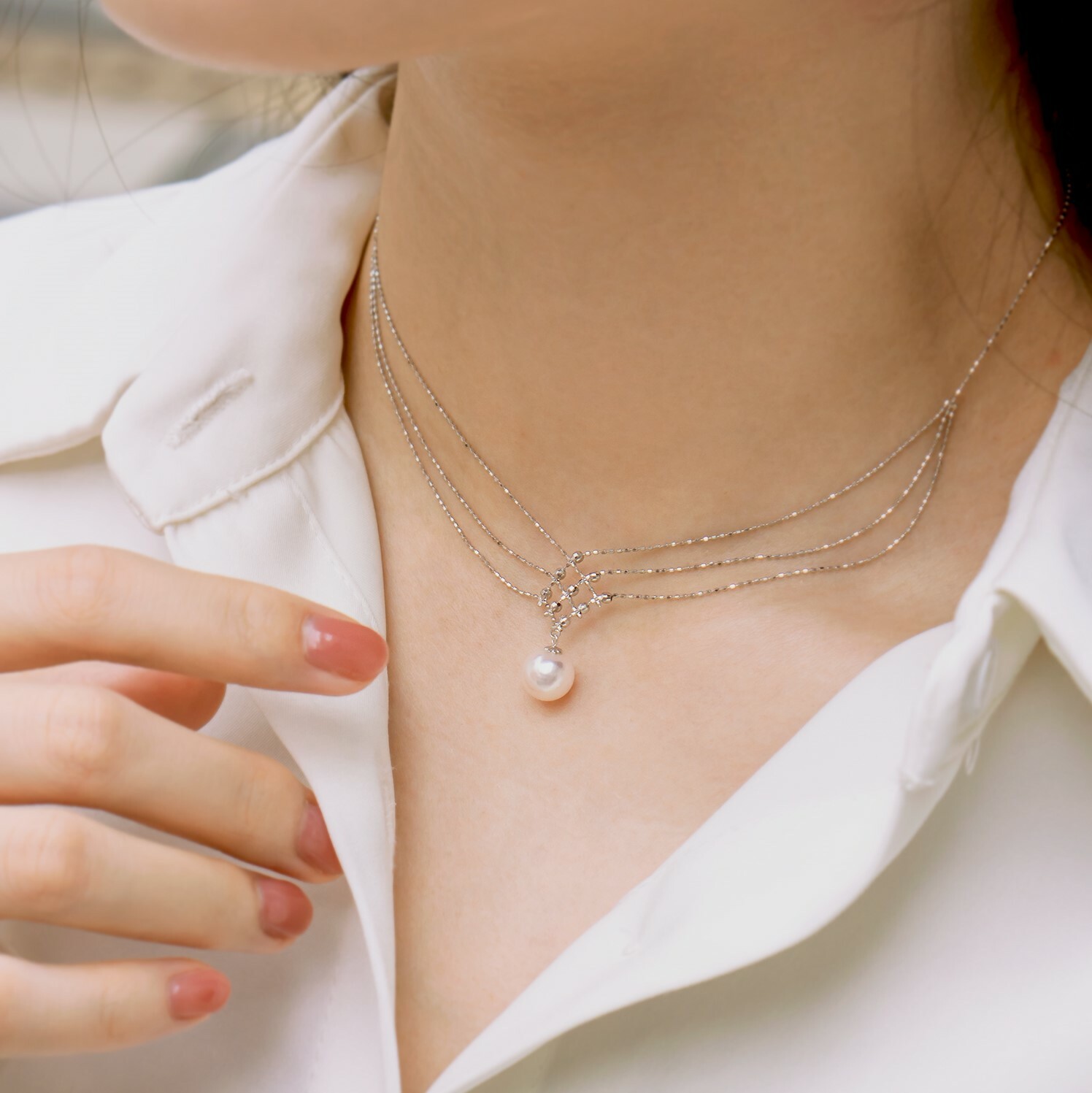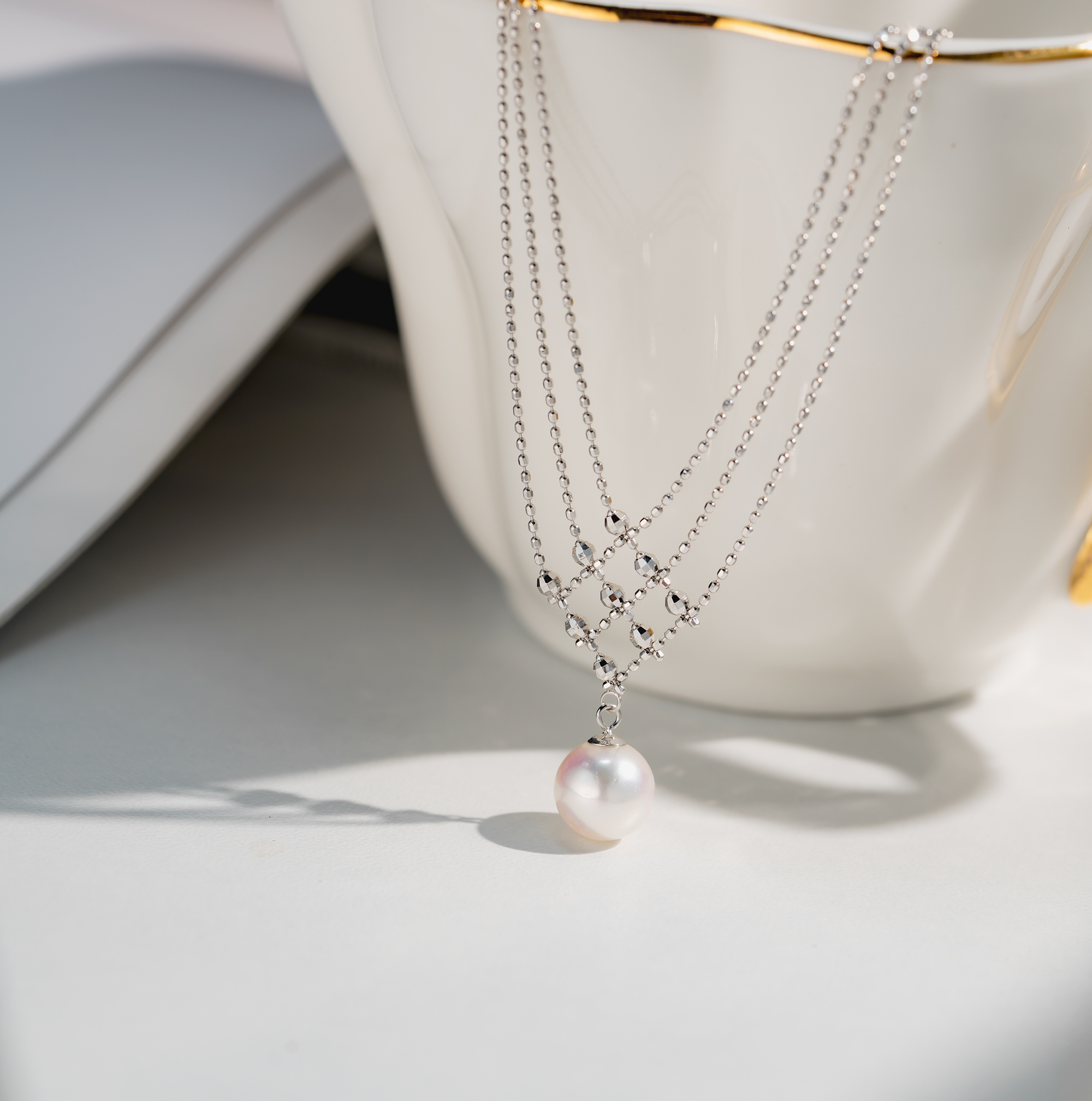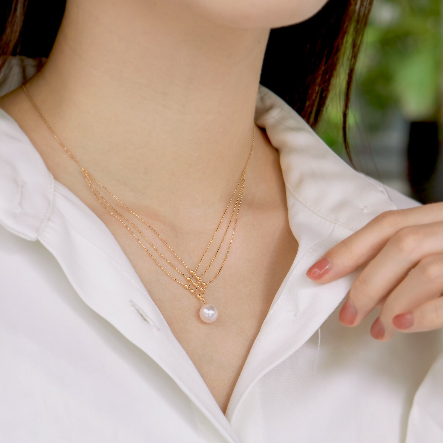 全18K金項鍊以唯美的線條交織出純潔的感覺,在燈光下K金小珠子巧妙地反射出閃爍奪目效果,再鑲上最頂級鏡面Akoya 日本珍珠,讓你在任何場合都能給人留下閃耀動人的深刻回憶!