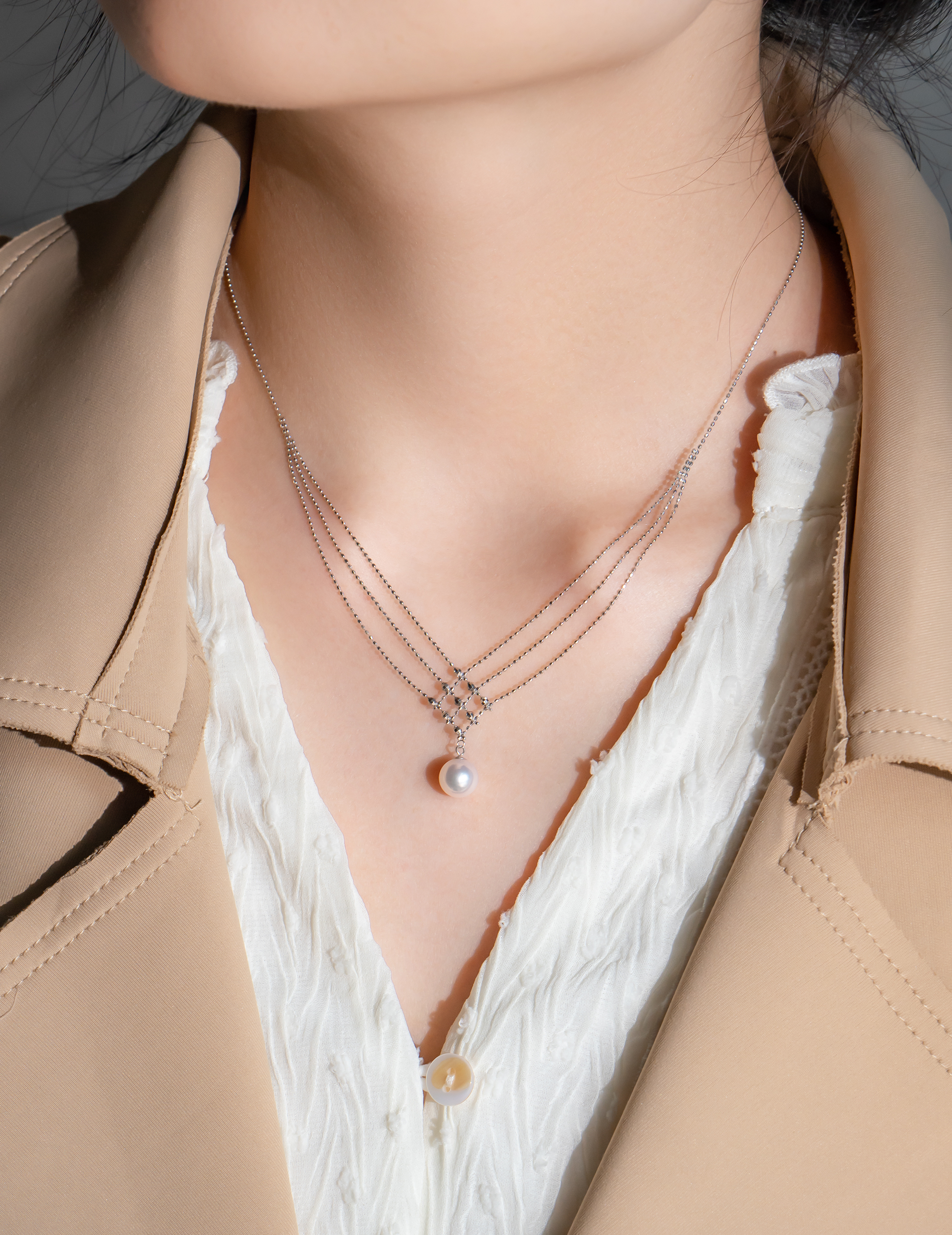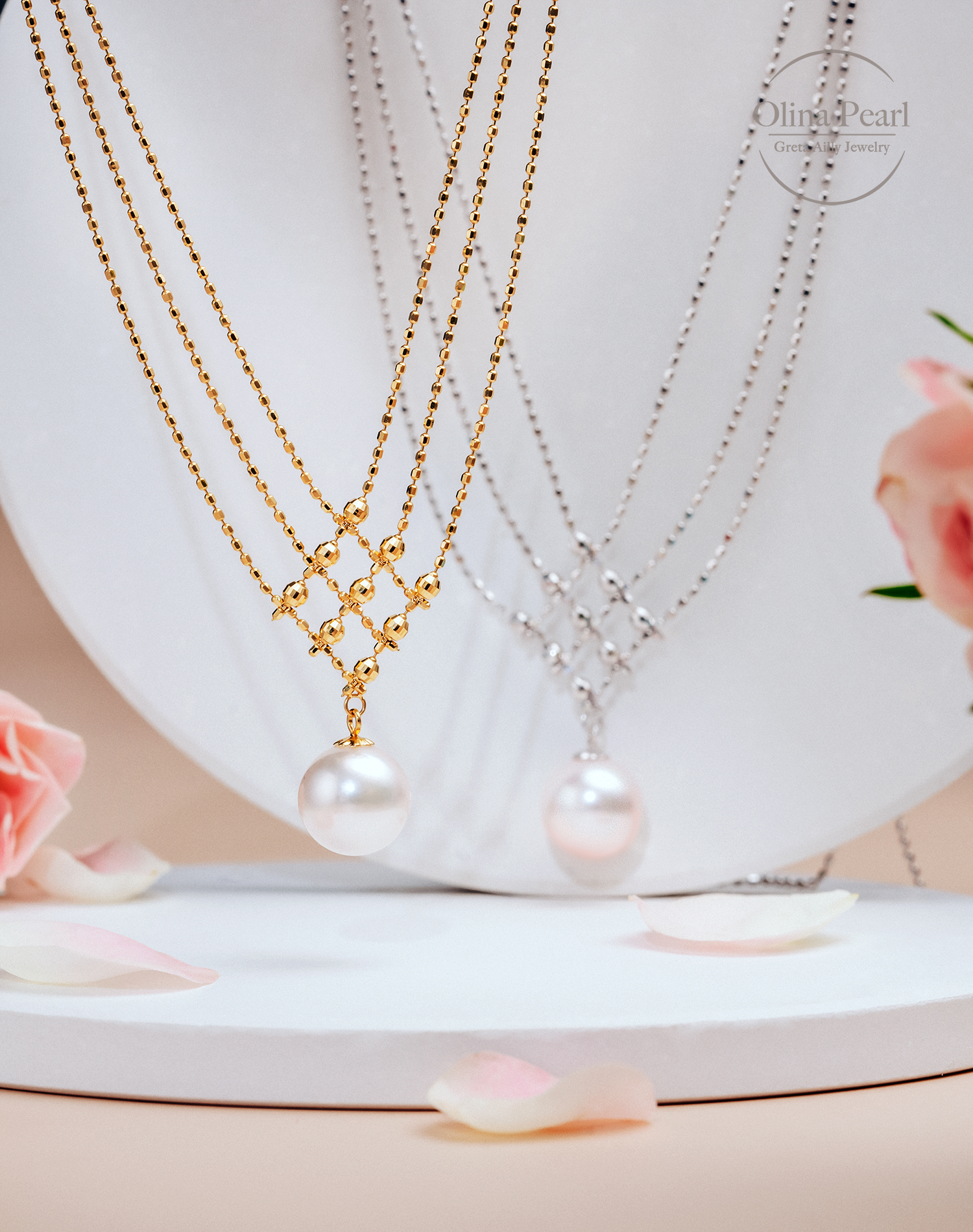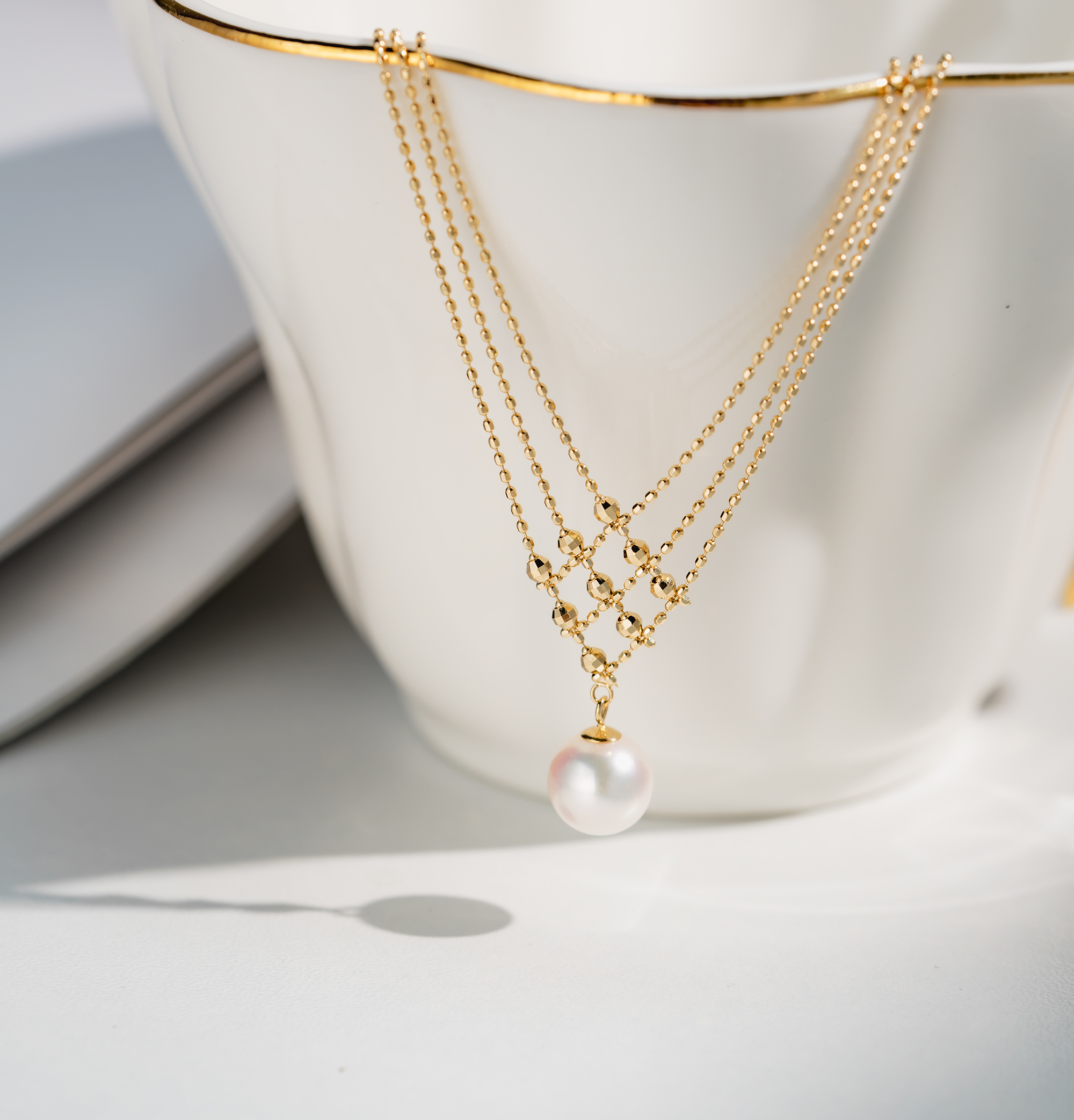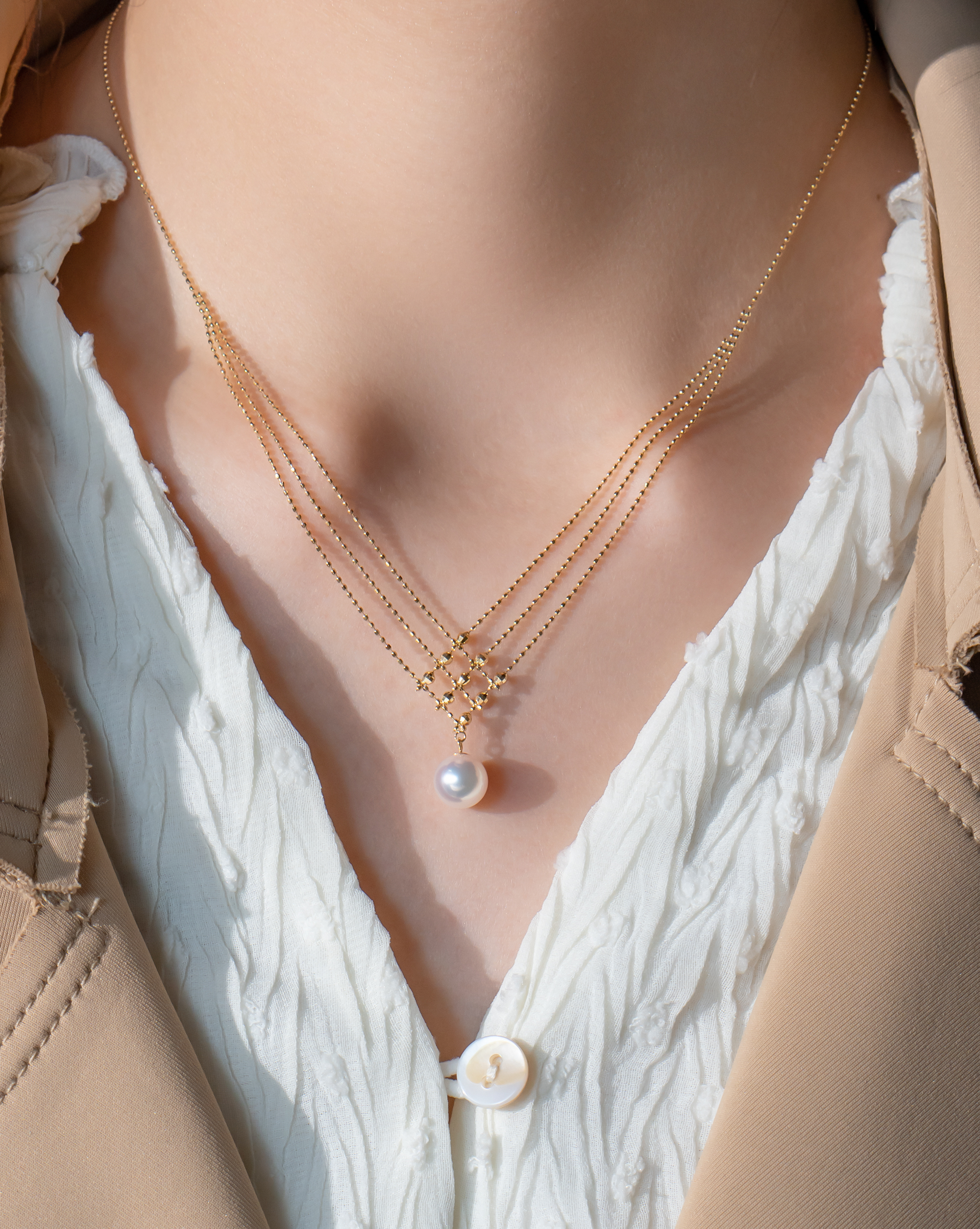 全18K金項鍊以唯美的線條交織出純潔的感覺,在燈光下K金小珠子巧妙地反射出閃爍奪目效果,再鑲上最頂級鏡面Akoya 日本珍珠,讓你在任何場合都能給人留下閃耀動人的深刻回憶!