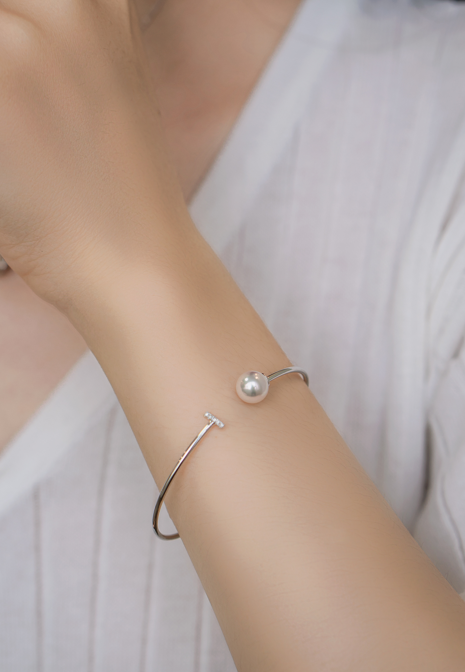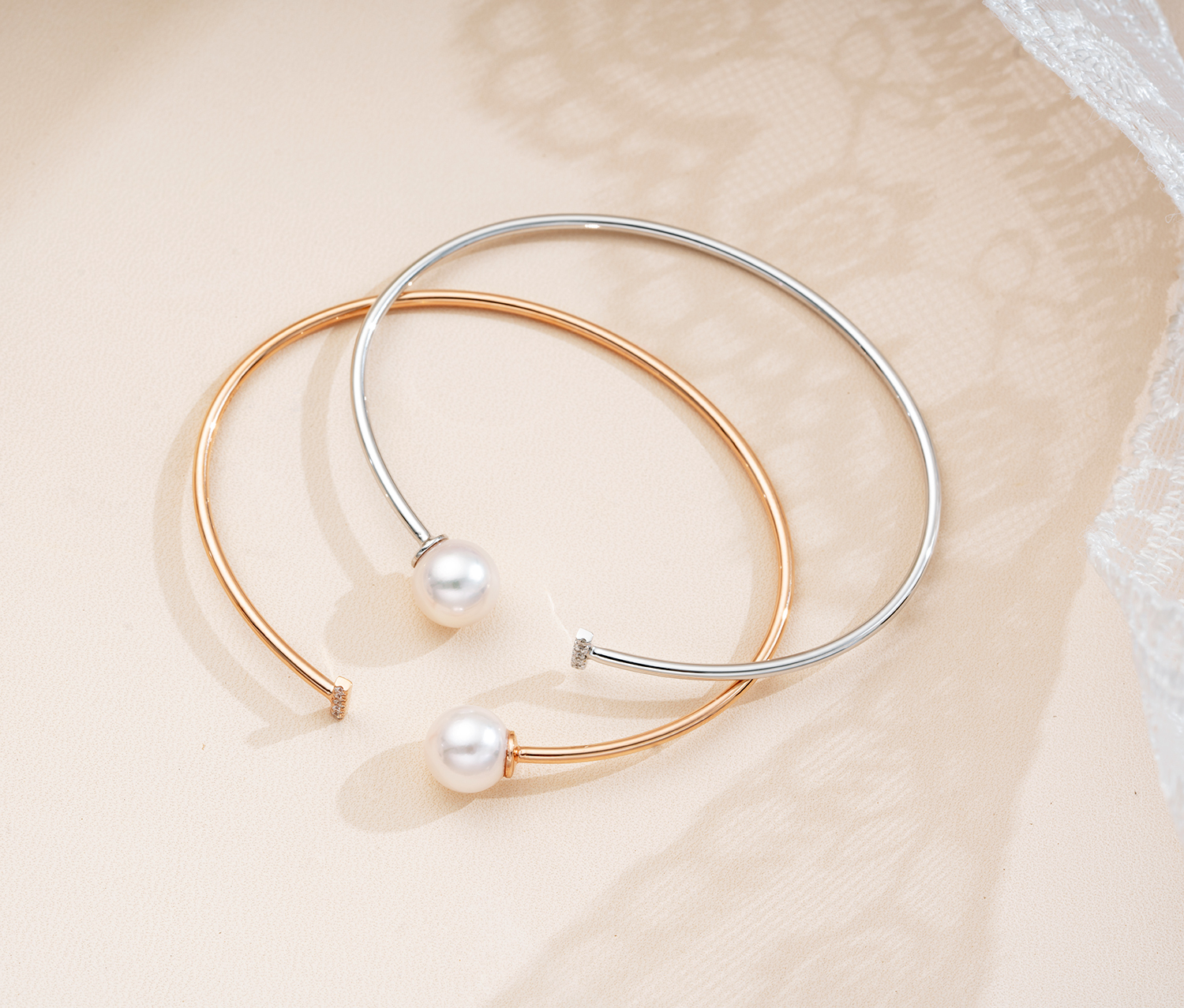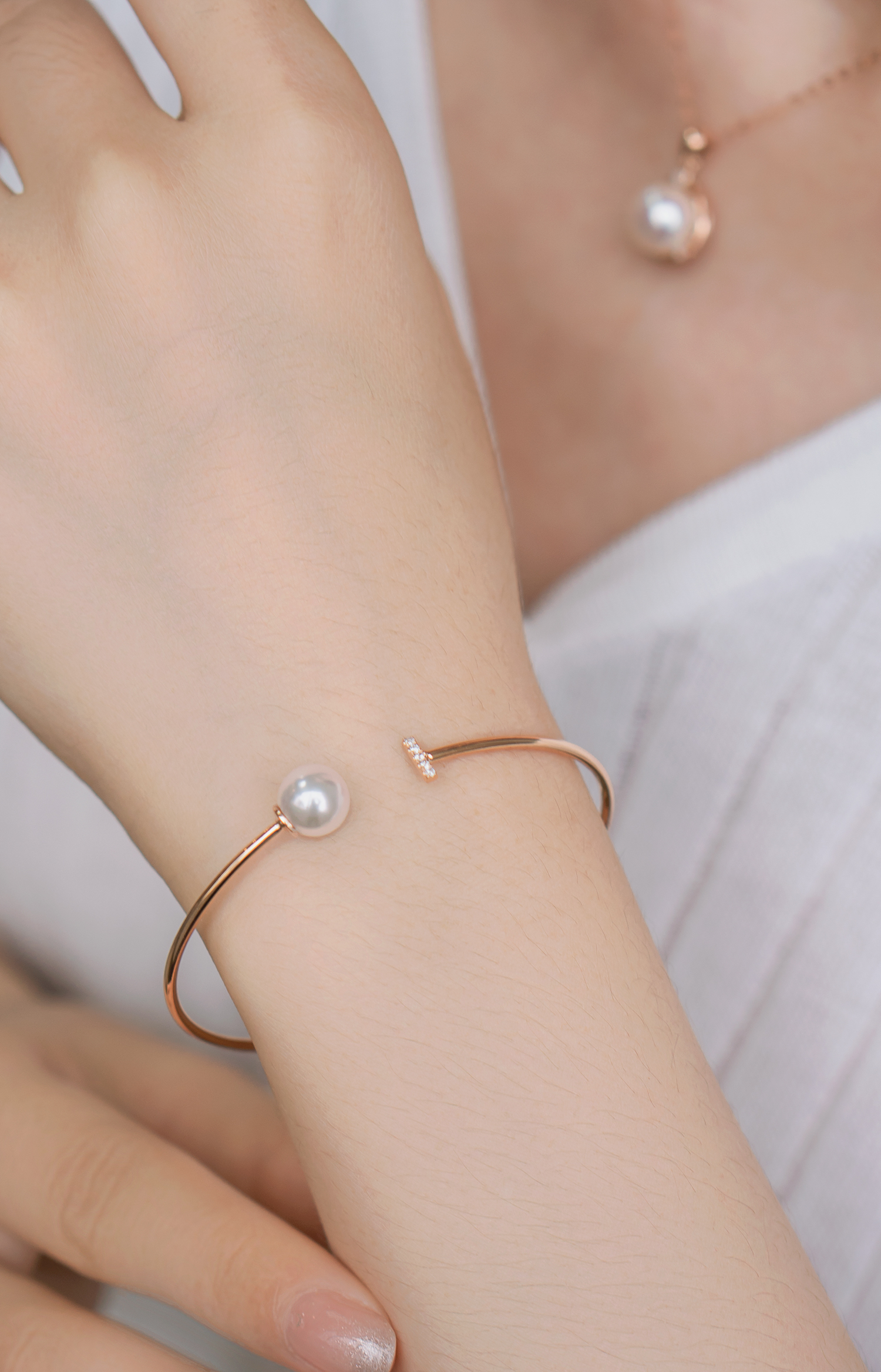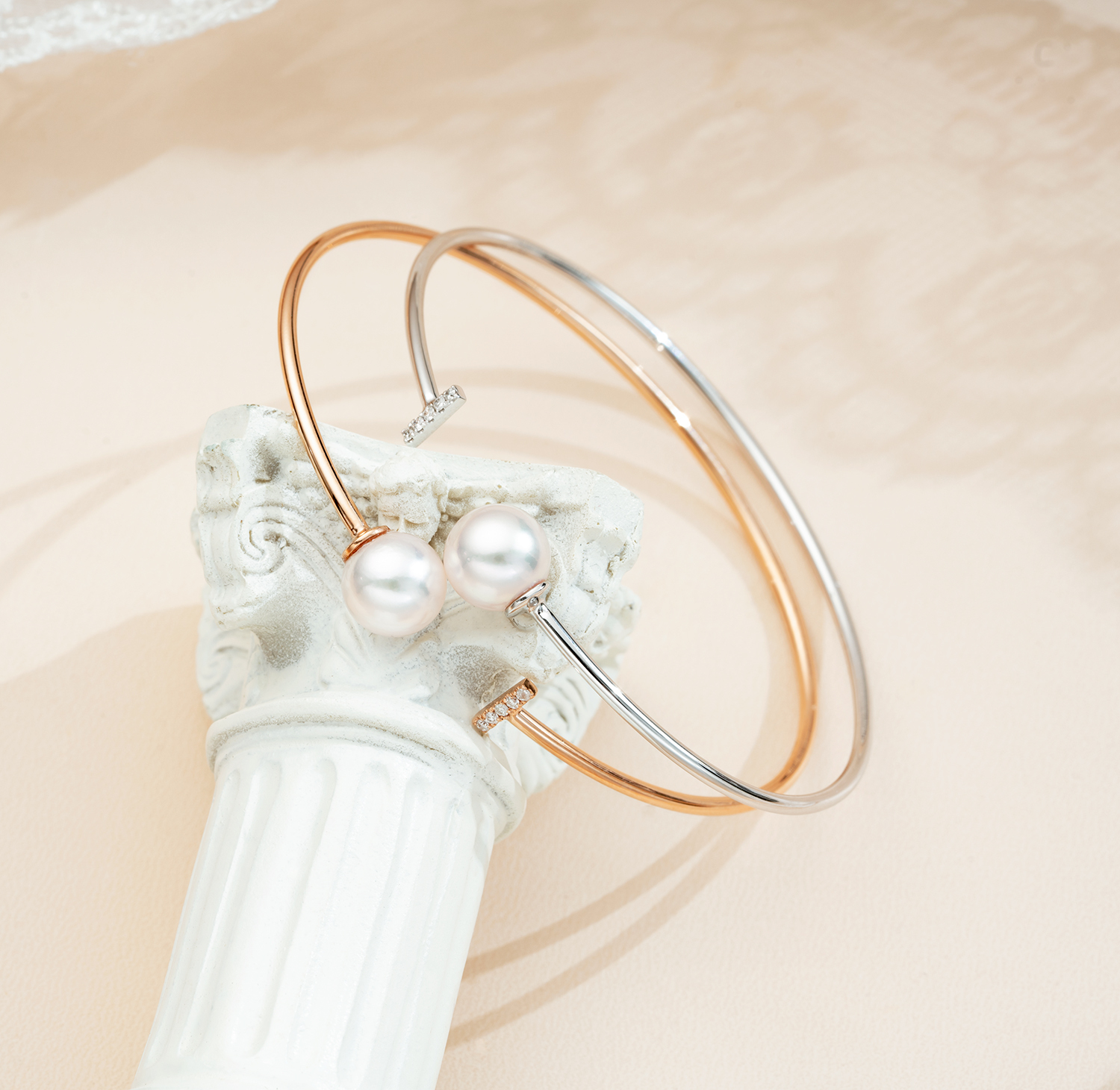 手鐲部分選用18K金記憶材質,物料輕盈,穿戴舒適,經典開口造型設計,使得手鐲佩戴時顯得不再生硬,8-8.5mm Akoya珍珠搭配閃爍鑽石展現出簡約而精緻之美,突顯Akoya的靈動閃耀,絕對是日常百搭之選。