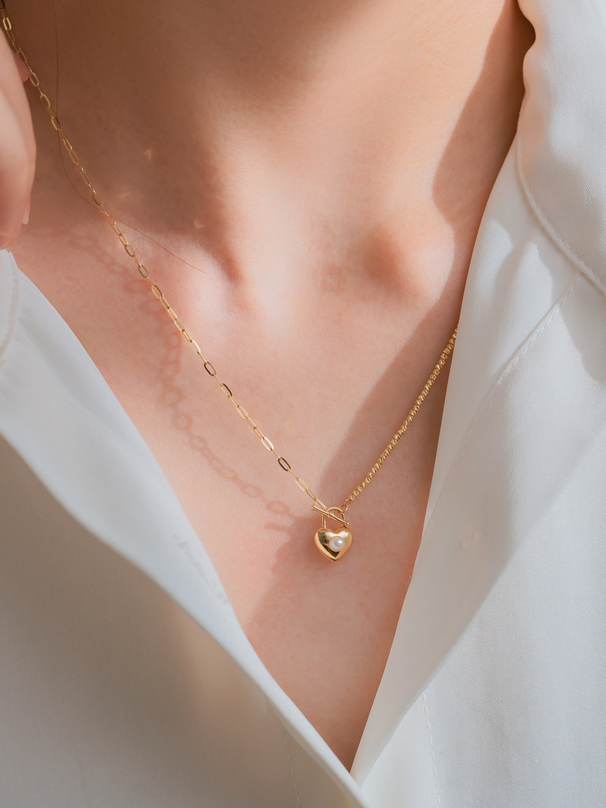 精選小巧的日本Baby Akoya,以心型鎖的造型呈現展示出愛的真諦。精巧的鎖片點綴著溫柔的珍珠,綻放出光芒與生命力之外,更加能凸顯出女性的專屬美感。頸鏈部份把兩種不同元素的一鏈設計結合,在原本較溫柔可愛的心形所設計上加添一點型格。