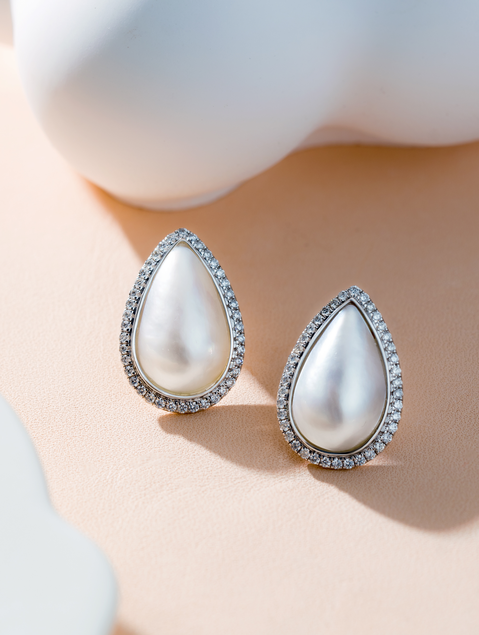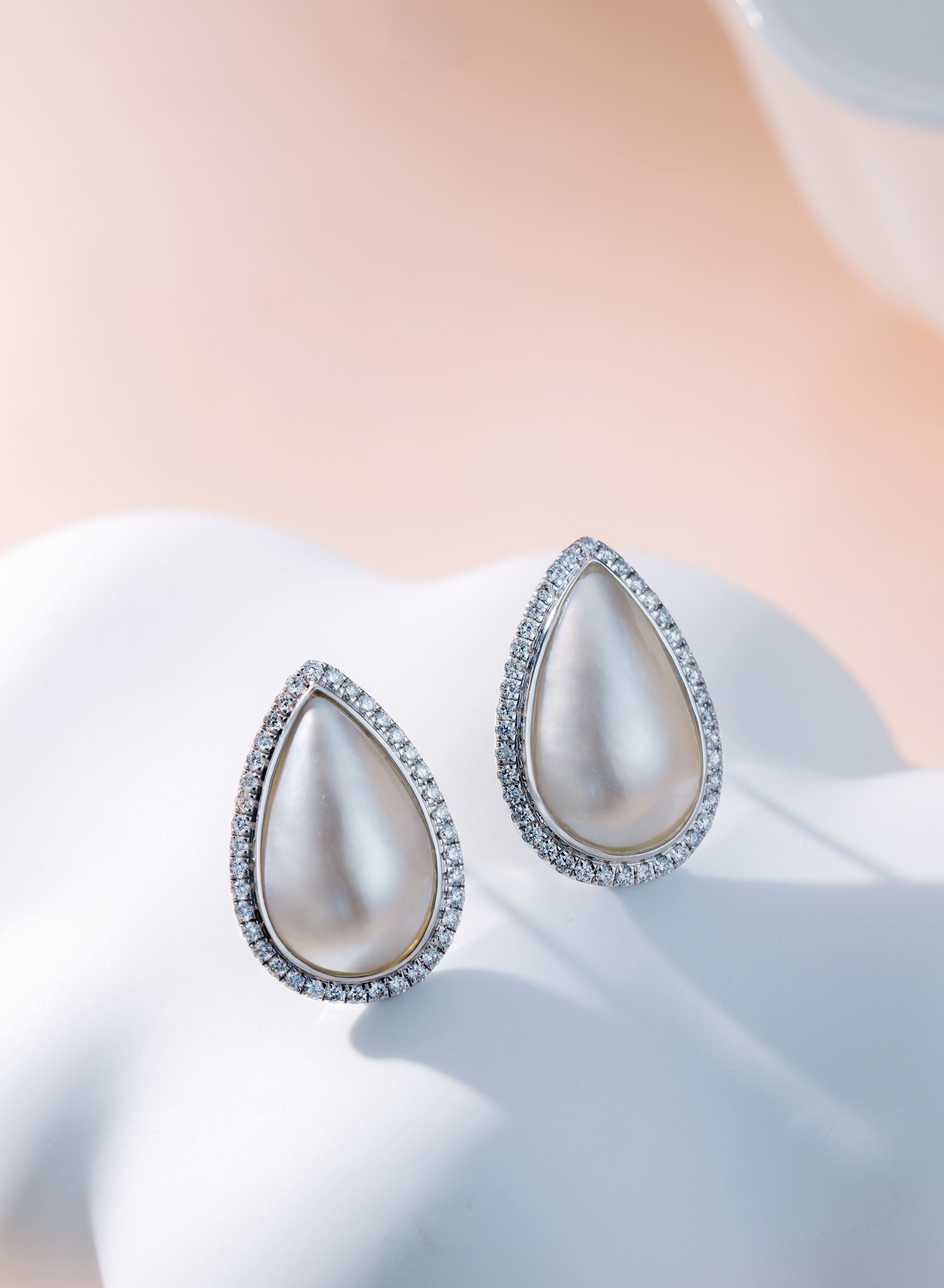 The size of Mabe Pearls has given them an inherent vintage look. Southsea cultured Mabe Pearls have natural silvery gray body color with silky skin and strong mirror effect. Embraced with a halo of diamonds to create a subtle yet classy look.