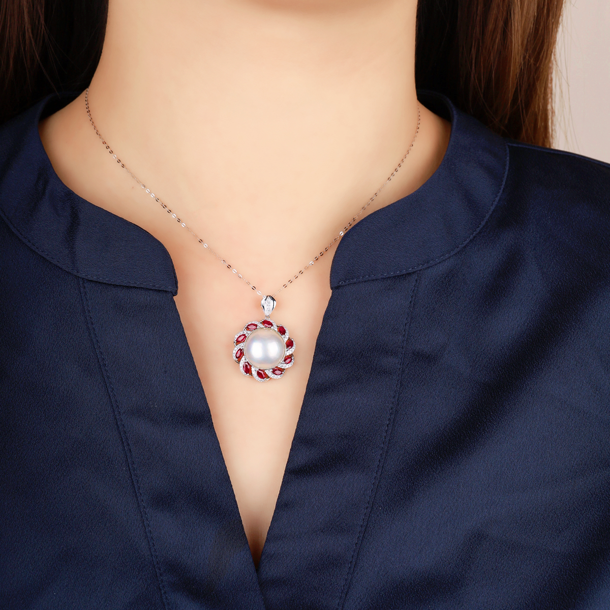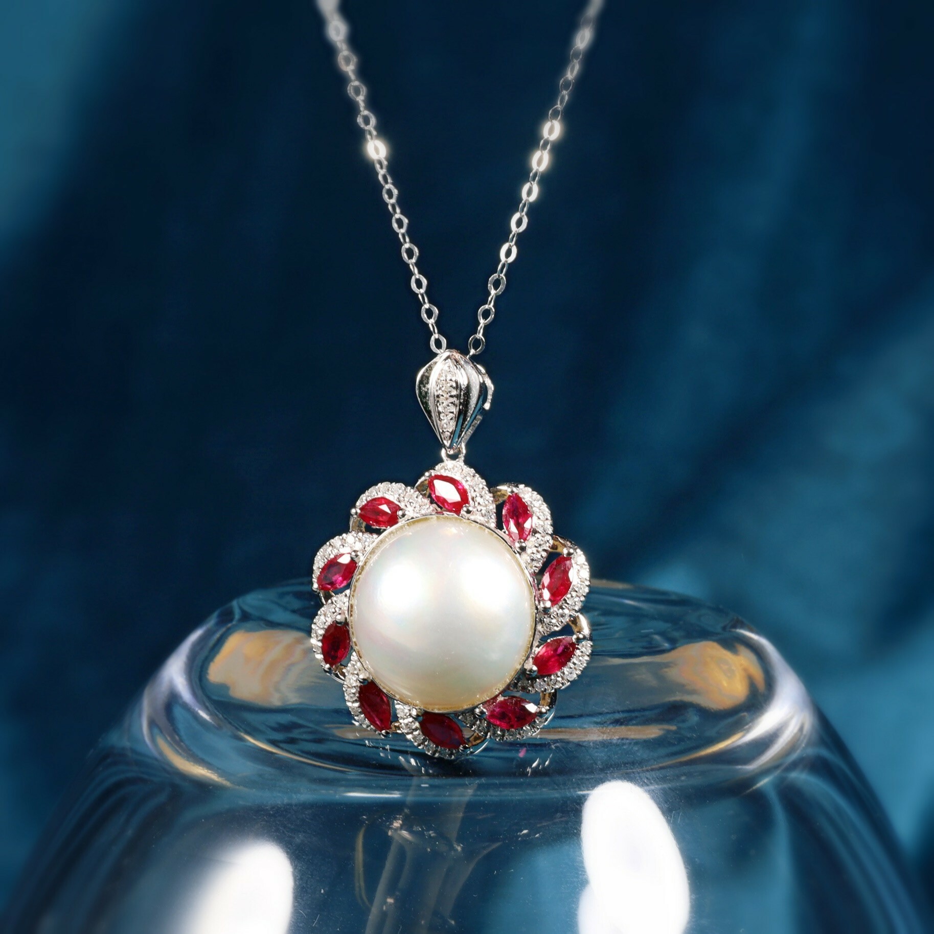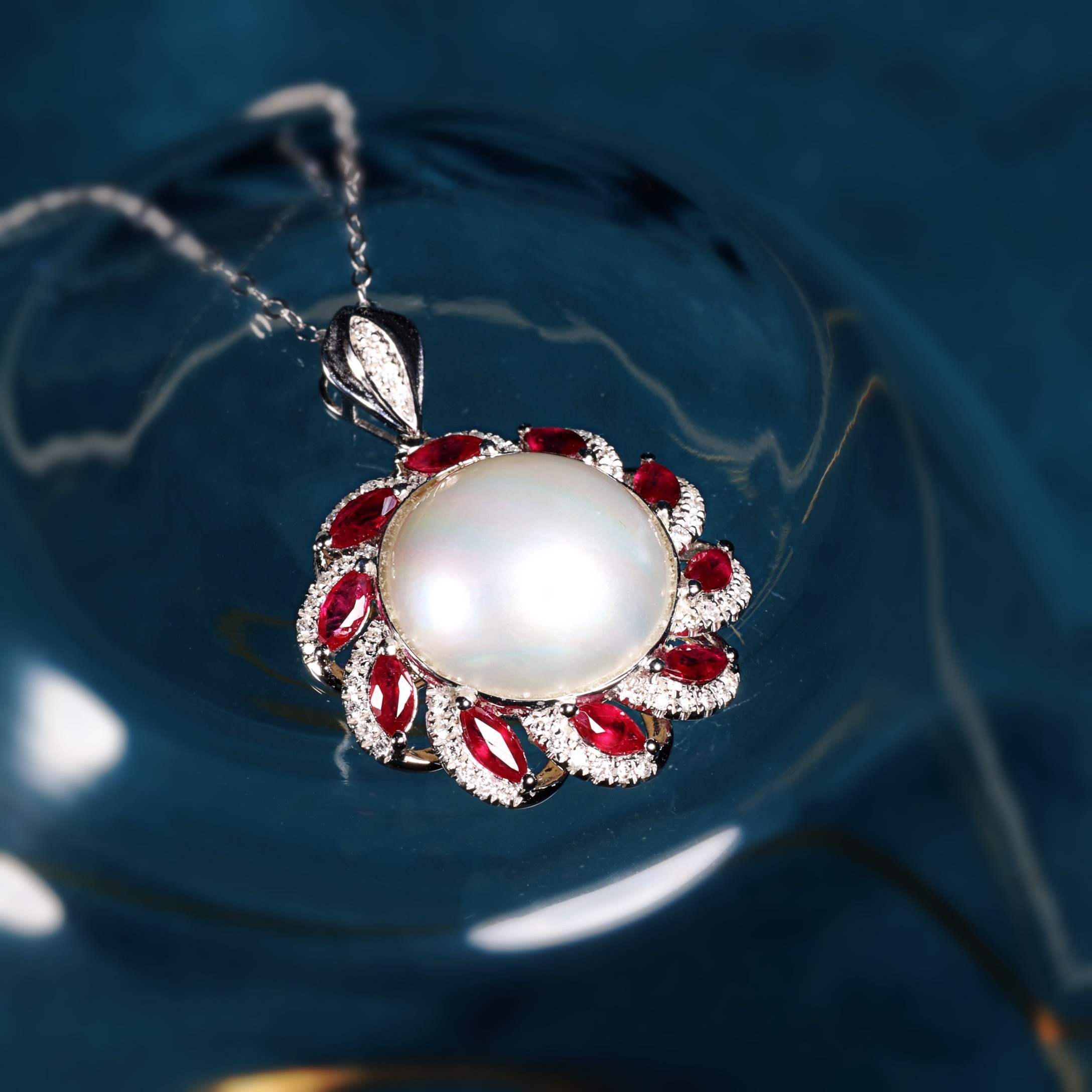 這款吊墜以優雅的馬貝珍珠和紅寶石為主,營造出一朵絢爛的花朵形狀。