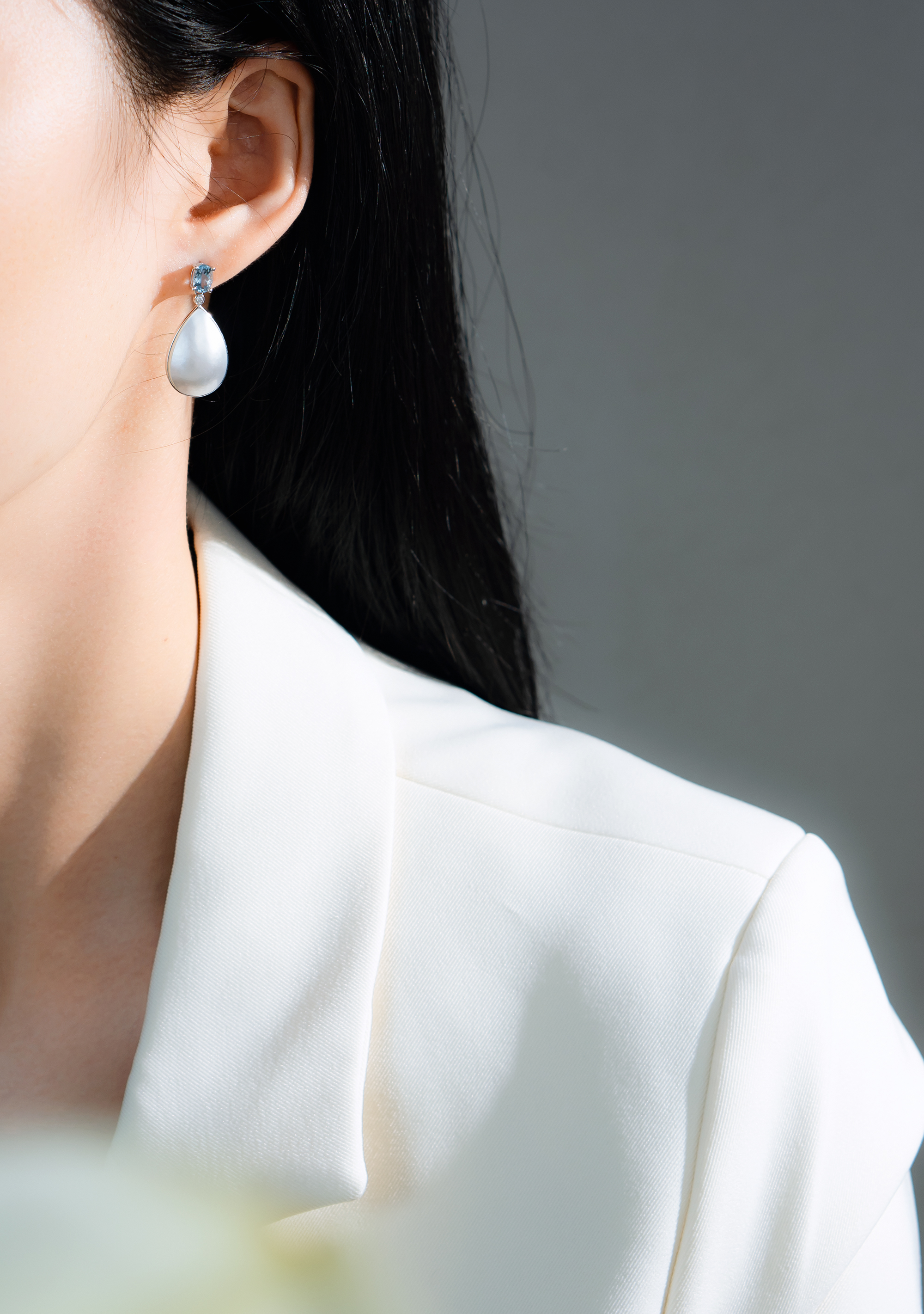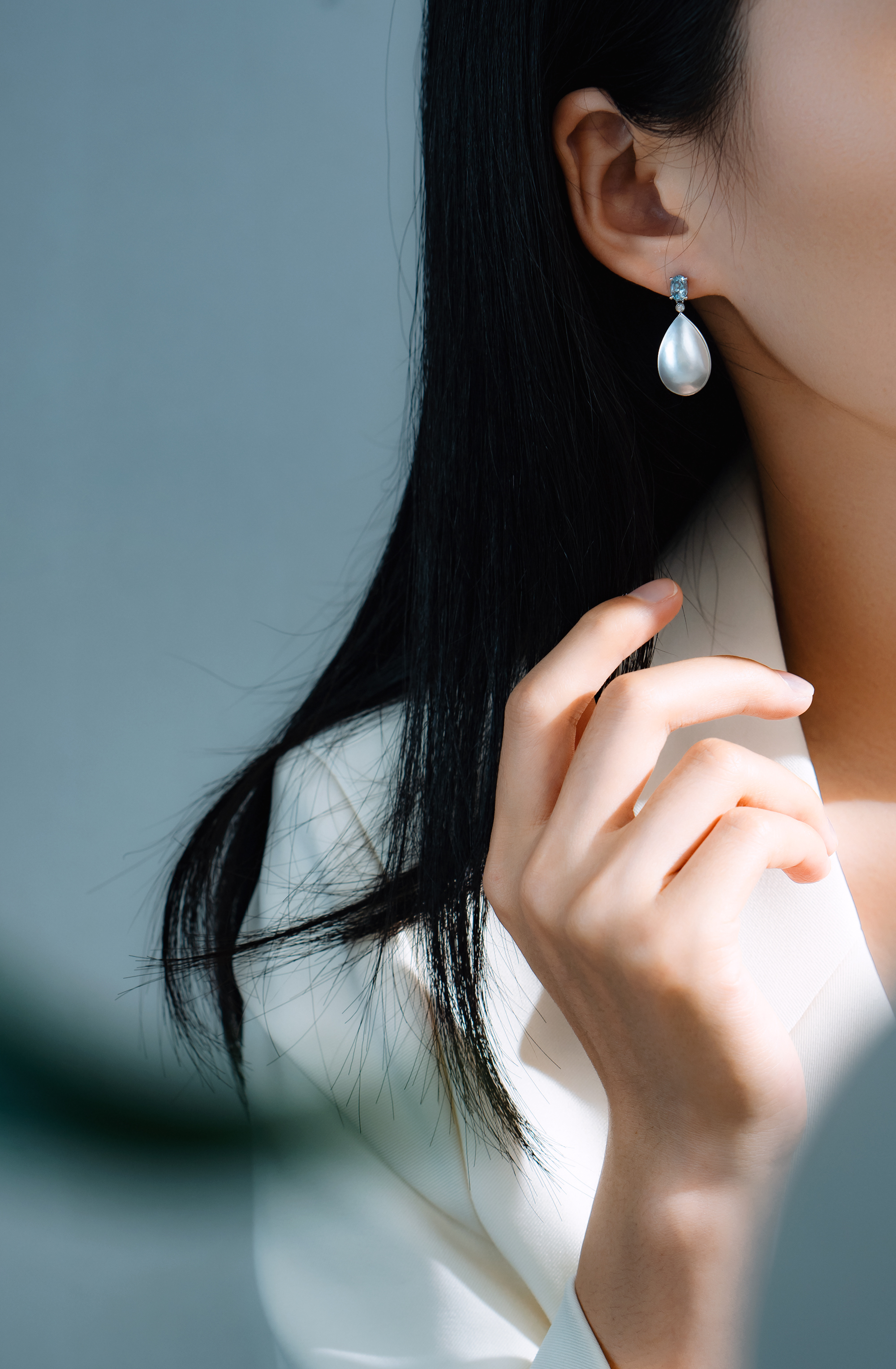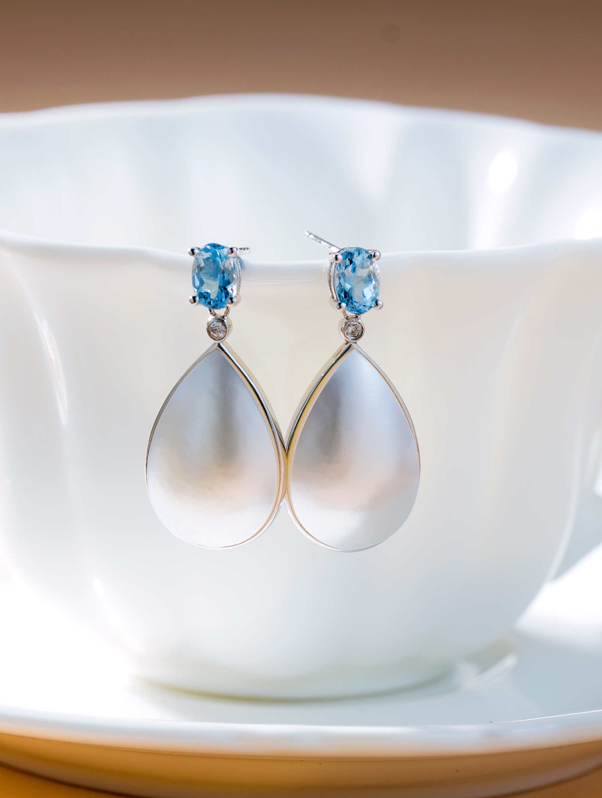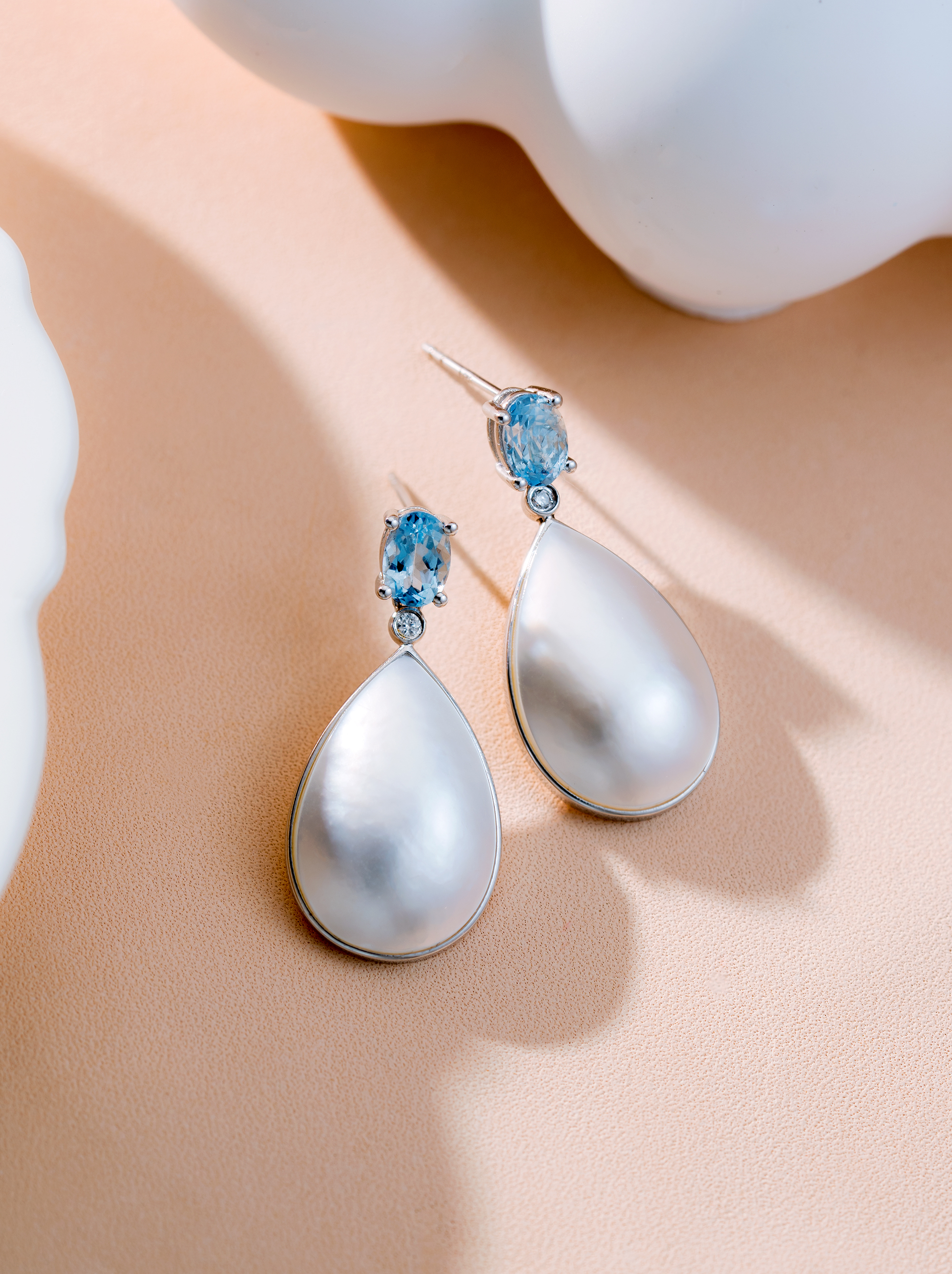 This pair of earrings combines teardrop-shaped Southsea white mabe with clear aquamarine. A sparkling diamond links the two, adding a touch of luxury. Crafted in 18K white gold, it exudes elegant and fresh charm.