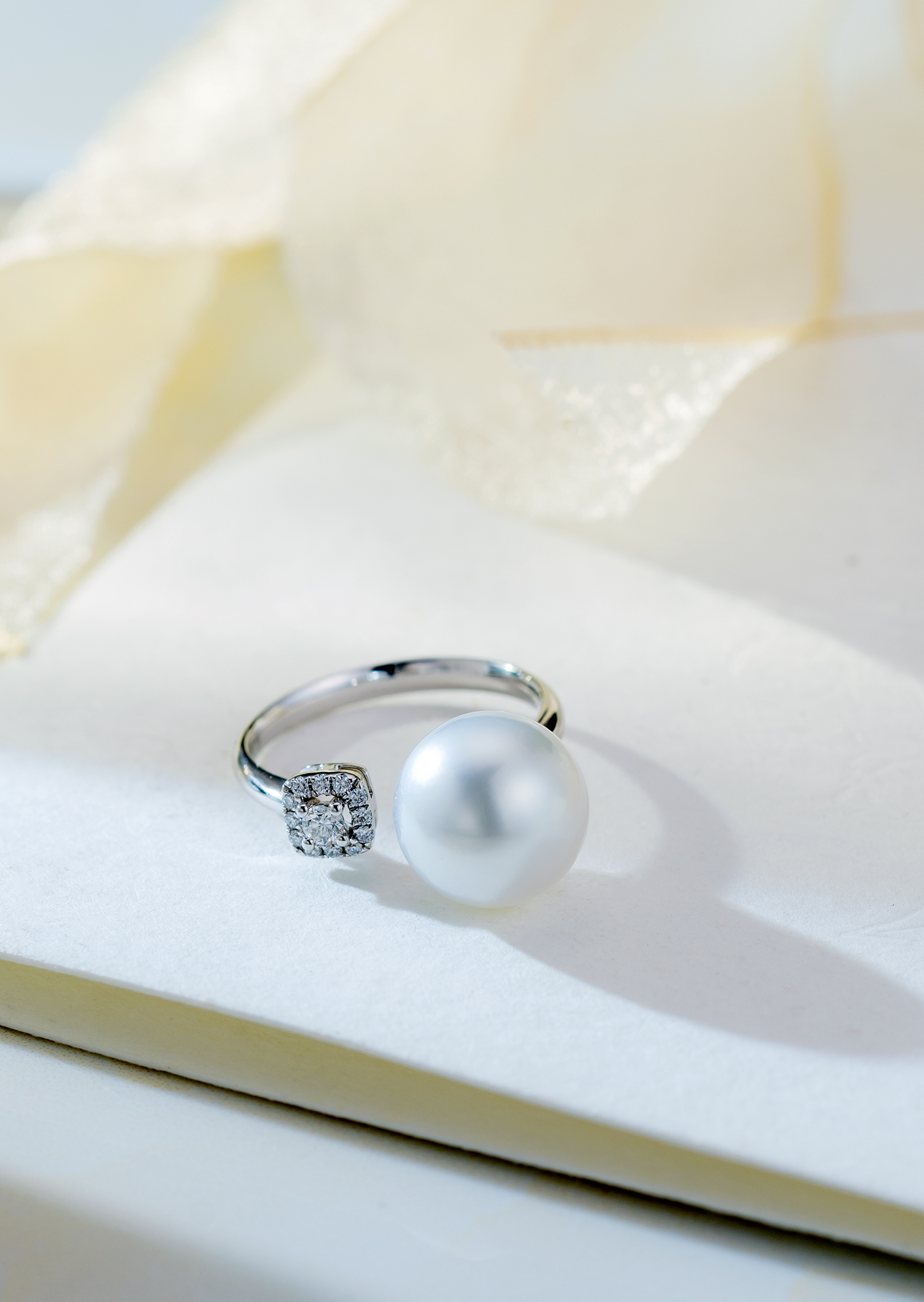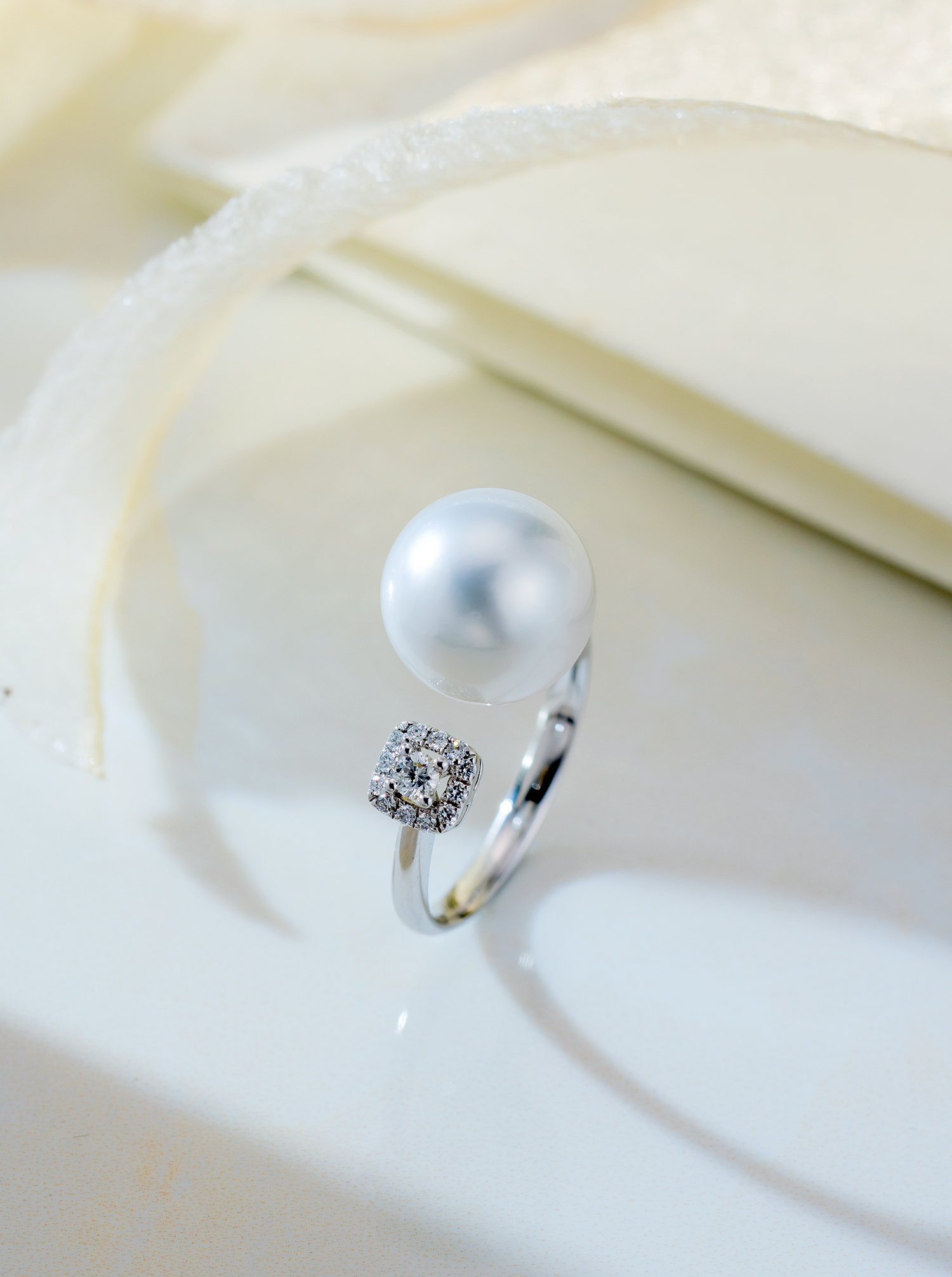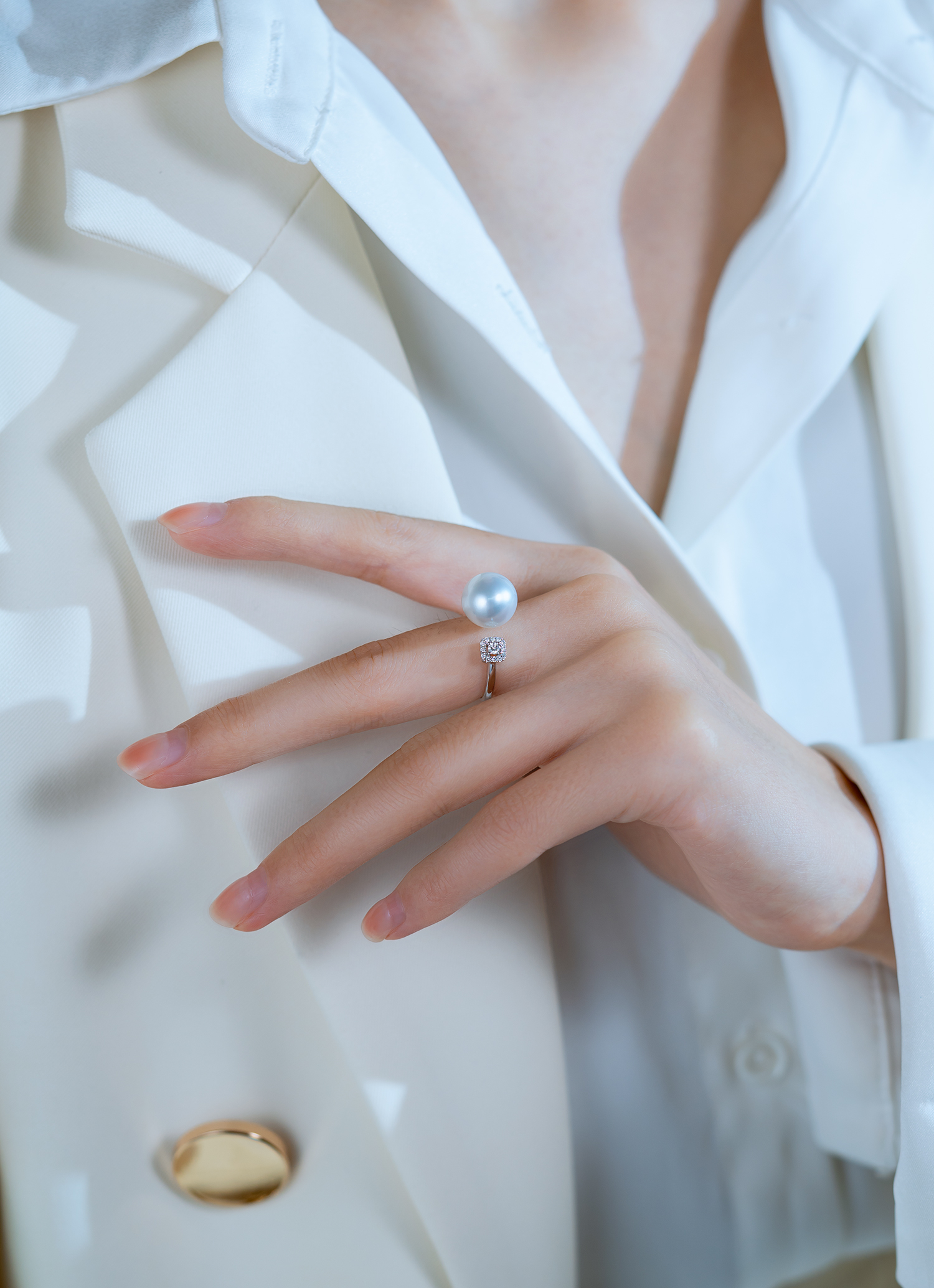 這款經典開口戒指將南洋珍珠與鑽石的奢華完美結合!