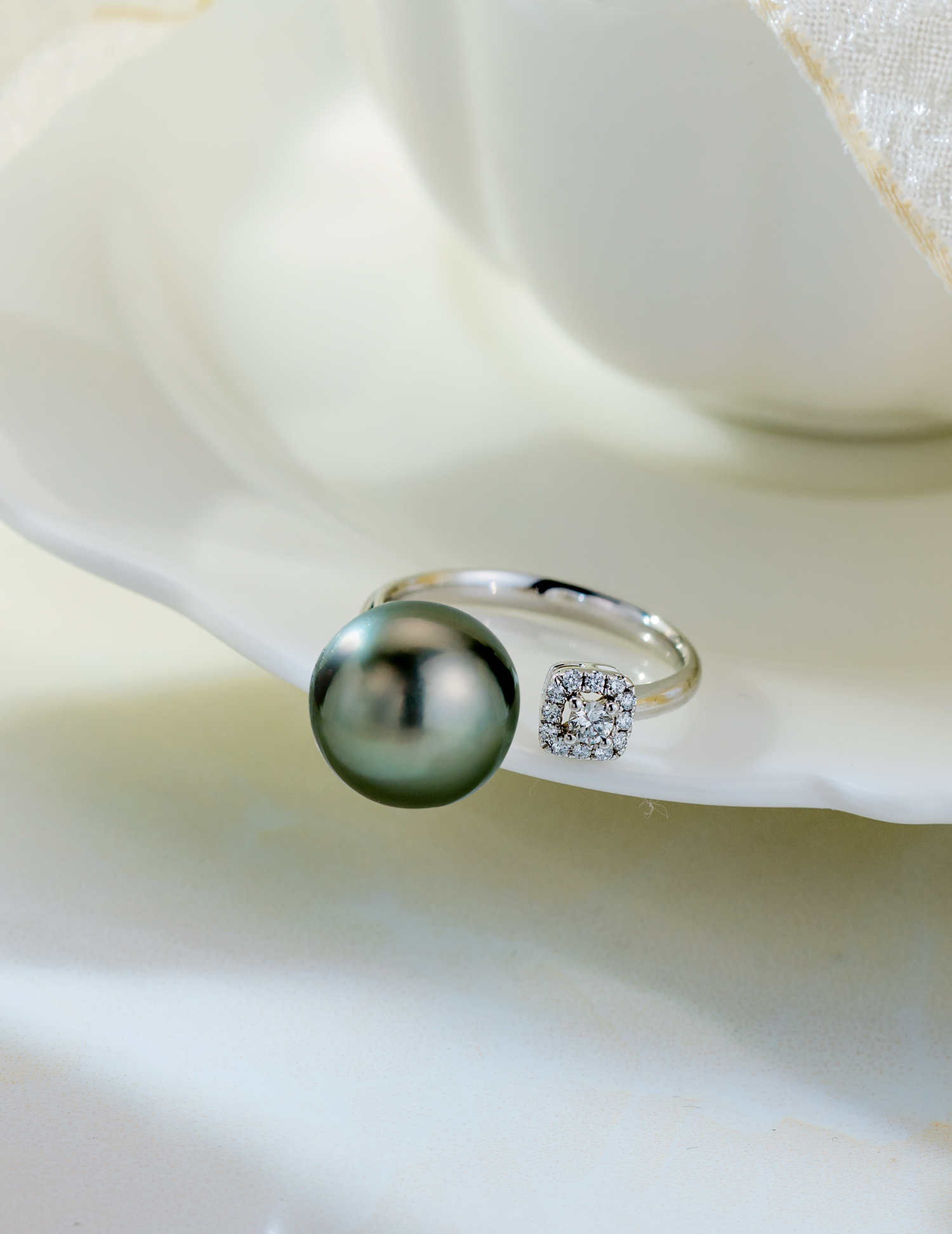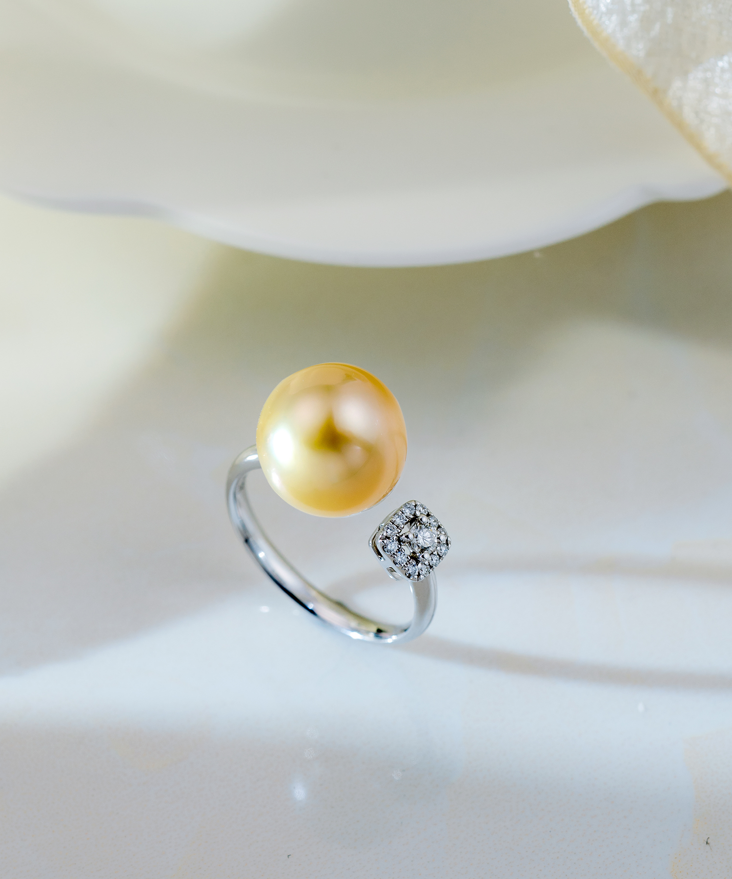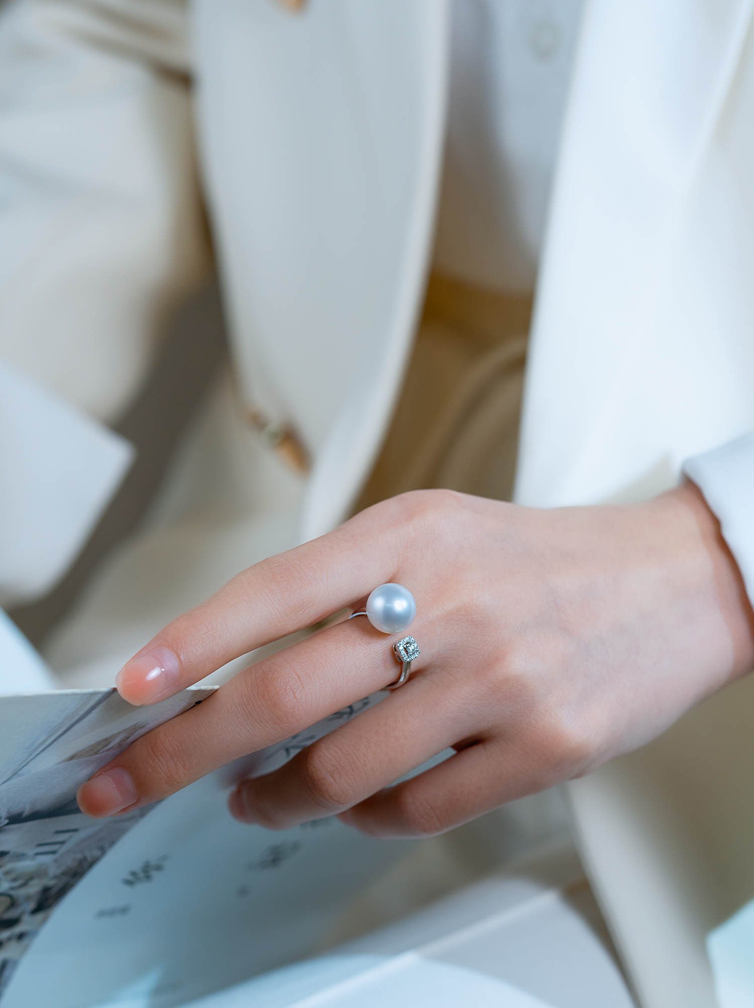 這款經典開口戒指將南洋珍珠與鑽石的奢華完美結合!