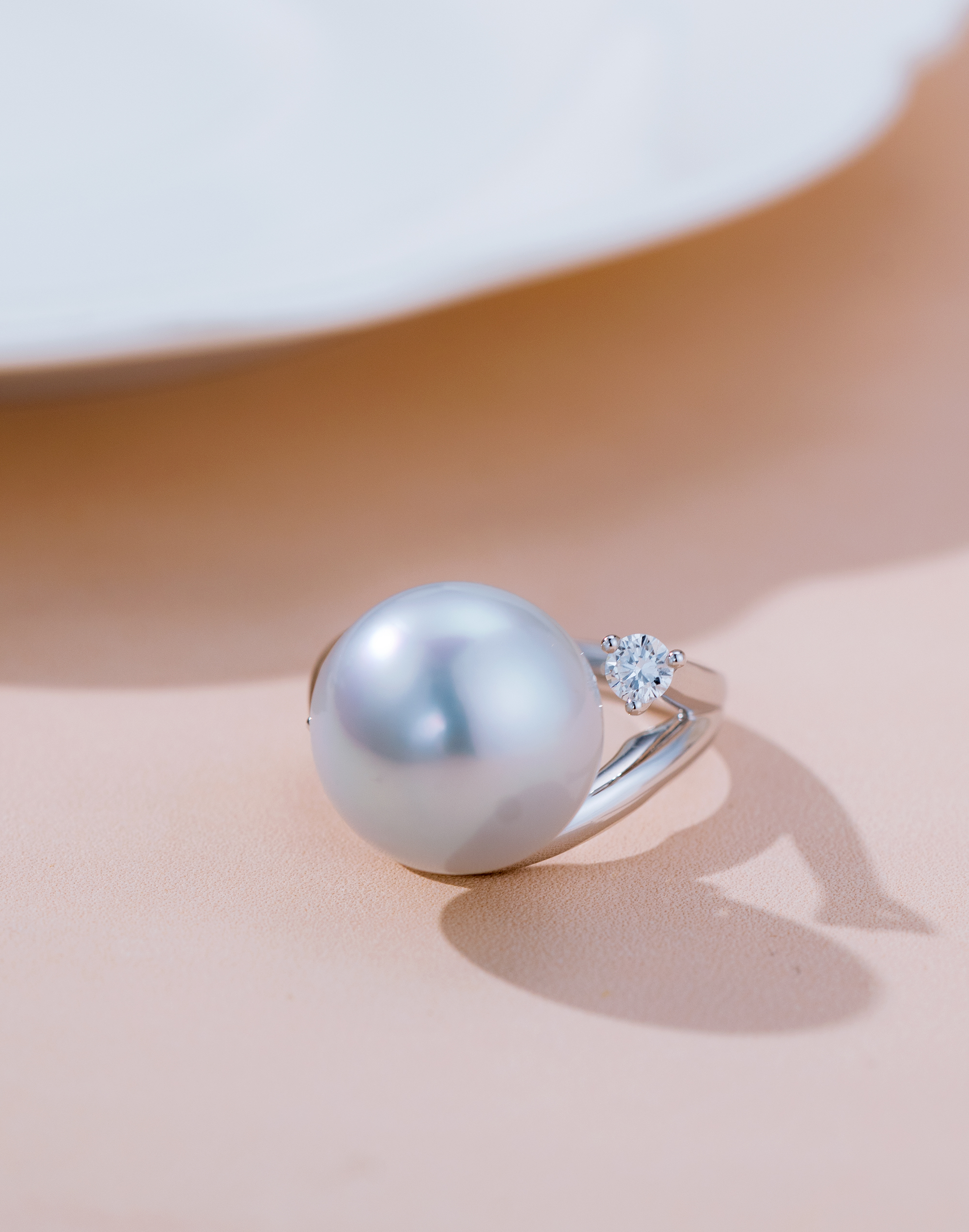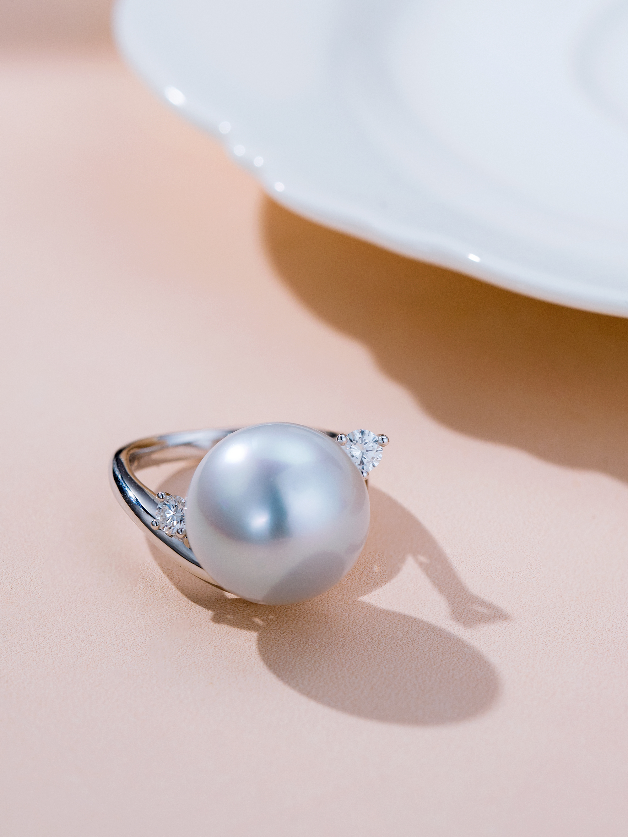 兩顆精心選配的閃耀鑽石點綴其側,鑽石的明亮折射映襯著白珠的柔和光芒,形成了動人的視覺對比。