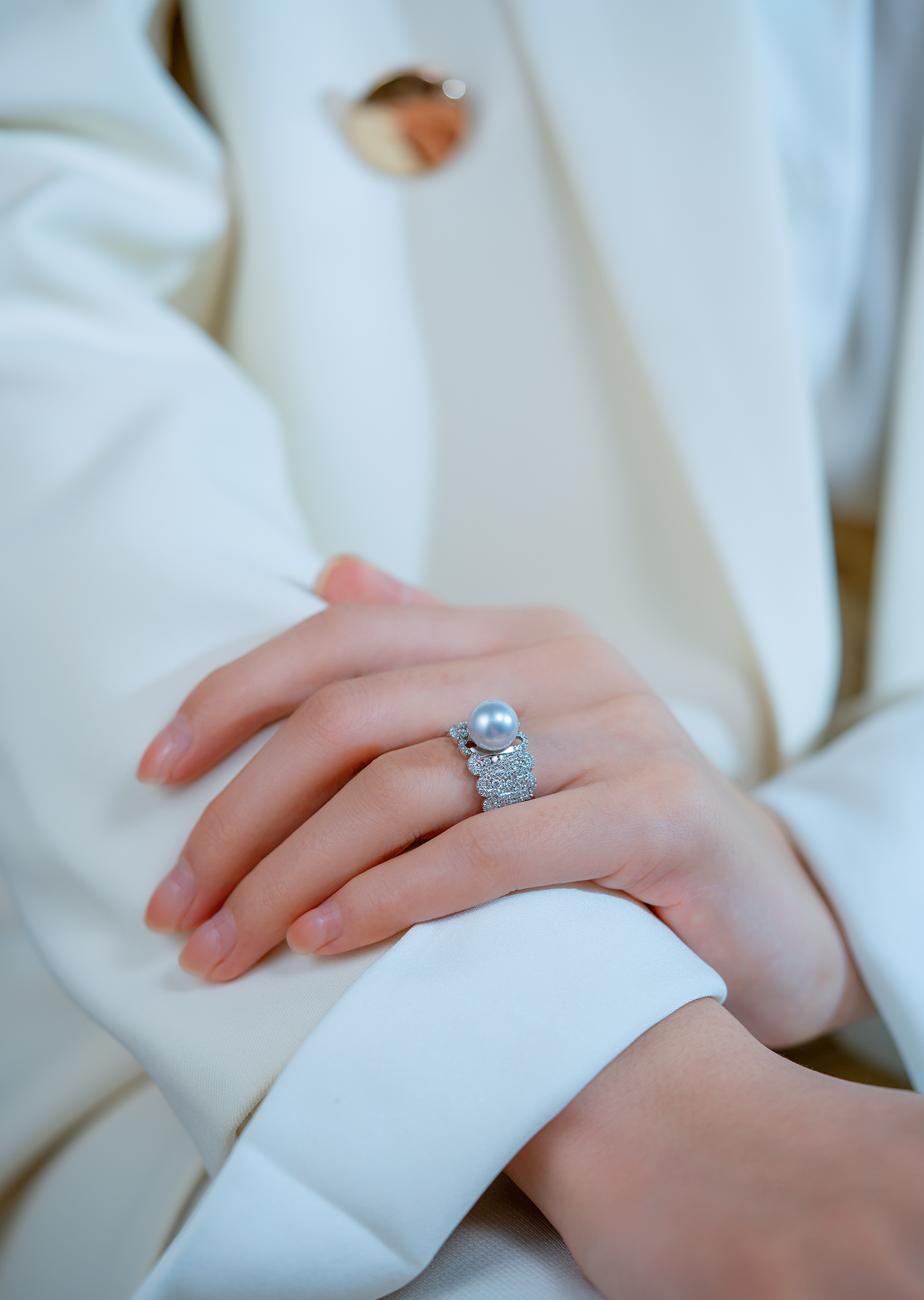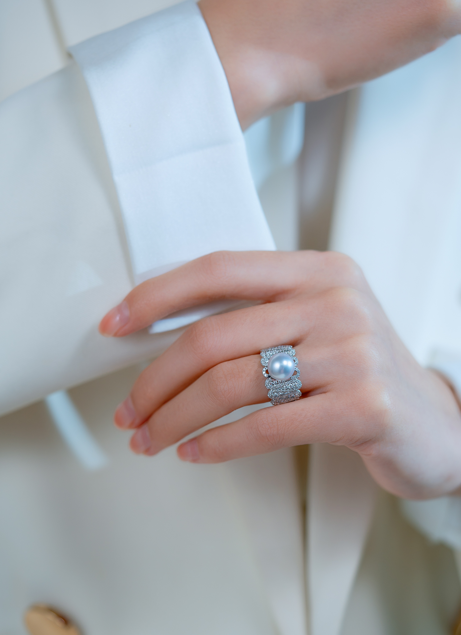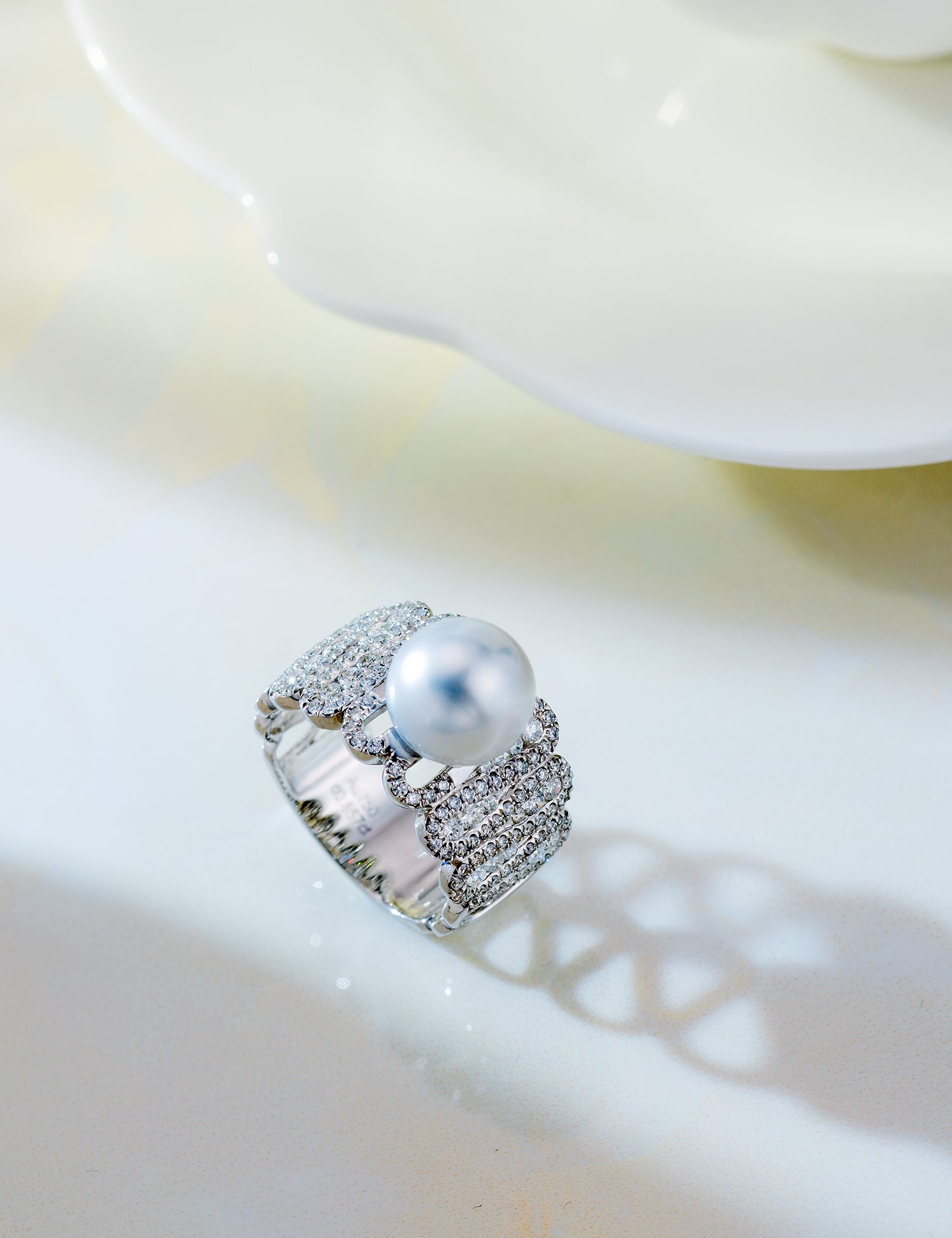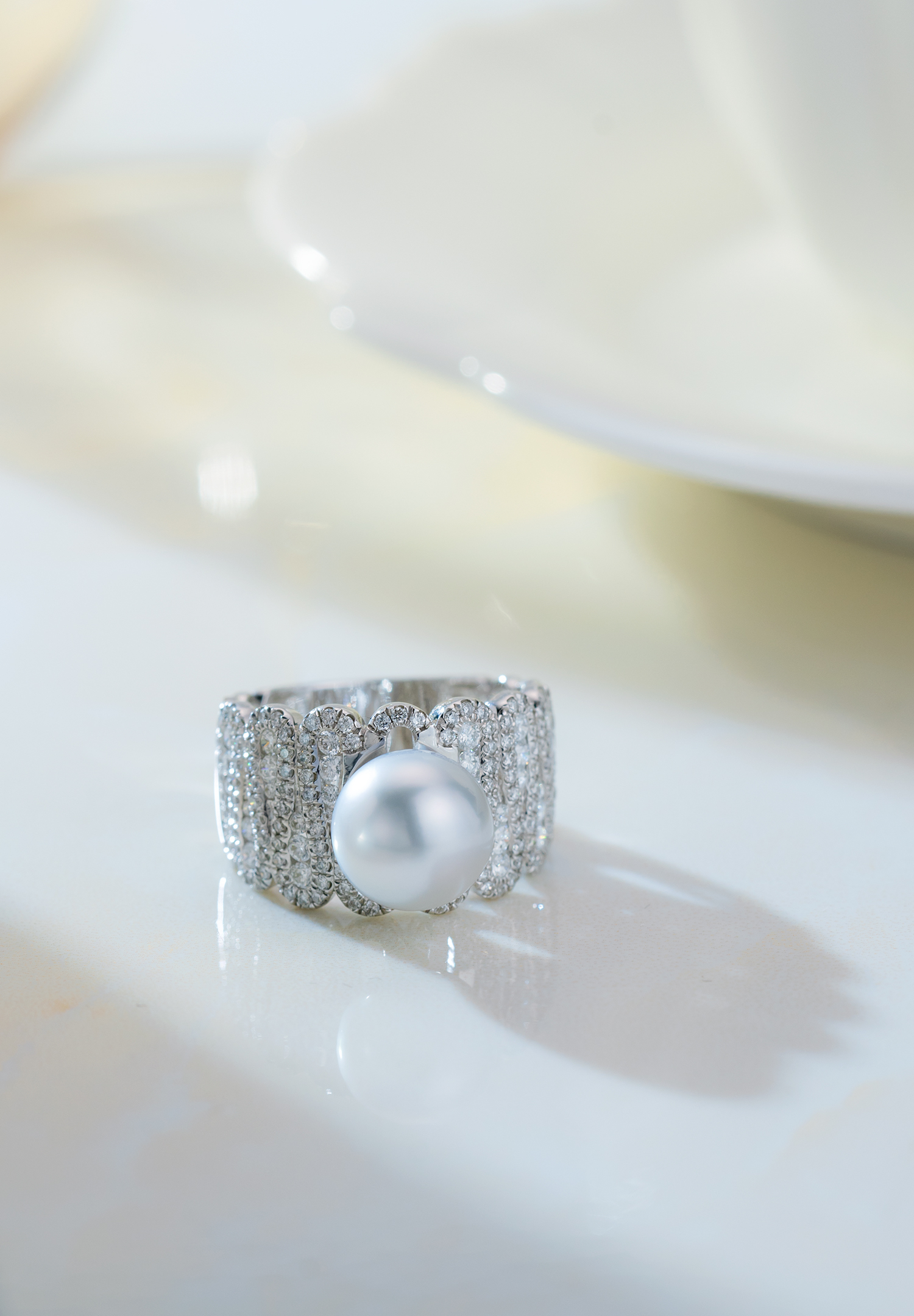 This stunning ring features multiple sparkling diamonds encircling an 18K white gold band. At its center lies a 9-10mm Southsea White Pearl, radiating a brilliant glow.