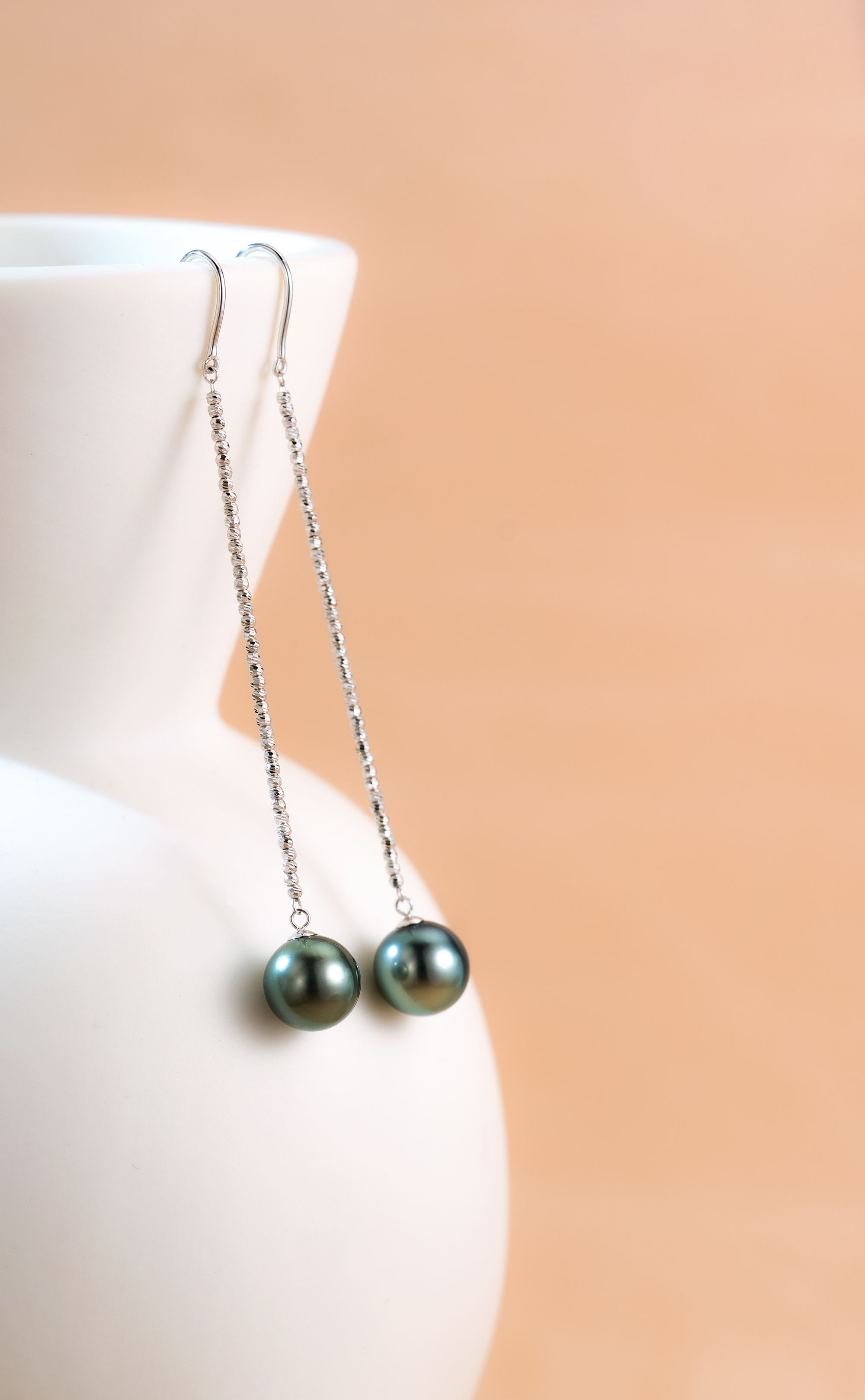 耳環的長吊部分以18K金車花珠設計,配上深邃夢幻的大溪地黑珍珠,隨著動作搖晃時展現優雅的流動感。