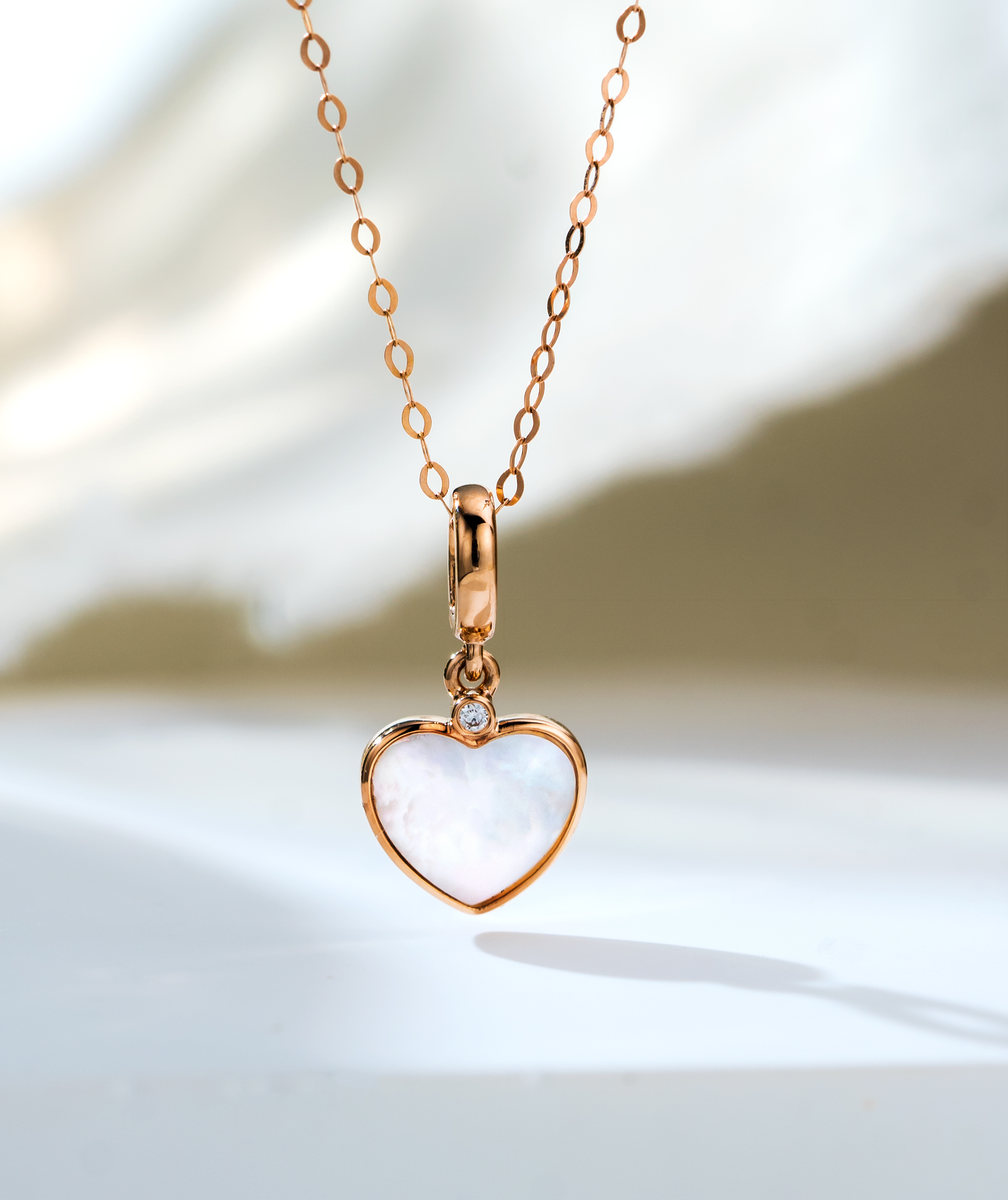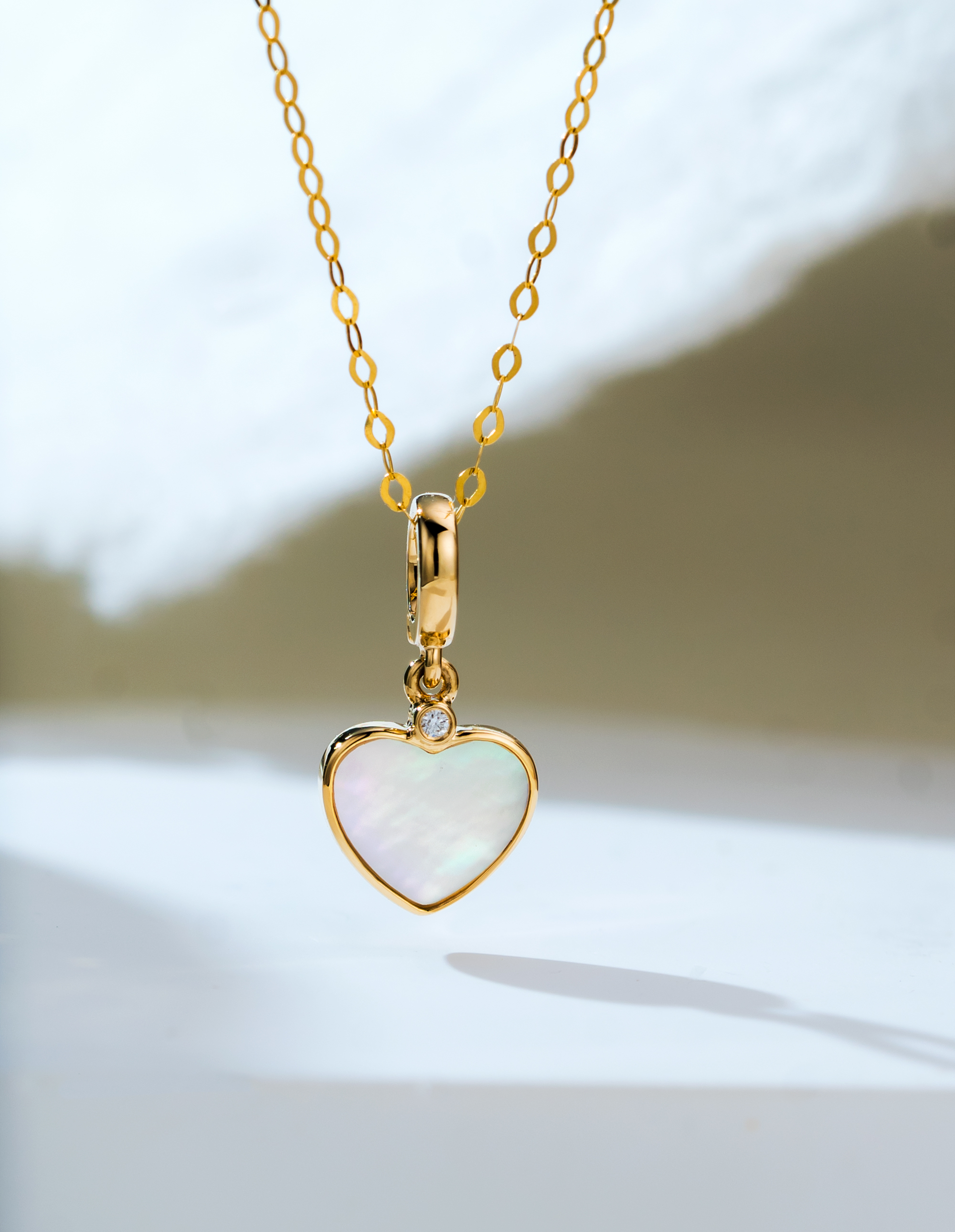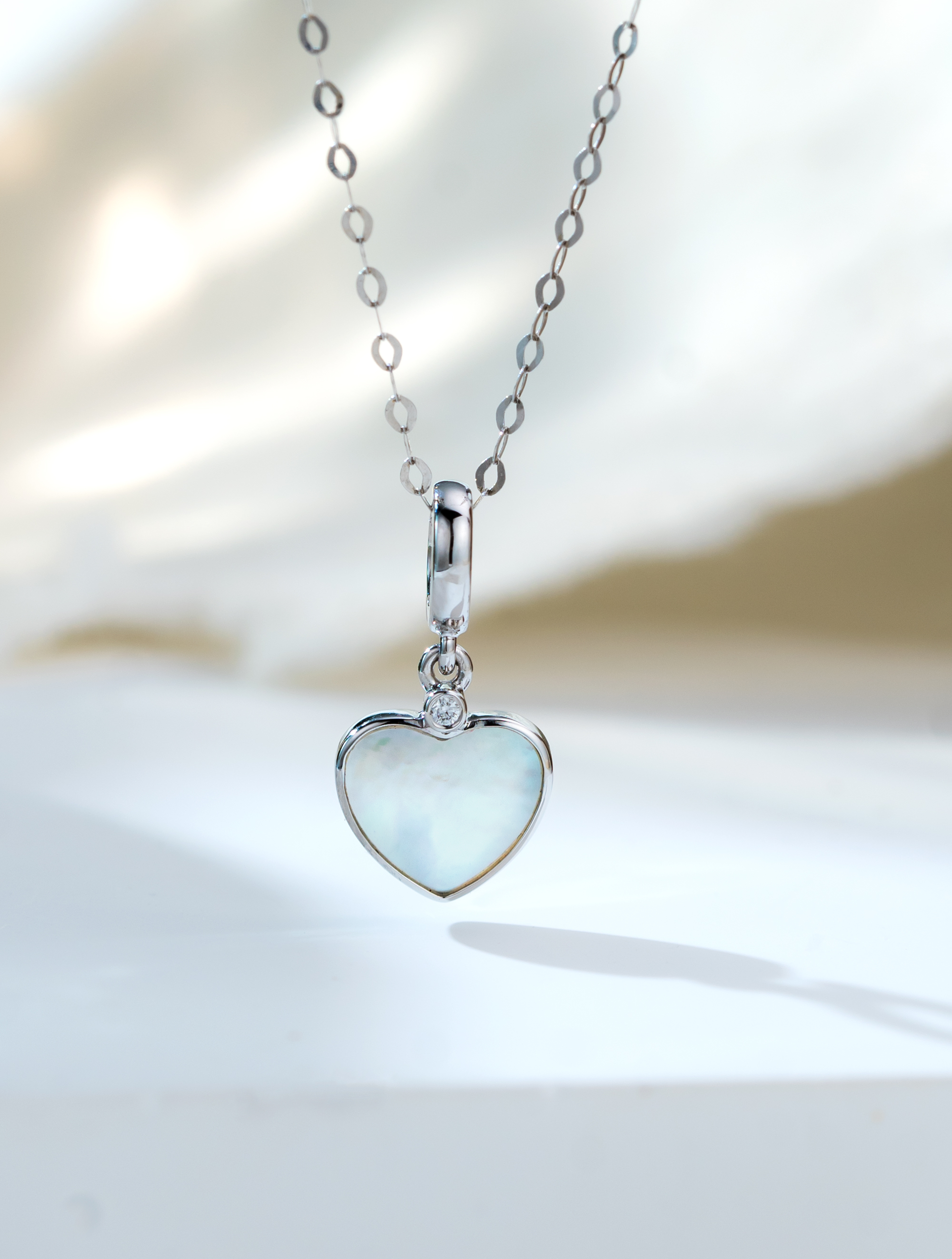 這款吊墜以炫彩奪目的白碟貝貝母製成,並以優雅的愛心形狀呈現,象徵著永恆的愛情和深深的情感。