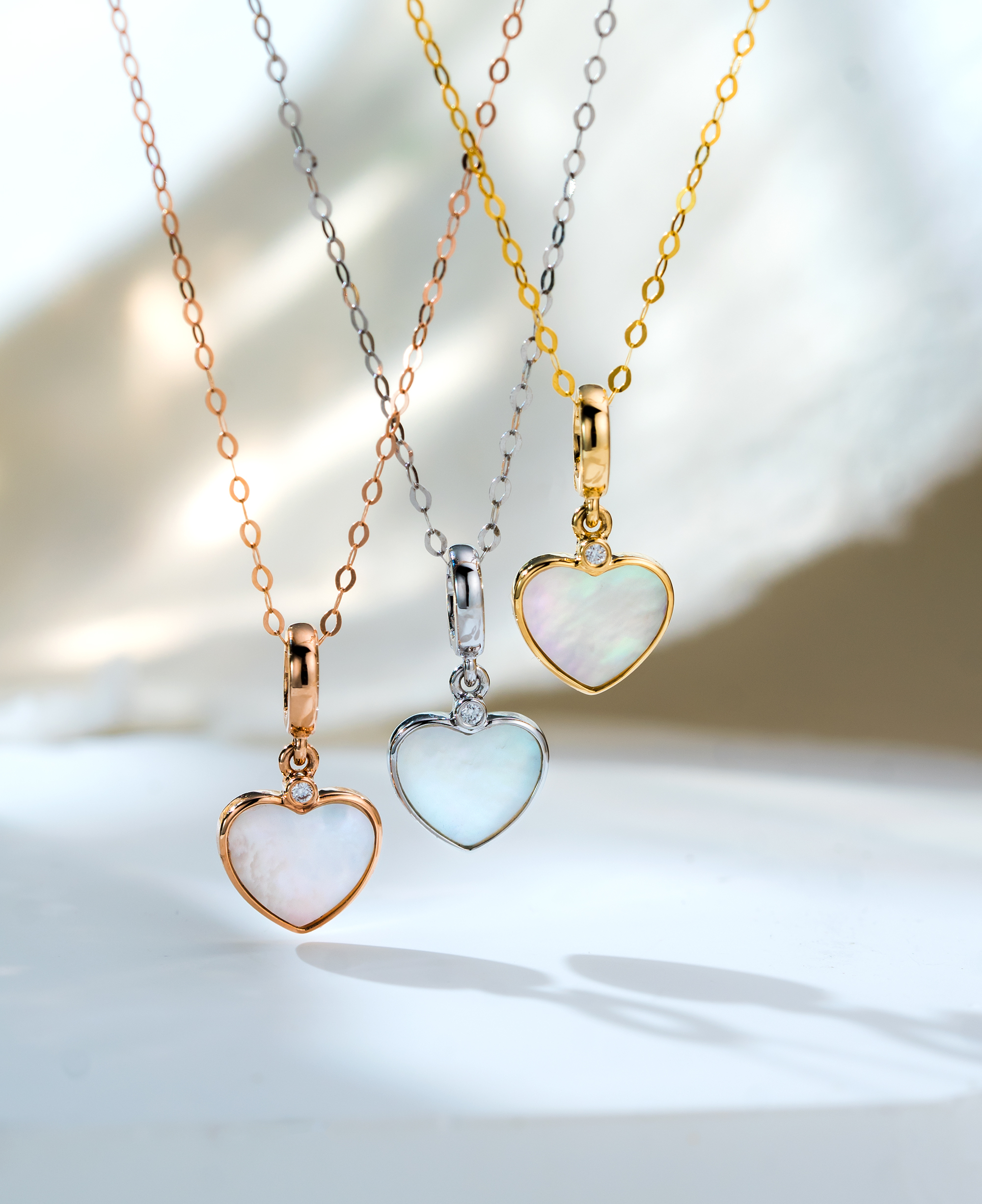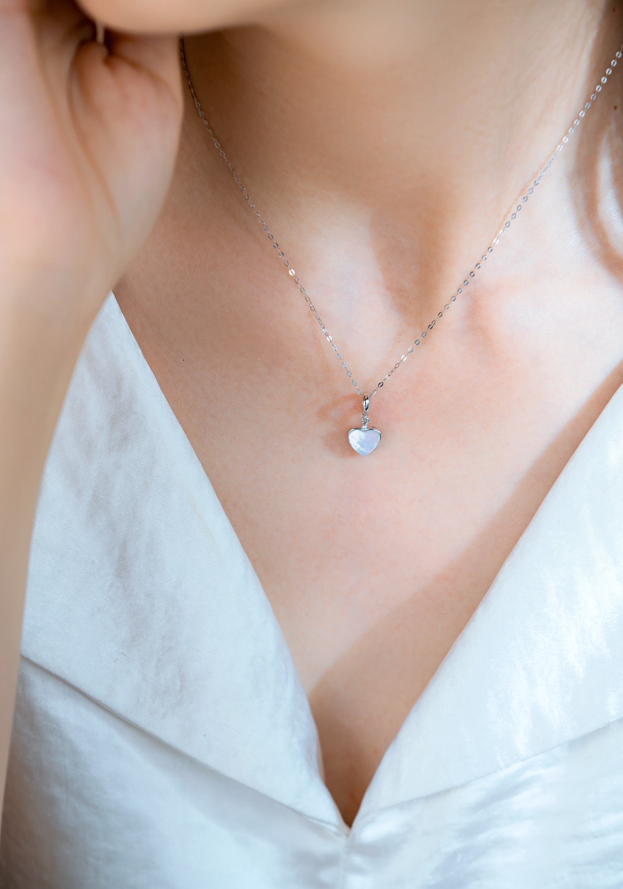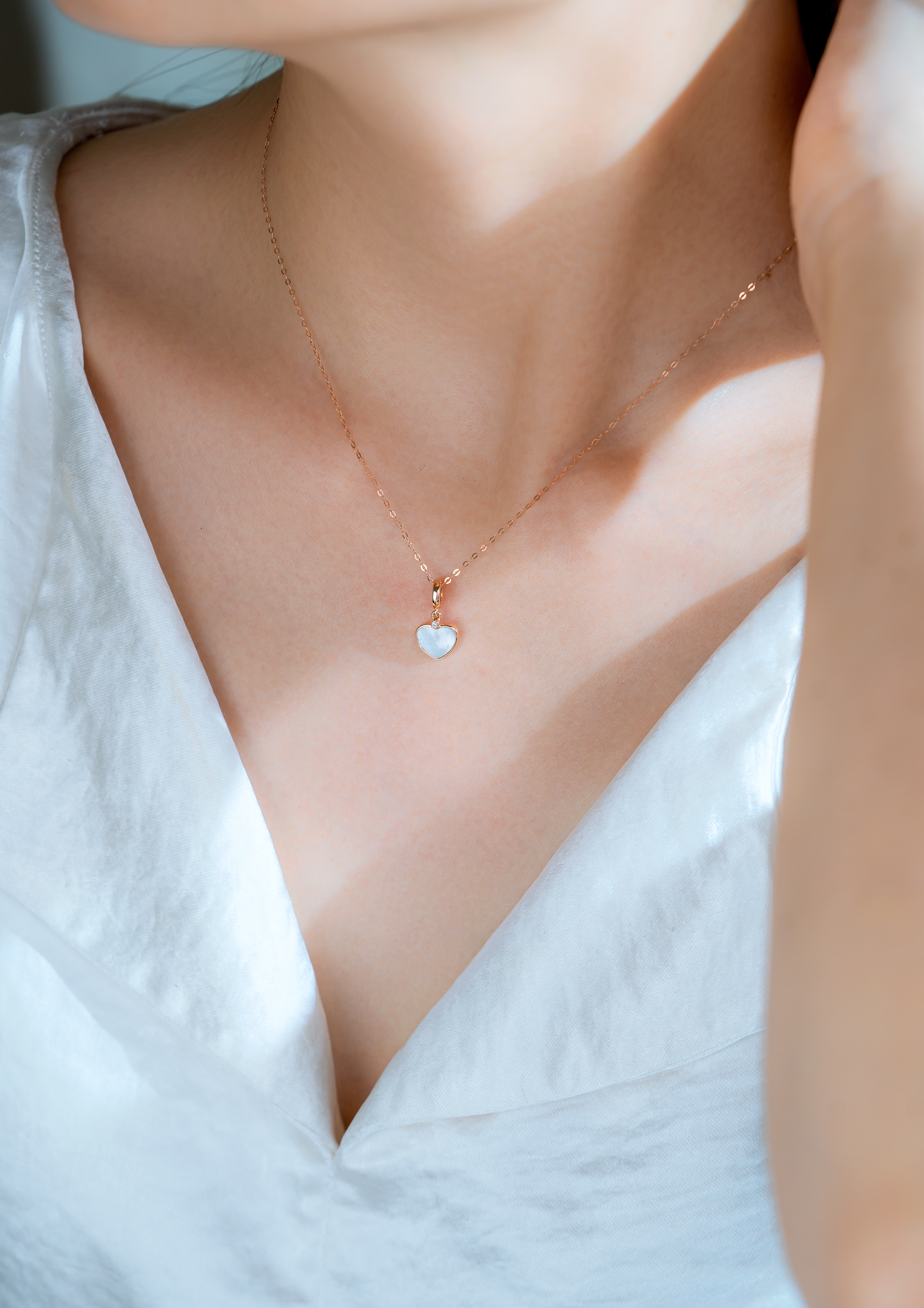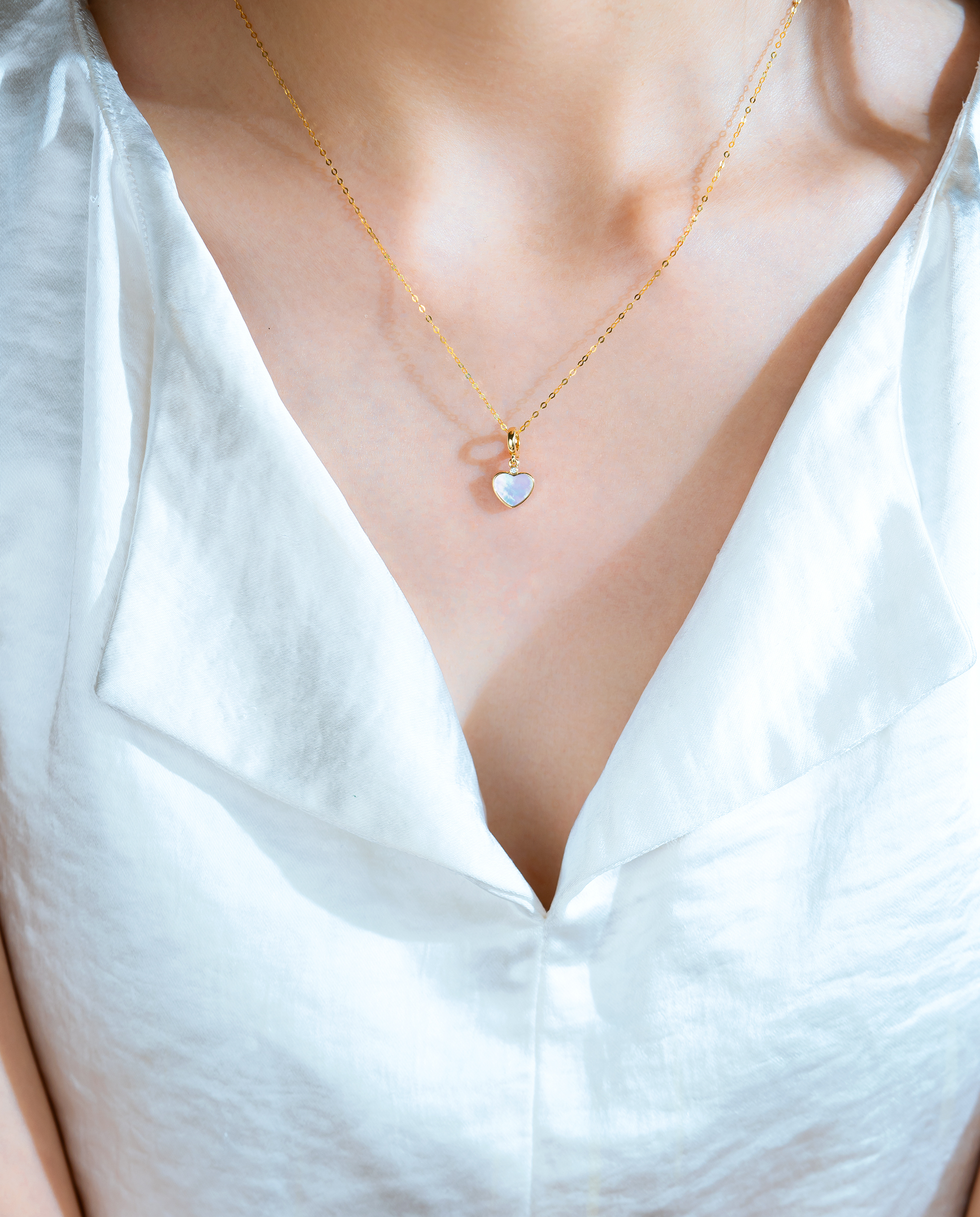 這款吊墜以炫彩奪目的白碟貝貝母製成,並以優雅的愛心形狀呈現,象徵著永恆的愛情和深深的情感。