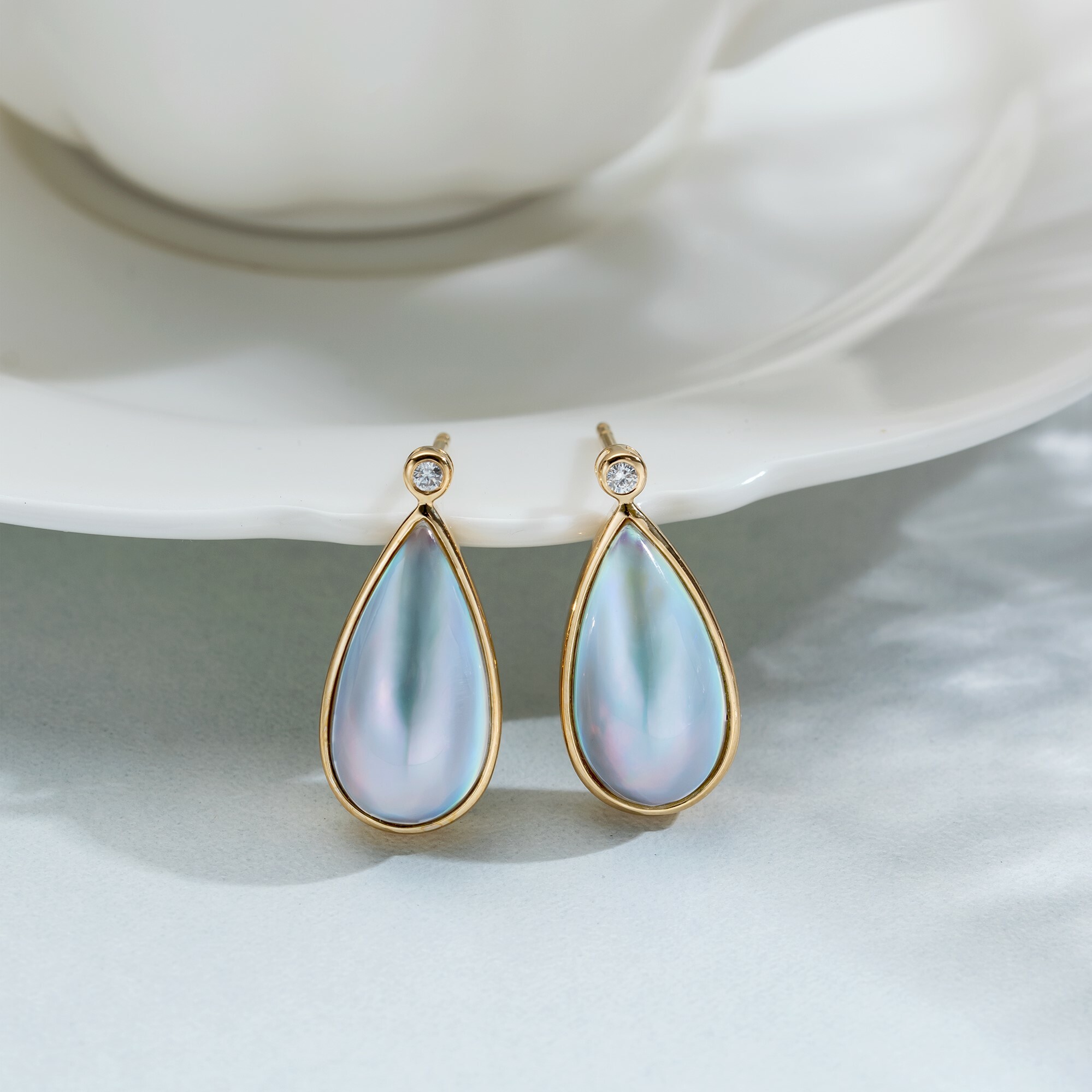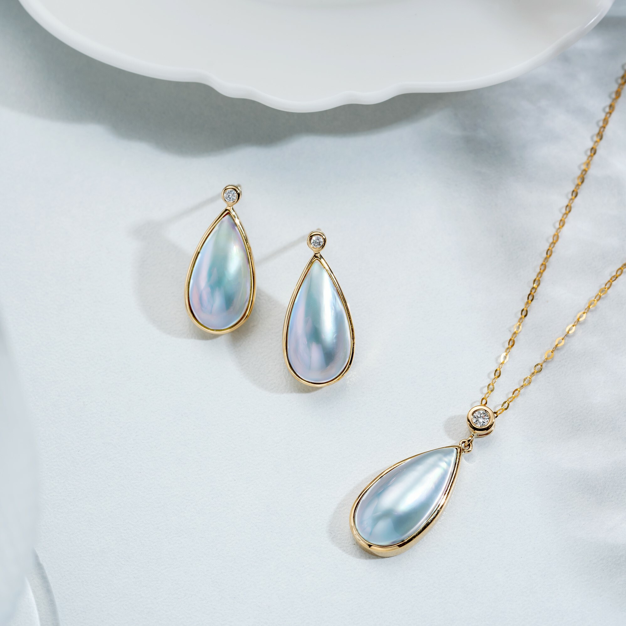 耳環由水滴藍馬貝與18k金相呼應而成,加以鑽石點綴其中,清澈明淨的藍色調裡彷彿裝載著盈盈的湖水,深邃而迷人,不同角度折射出的光暈都是獨一份的美。同款吊墜、耳環,可自由搭配,單獨裝飾極富獨特個性,而搭配在一起更是吸睛套裝,骨子裡的高雅頃刻展現。