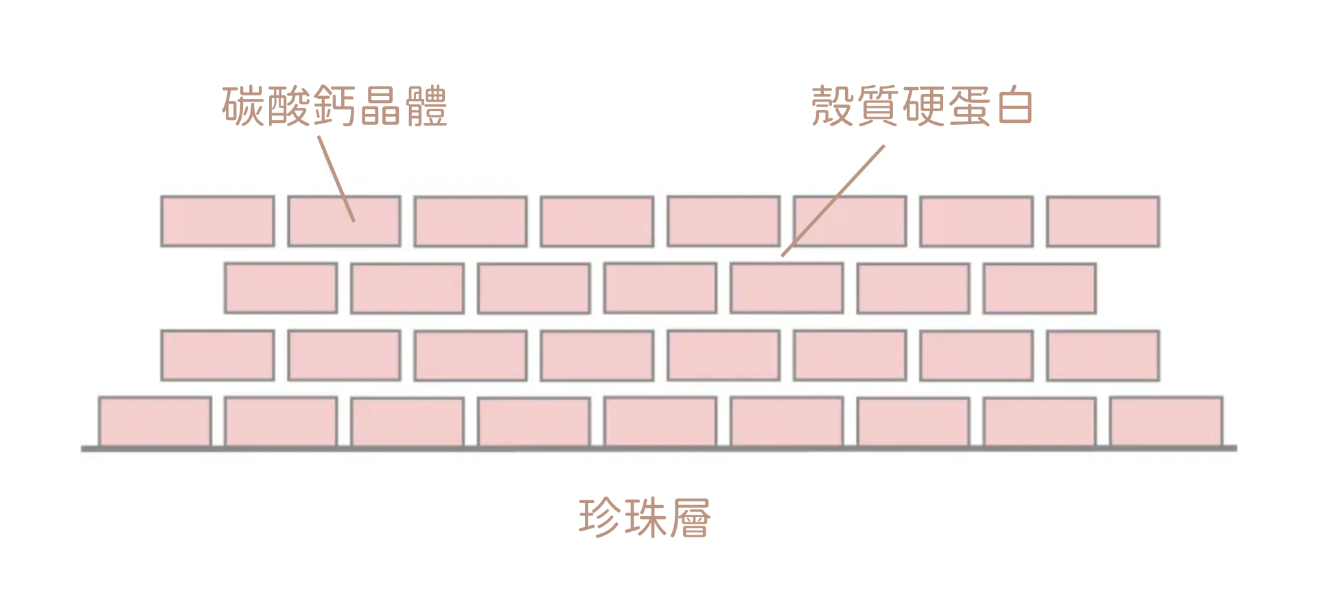先來簡單說說Akoya珍珠的構造。珍珠核的外面,是有數個碳酸鈣晶體像磚塊一樣排列而成的。而晶體與晶體之間,是由一種叫左「殼質硬蛋白」的蛋白質像膠水一樣,把碳酸鈣晶體黏合在一起,從而形成了珍珠層。一層珍珠層的厚度約0.4μ (微米),像一顆珍珠層厚度達0.6mm的Akoya珍珠,就有著數千層的碳酸鈣晶體與殼質硬蛋白。