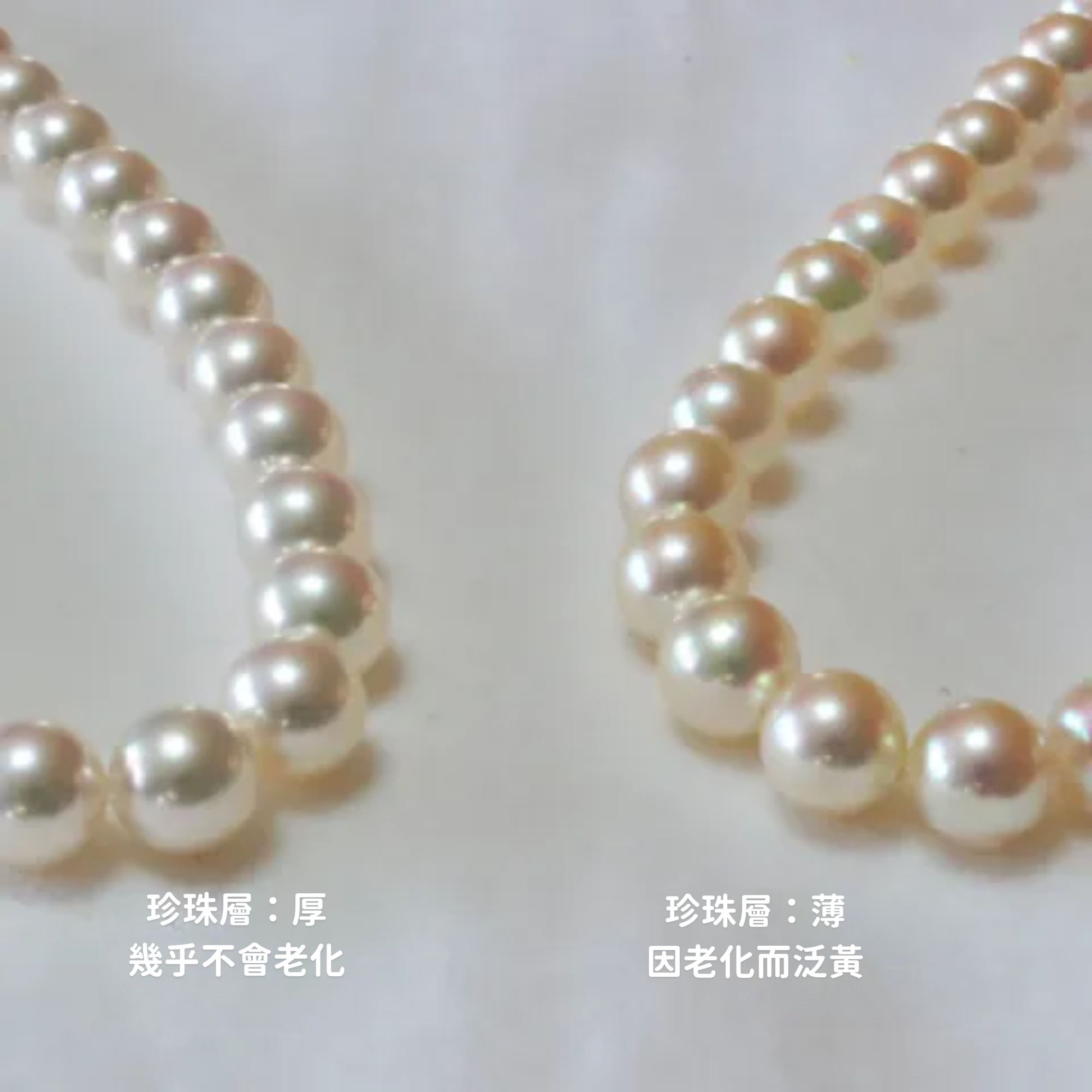 海水Akoya珍珠是天然的有機物,成分會隨著時間發生一定的變化,例如因老化而變黃、珍珠層剝落等等。一般來說,珍珠層越厚,越難因時間而變化。如果珍珠層達到某一個厚度,老化而變黃的速度會相對地慢。若珍珠層厚度太薄 (0.2mm),變黃的現象可能很快就會出現,更會有珍珠層剝落的危險。