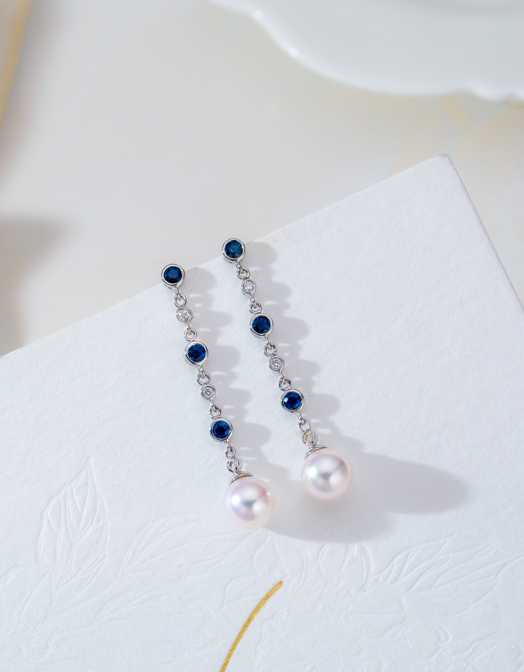 這款精緻的18K白金耳環設計獨特,每邊鑲嵌三顆閃亮的鑽石,中央則嵌入三顆美麗的藍寶石。這樣的設計帶來迷人的視覺對比,藍寶石的深藍色和鑽石的明亮閃爍形成了迷人的視覺效果。而底部的Akoya珍珠與之相得益彰,為整個耳環增添了神秘浪漫的氛圍。這樣的組合提升了耳環的華麗和精緻度,呈現出優雅、高貴又迷人的風格。