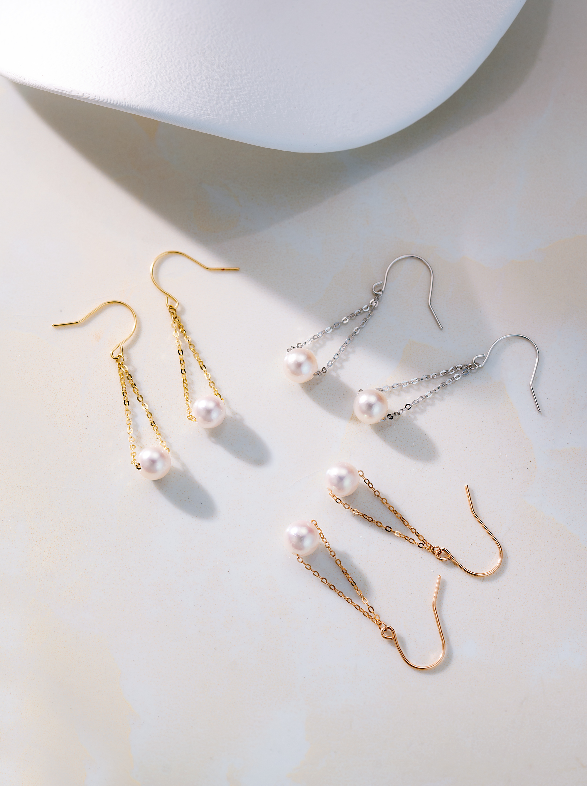 18K雙金鏈的設計,使整體耳環更具層次感。底部懸掛著極光AKOYA珍珠,展現出精緻和優雅的絕佳組合。