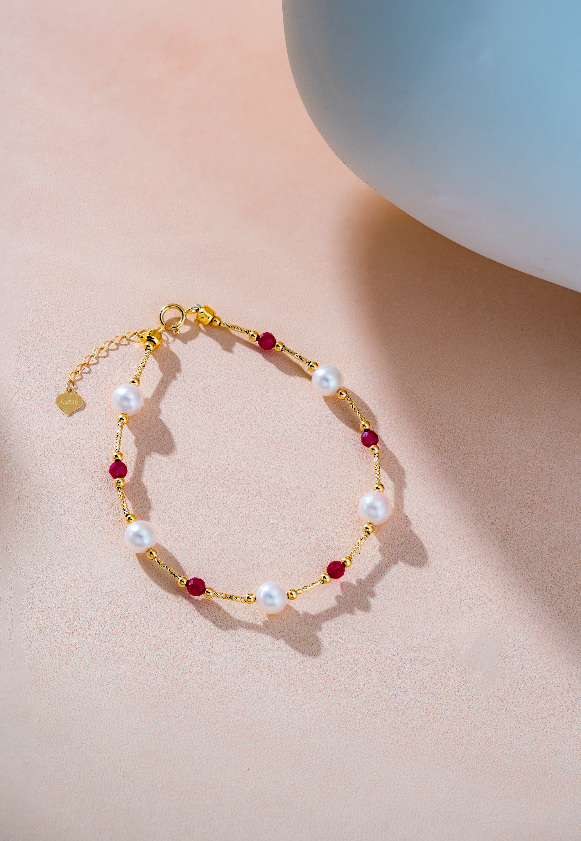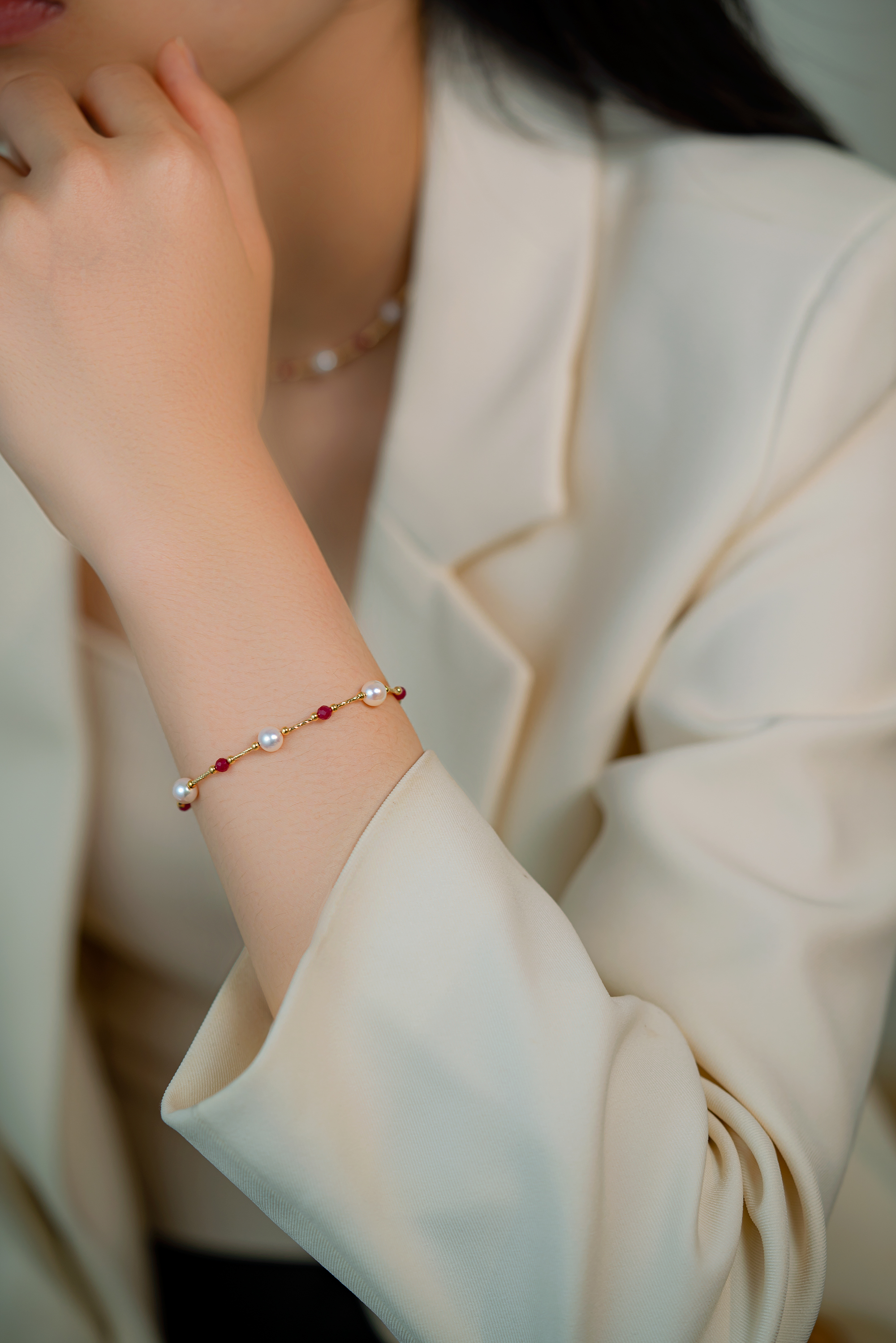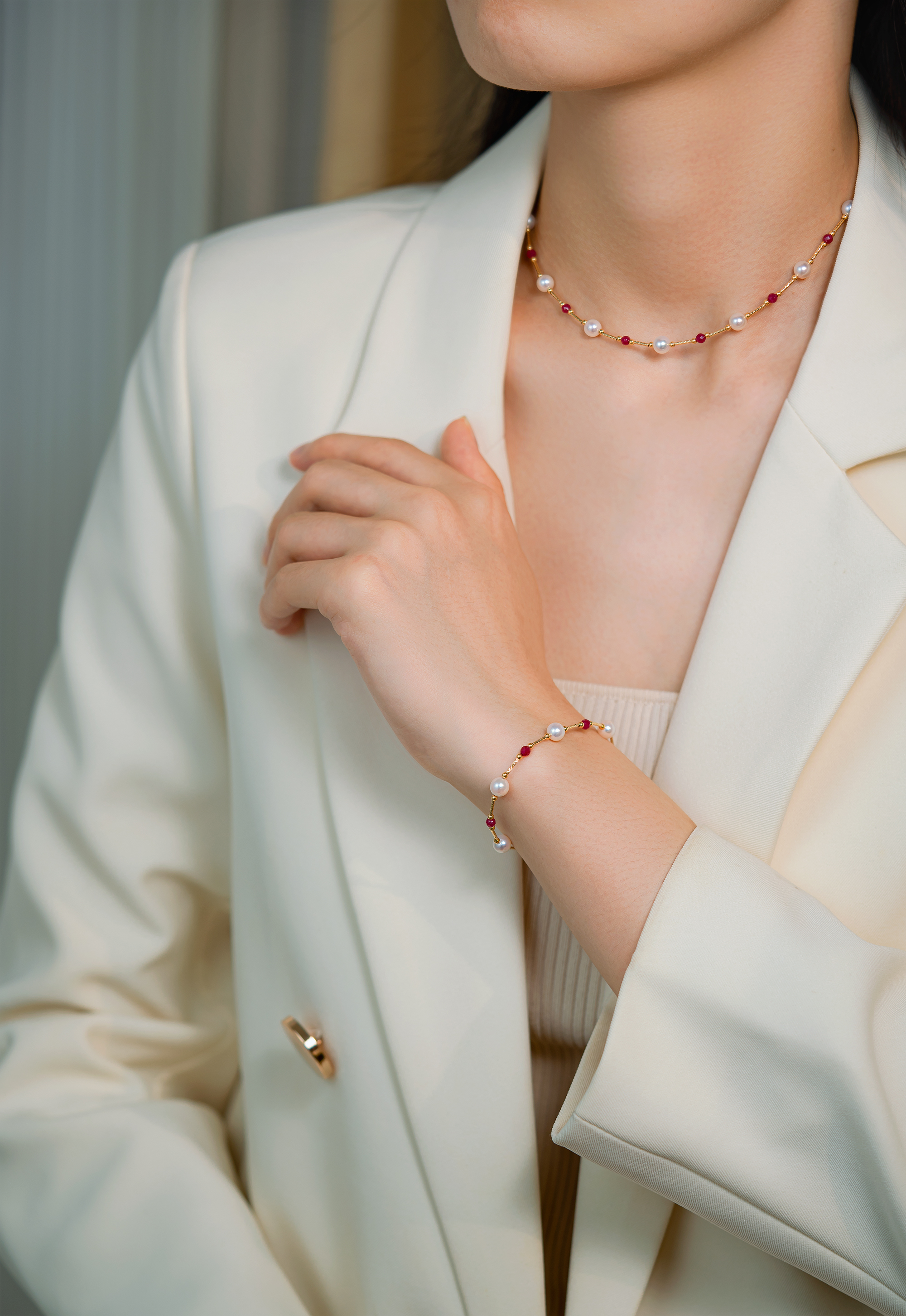 這條手鏈展現Akoya珍珠與紅寶石的完美搭配,兩種珍貴珠寶巧妙地交錯排列,紅寶石的火紅色彩與Akoya珍珠的柔和光澤相互輝映,宛如點燃了整條手鏈,營造出獨特的視覺效果。與同系列的頸鏈佩戴在一起更能散發出優雅迷人的氣質,為您的造型增添獨特韻味。