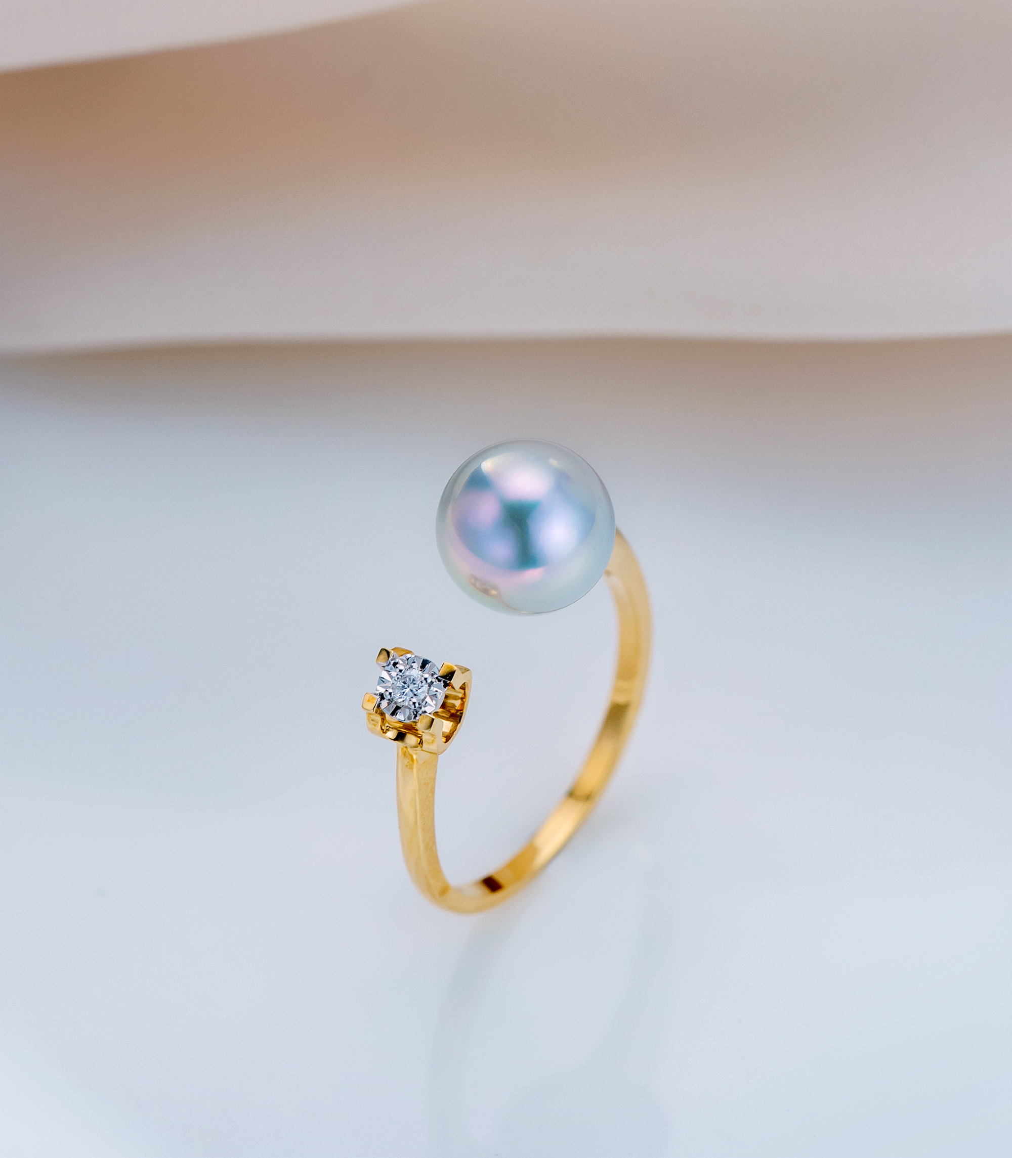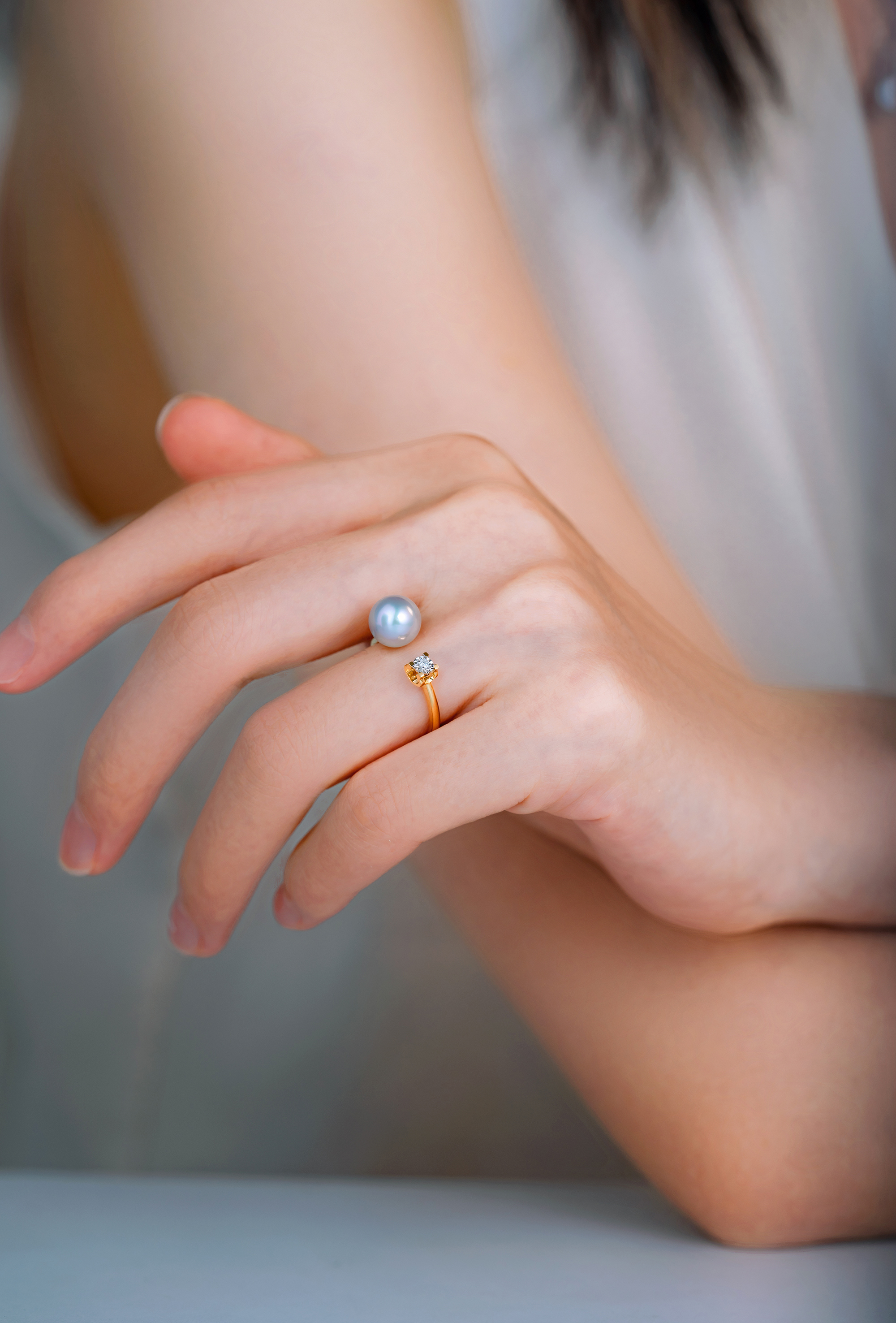 這枚戒指採用開口設計,營造出時尚而優雅的風格。它由優質的18K黃金打造,展現出金光閃爍的奢華感。鑲嵌在戒指上的銀藍色Akoya珍珠散發出迷人的光澤,與另一端的閃耀鑽石相得益彰。