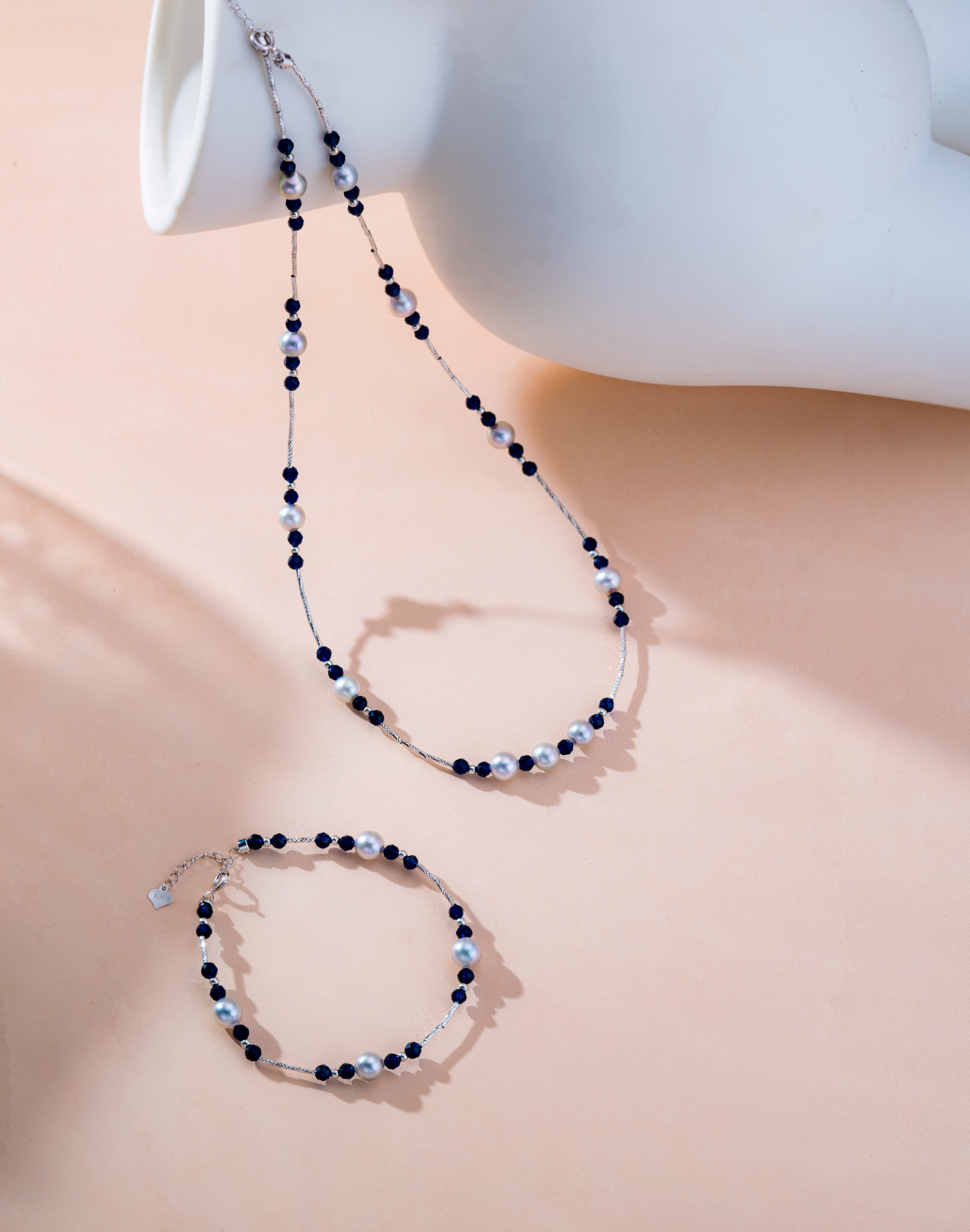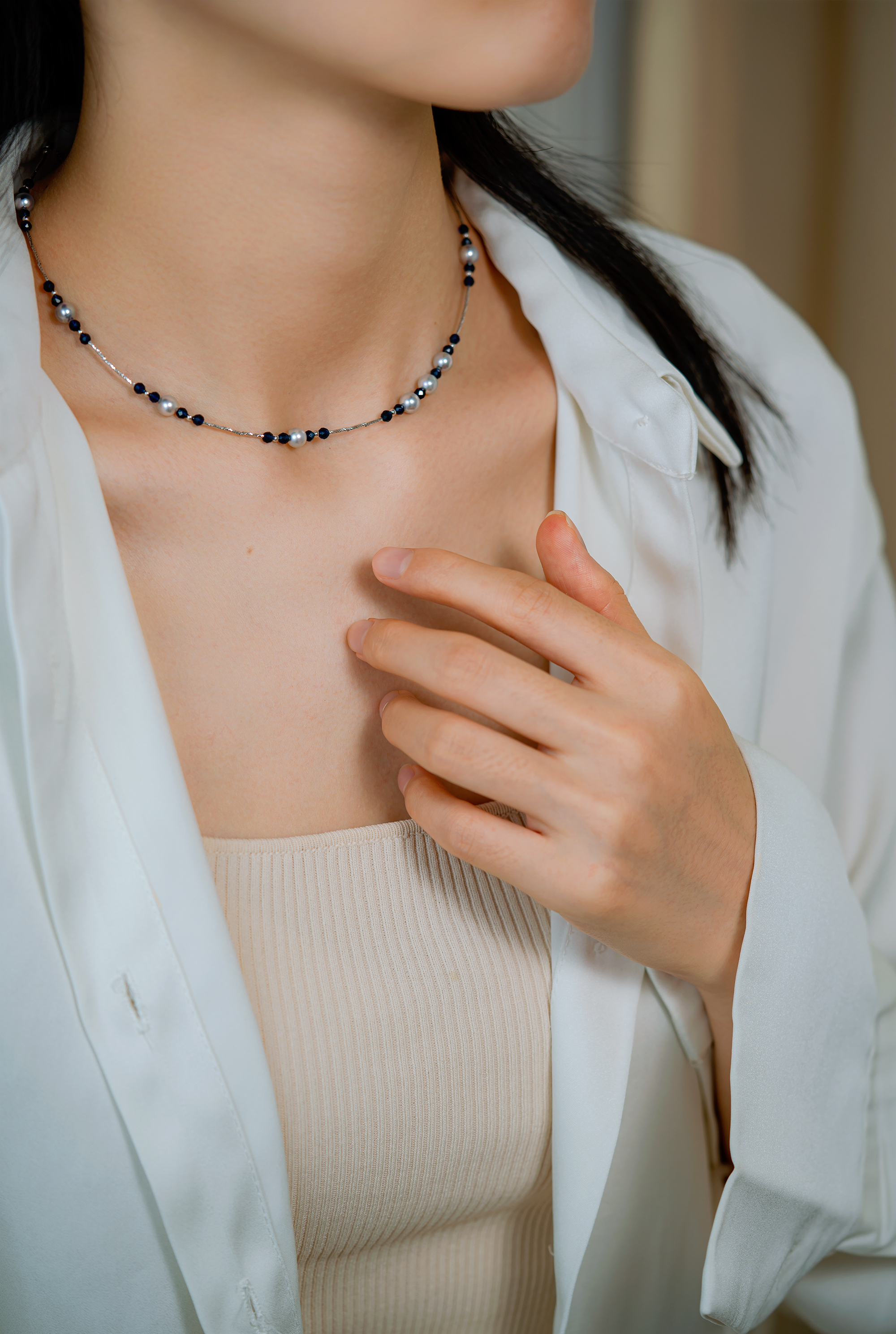 這條項鏈展現銀藍色Akoya珍珠與藍寶石的完美搭配,兩種珍貴珠寶巧妙地交錯排列,藍寶石的迷人高雅與銀藍色Akoya珍珠溫潤色調相互輝映,猶如藍色星辰般熠熠生輝。與同系列手鏈佩戴在一起更能散發出高雅的氣質,為您的造型增添時尚韻味。
