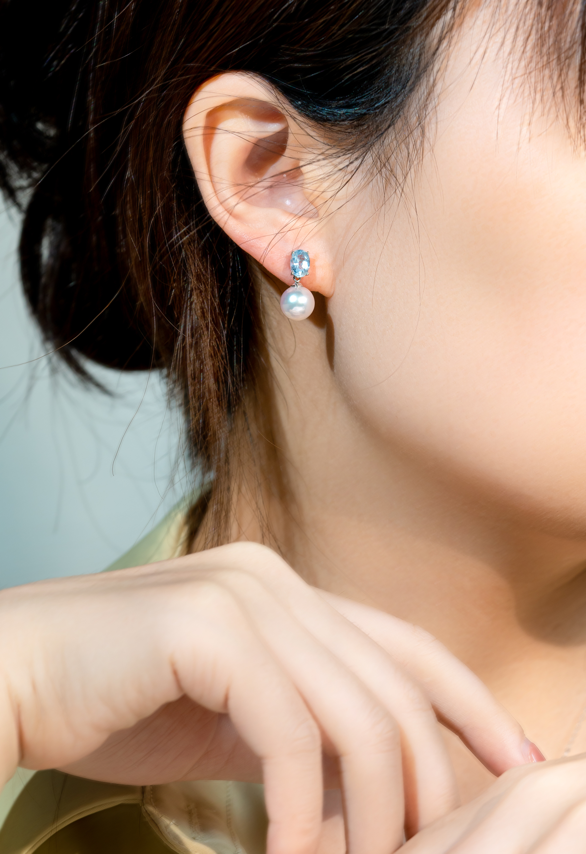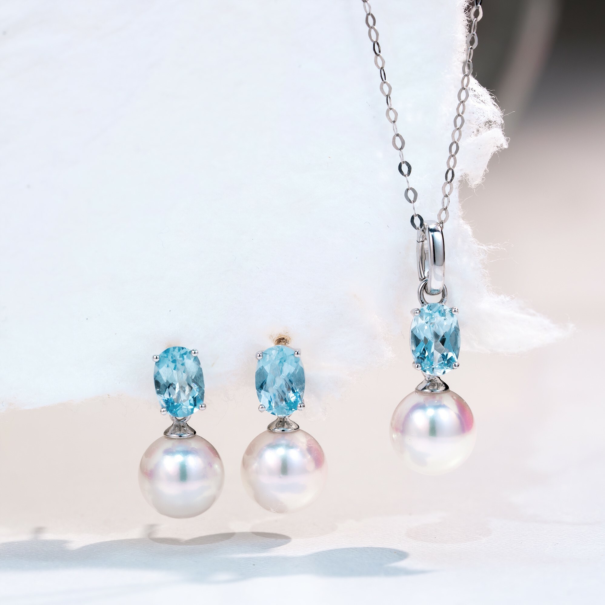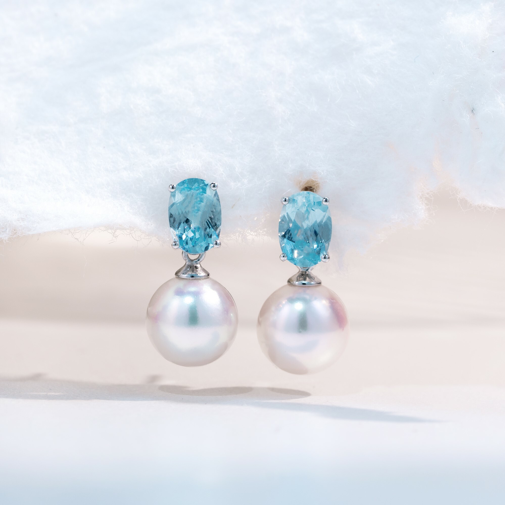 晶光閃耀的海藍寶搭配擁有粉色伴彩的頂級Akoya珍珠,十分的時尚優雅。沒有花天巧地的設計,僅僅使用了18K白金把兩種寶石聯繫起來,恰好能把注意力全都投放在珍貴無比的寶石上。