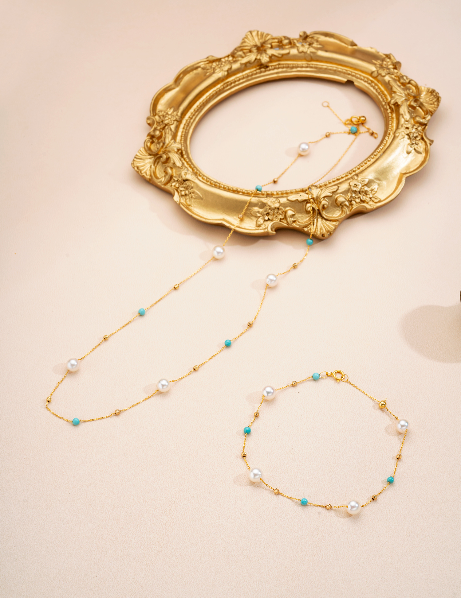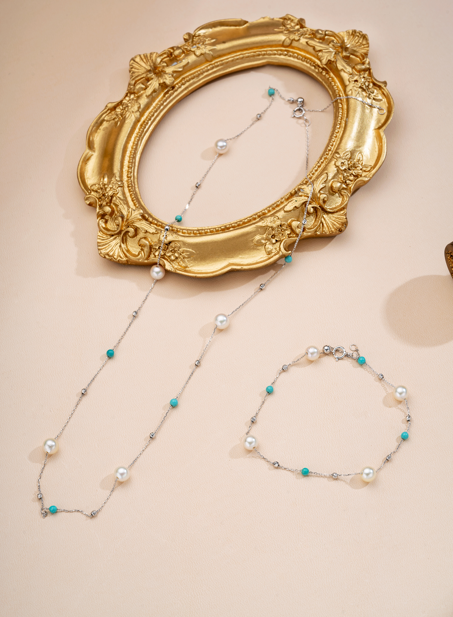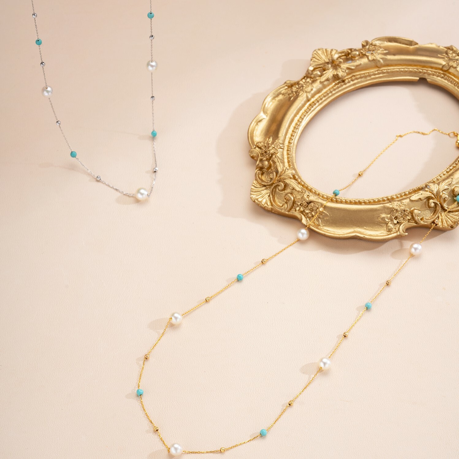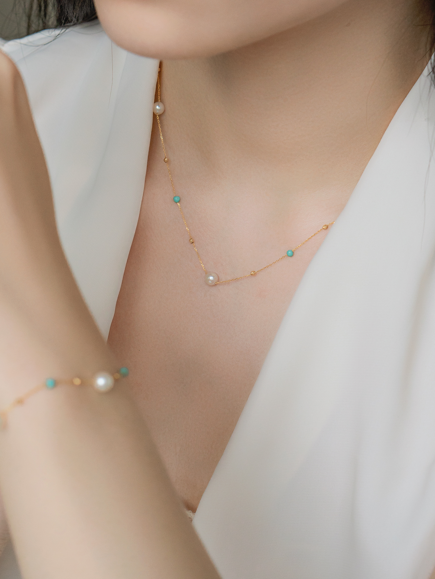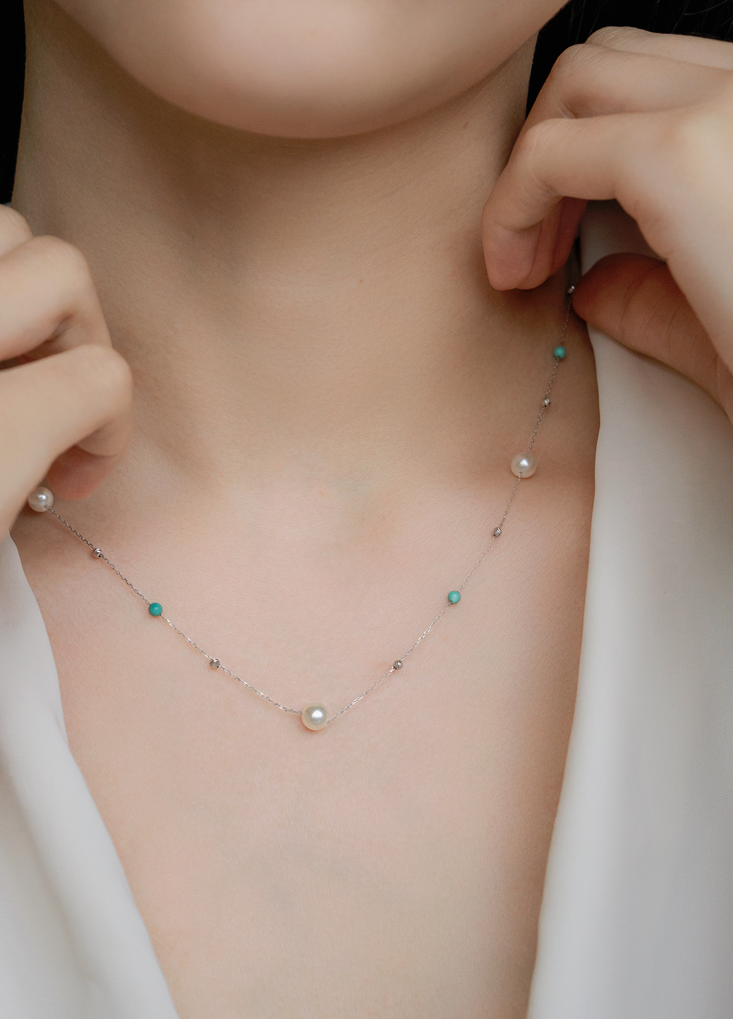 珍珠與其他天然寶石的配搭講求平衡與設計的美感,這款頸鏈特別採用小尺寸Akoya 珍珠配上18k小金珠和綠松石,三種元素以大小不一,交織錯落的設計描繪出一抹綠意盎然 朝氣勃勃的浪漫色彩,來自大地與海洋的融合,表達你別樹一格的個人品味與風情。