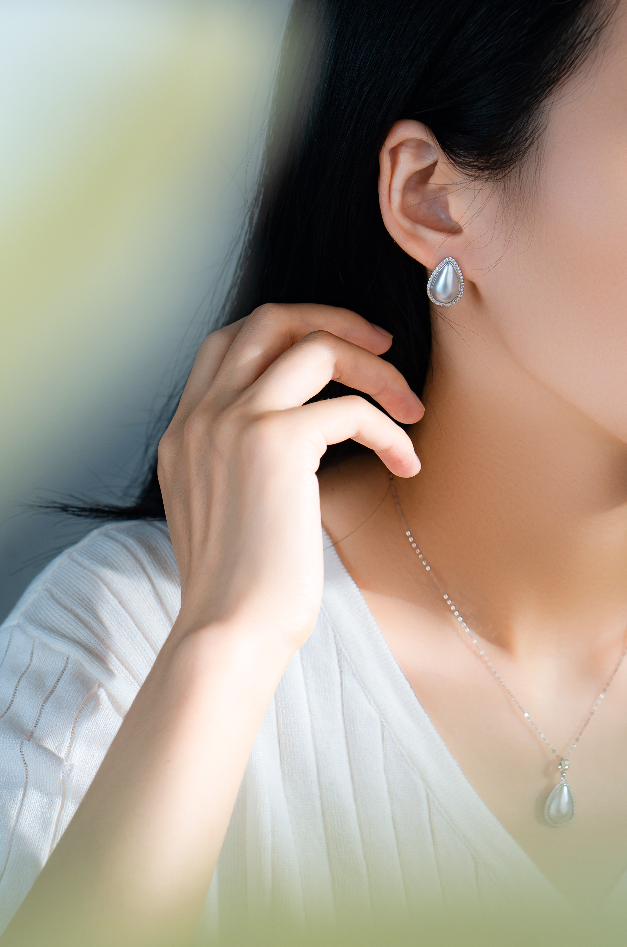 馬貝碩大的尺寸賦予它與生俱來的復古感。產自澳洲的白馬貝,有著像澳白珍珠般的絲滑感,銀灰色的主體色及強烈鏡面效果,低調卻不失高級感。鑽石圍邊的設計為這水滴形馬貝注入優雅,使耳環整體變得更加閃爍。圓潤的水滴型馬貝能夠牢牢地貼着你的耳珠,復古感十足又透露著女性的韻味。