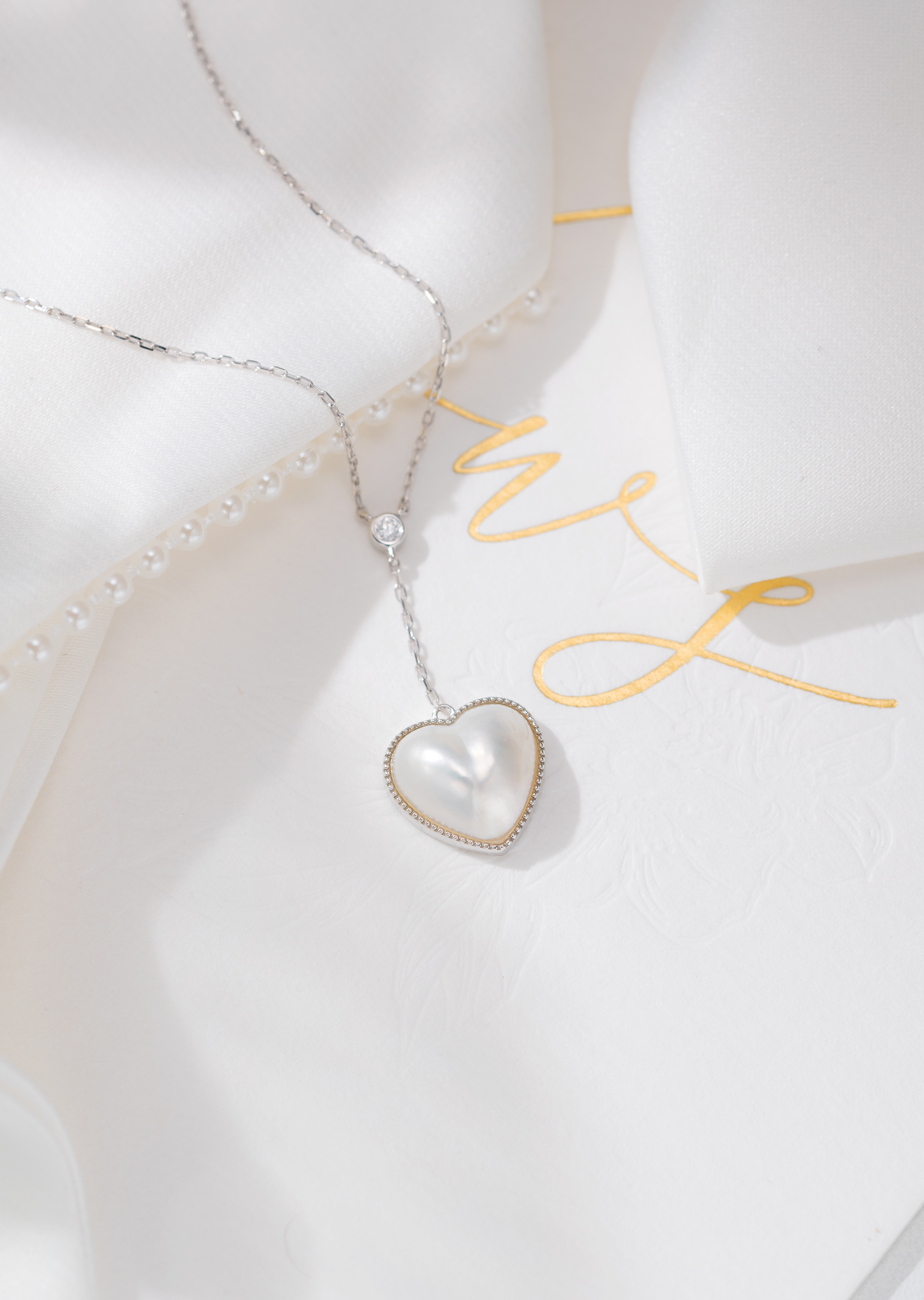 皎潔透亮的心形白馬貝,由內而外滲透着令人炫目的色彩,鑲嵌在18K白金內,更能彰顯出白馬貝的溫柔韻味。配合高雅的鑽石及耐用的18K金盒仔鏈設計,添上一份時尚氣息。