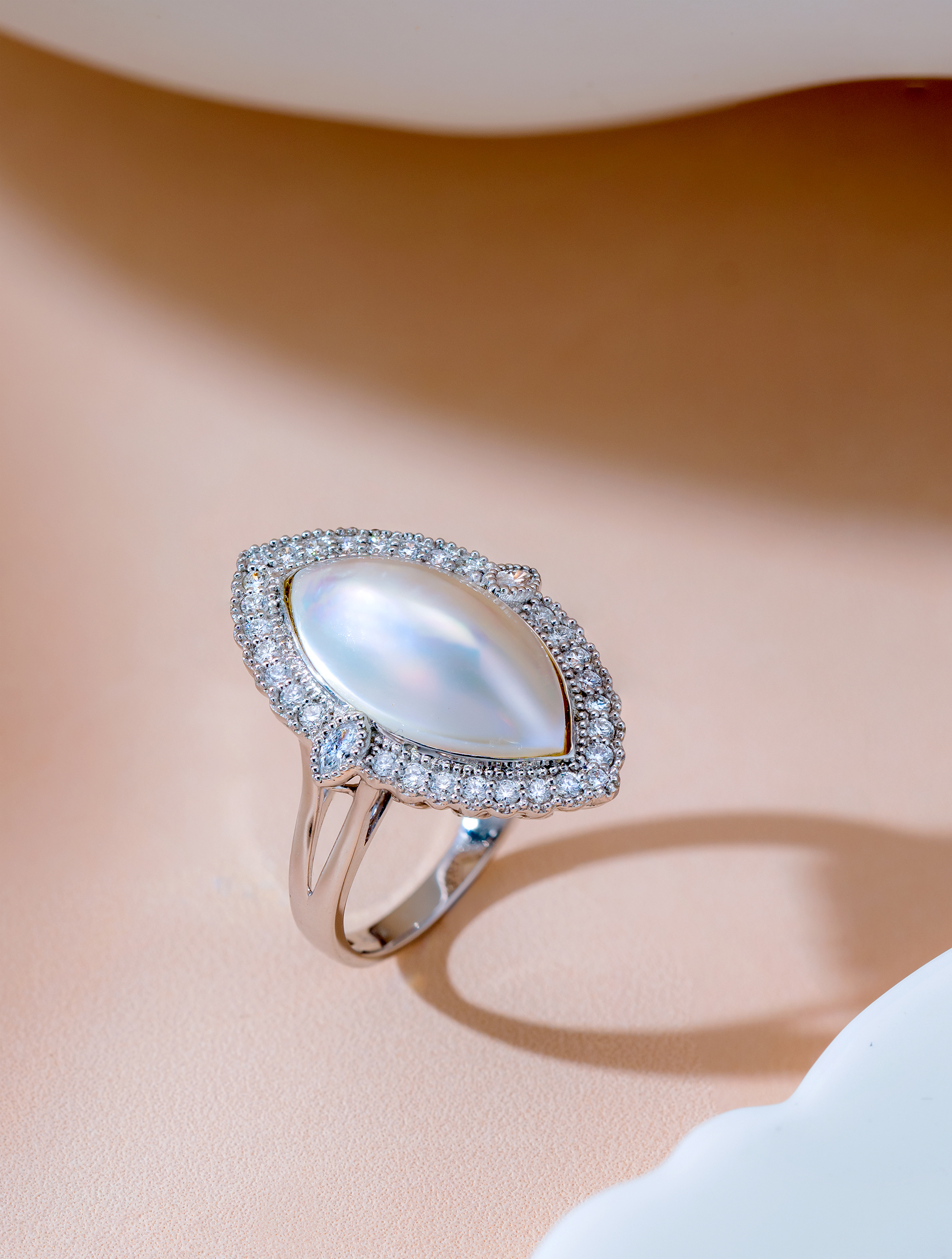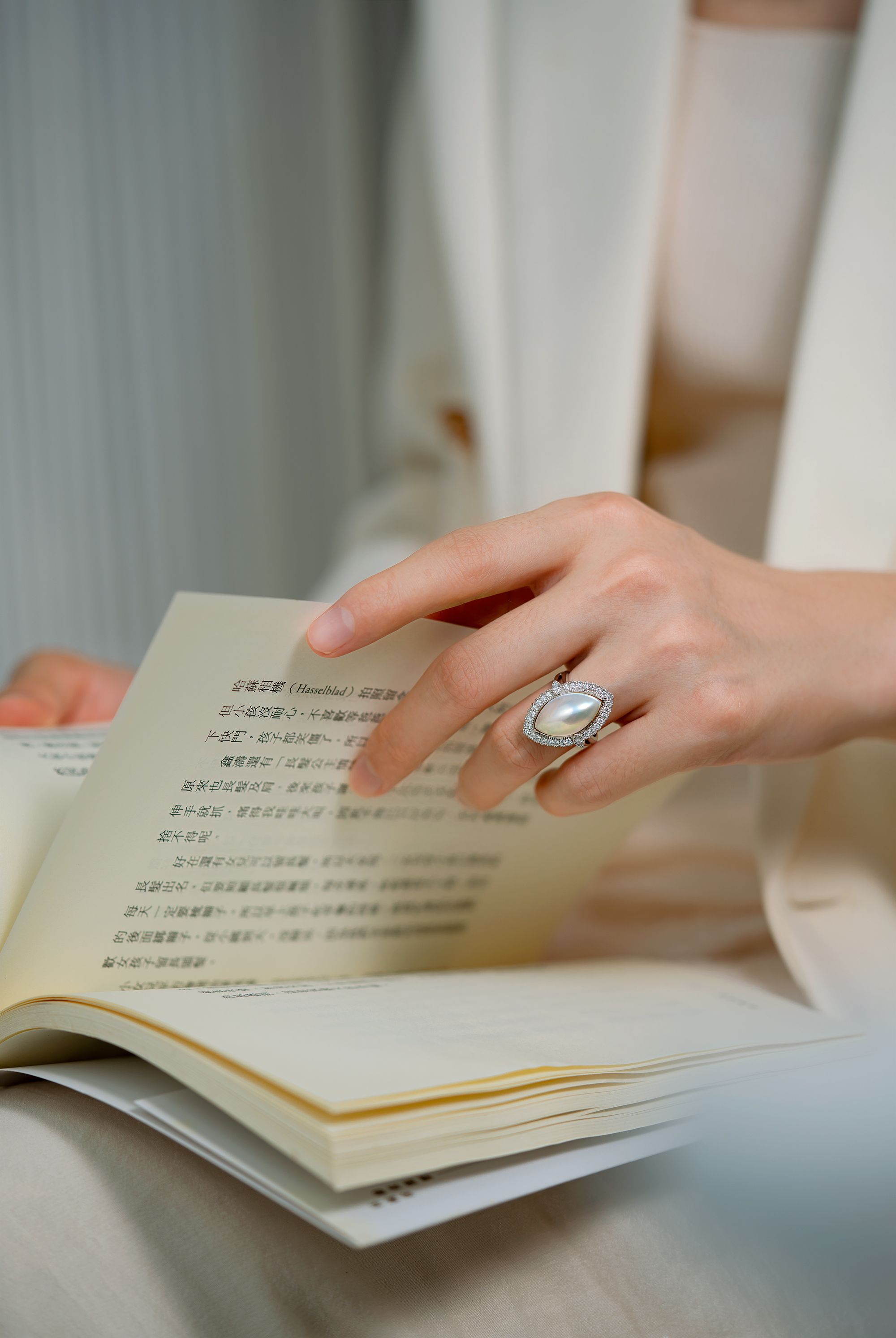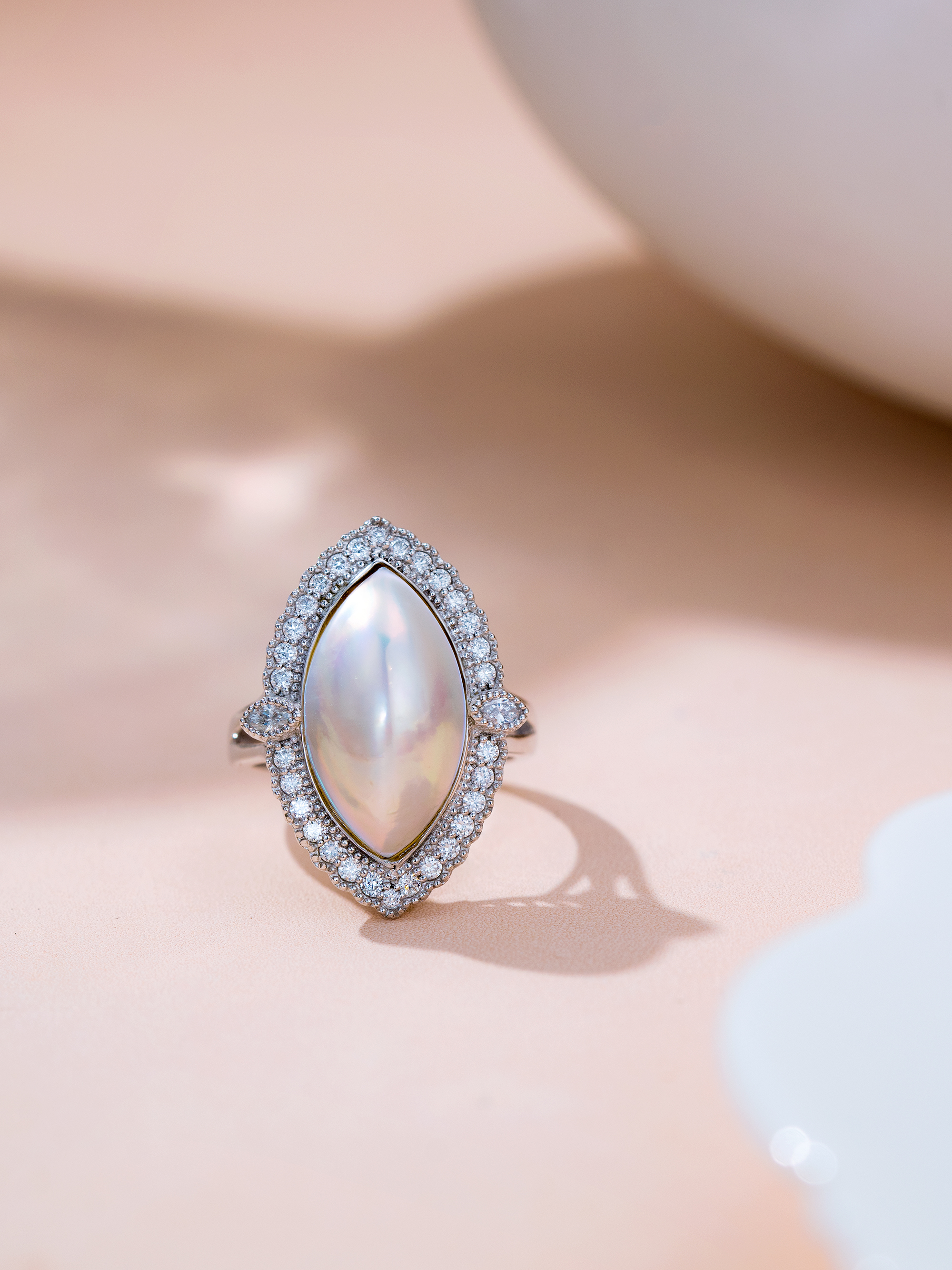 戒指的中心鑲嵌了一顆馬眼形白馬貝,此款珍珠以其獨特的形狀和柔和的光澤著稱。