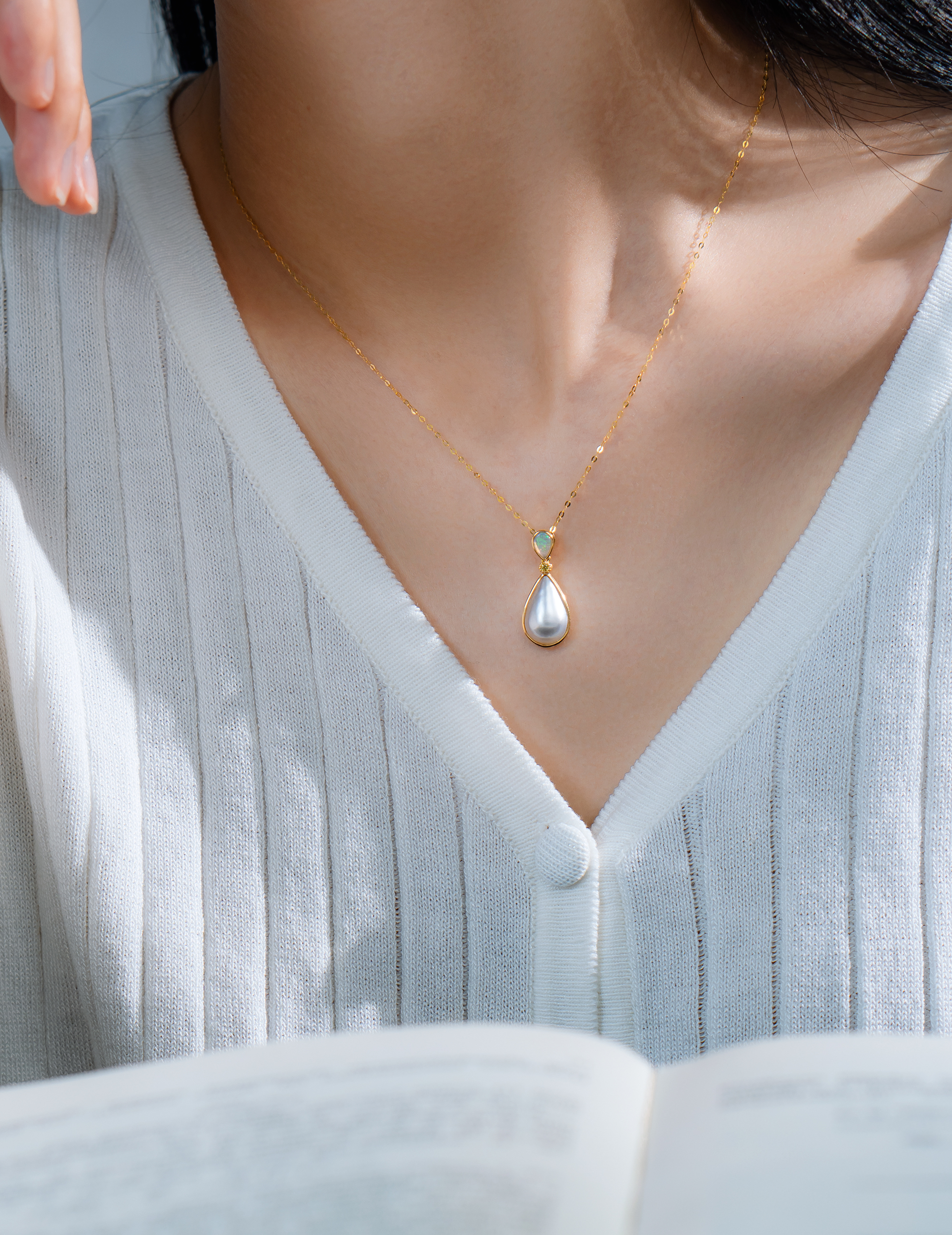 這款絕對是一款高貴幻彩的吊墜,採用獨特的雙重水滴設計融合水滴形白馬貝和水滴澳寶,