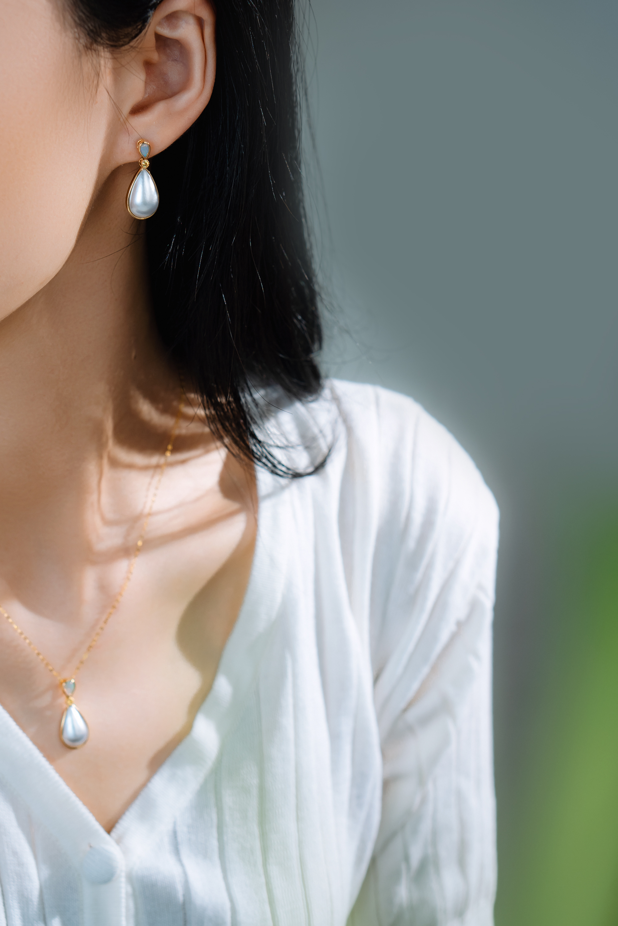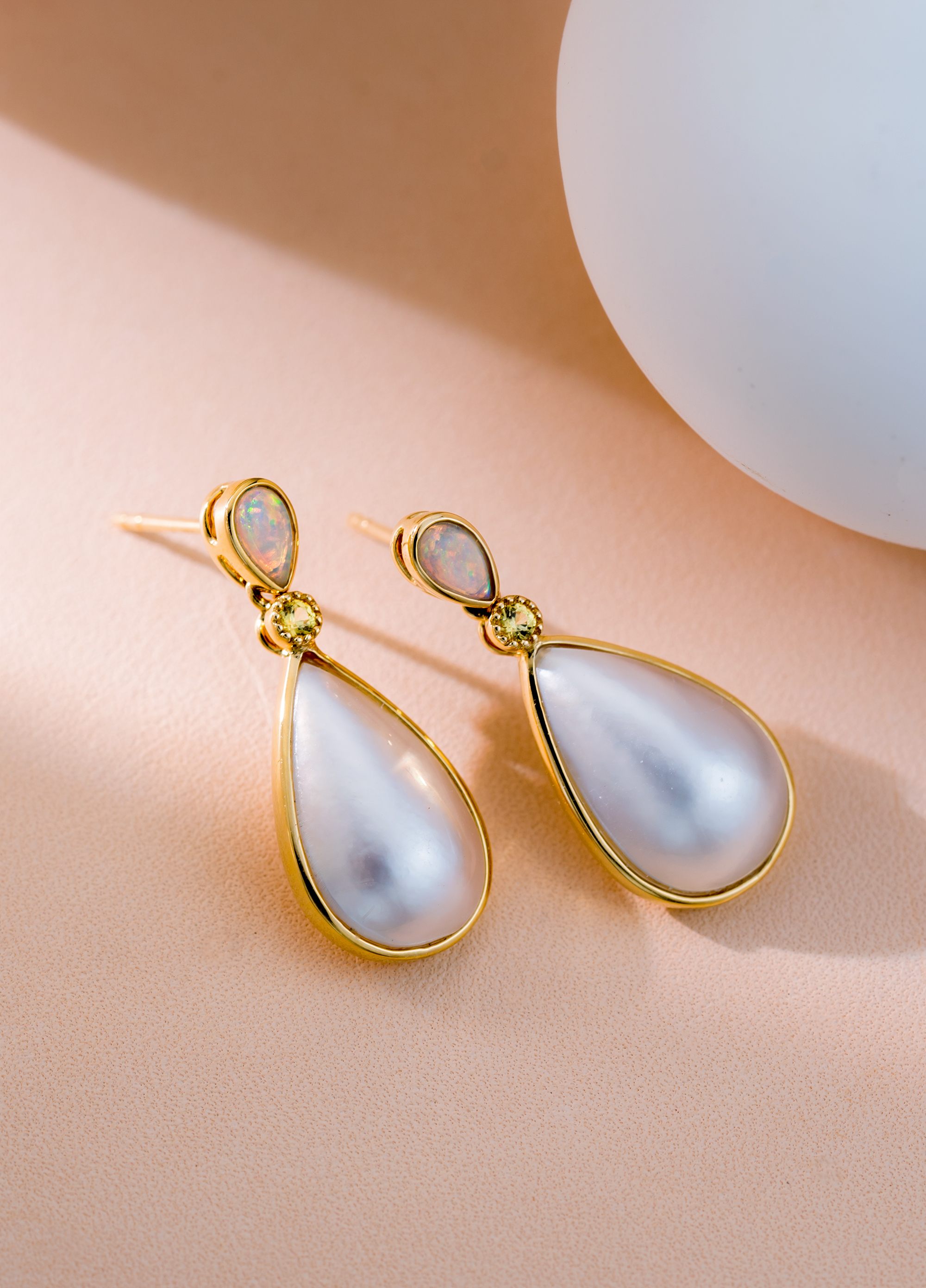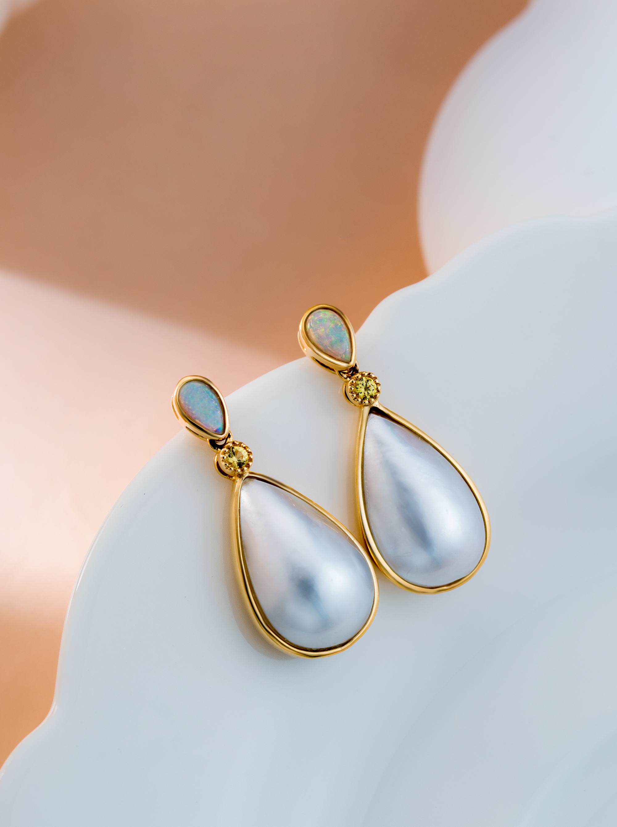 這對耳環絕對是一款高貴幻彩的設計,採用獨特的雙重水滴造型,融合了澳洲水滴形白馬貝和水滴澳寶。再加上連接白馬貝和澳寶的閃爍黃寶石,散發出絢麗多彩和迷人之美。同時搭配18K黃金,所散發的光芒仿若捕捉了時光中的一瞬奇蹟。這對耳環絕對能為您的風格增添一抹獨特光彩,猶如展現一段美麗又奇幻的故事。