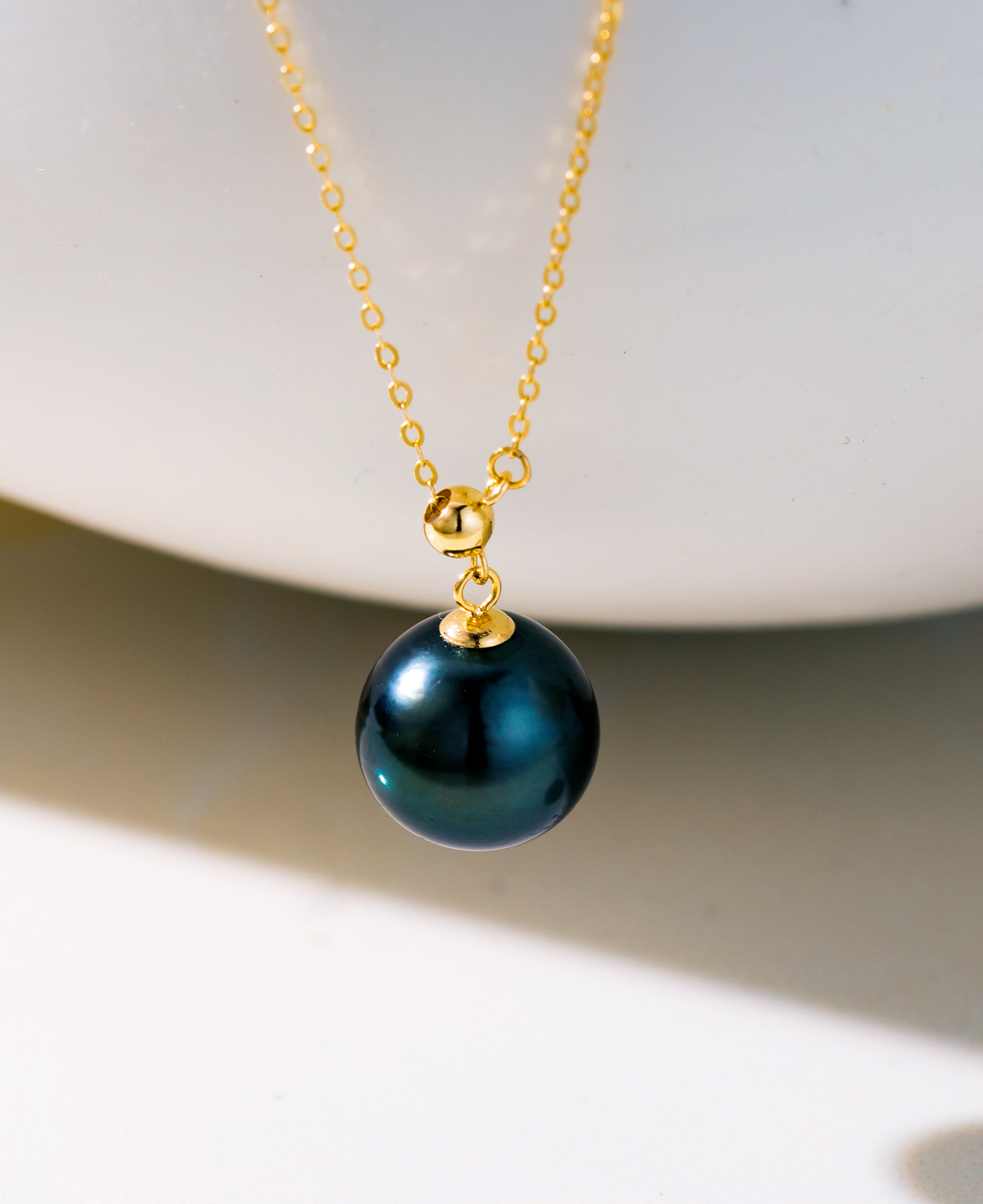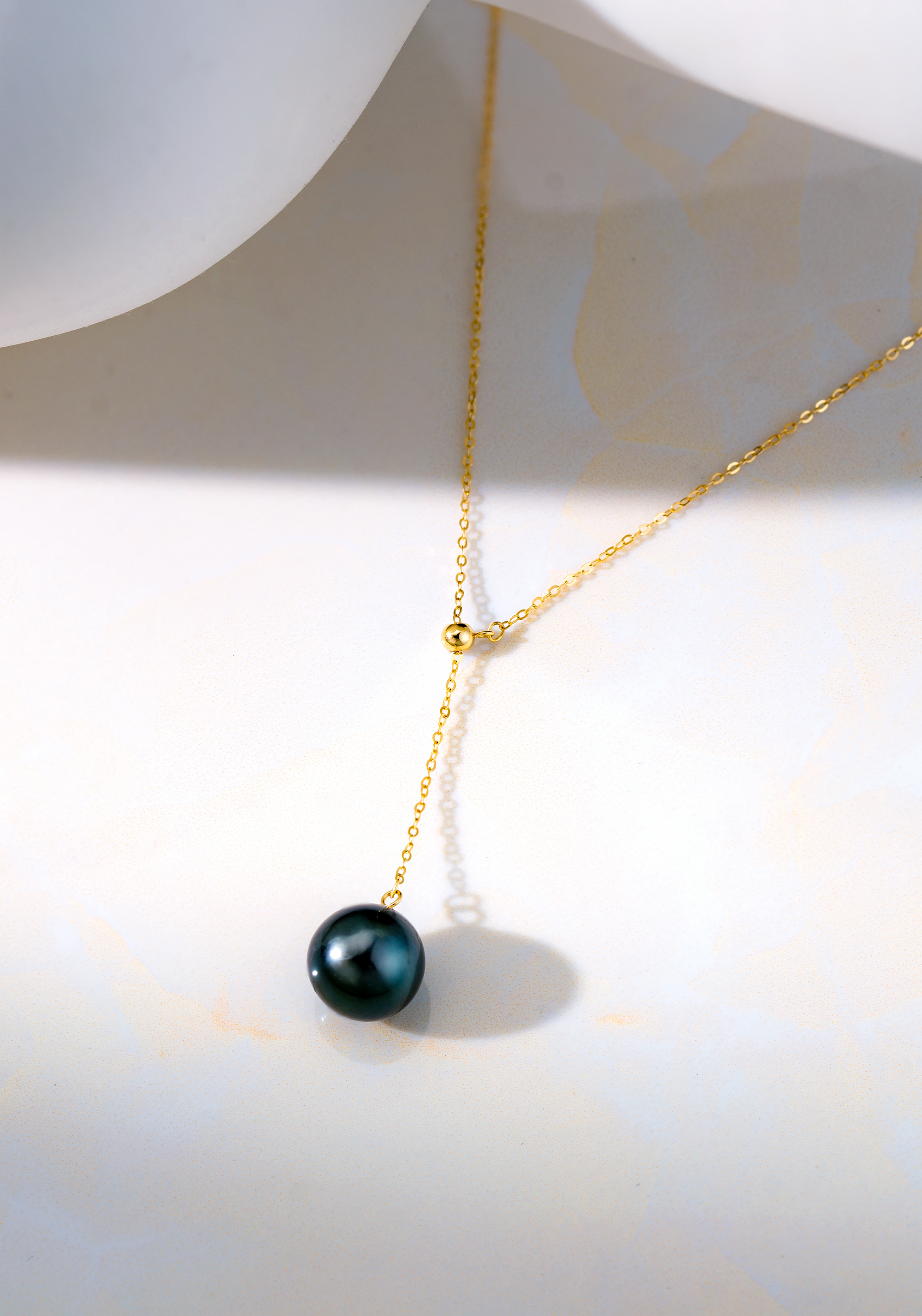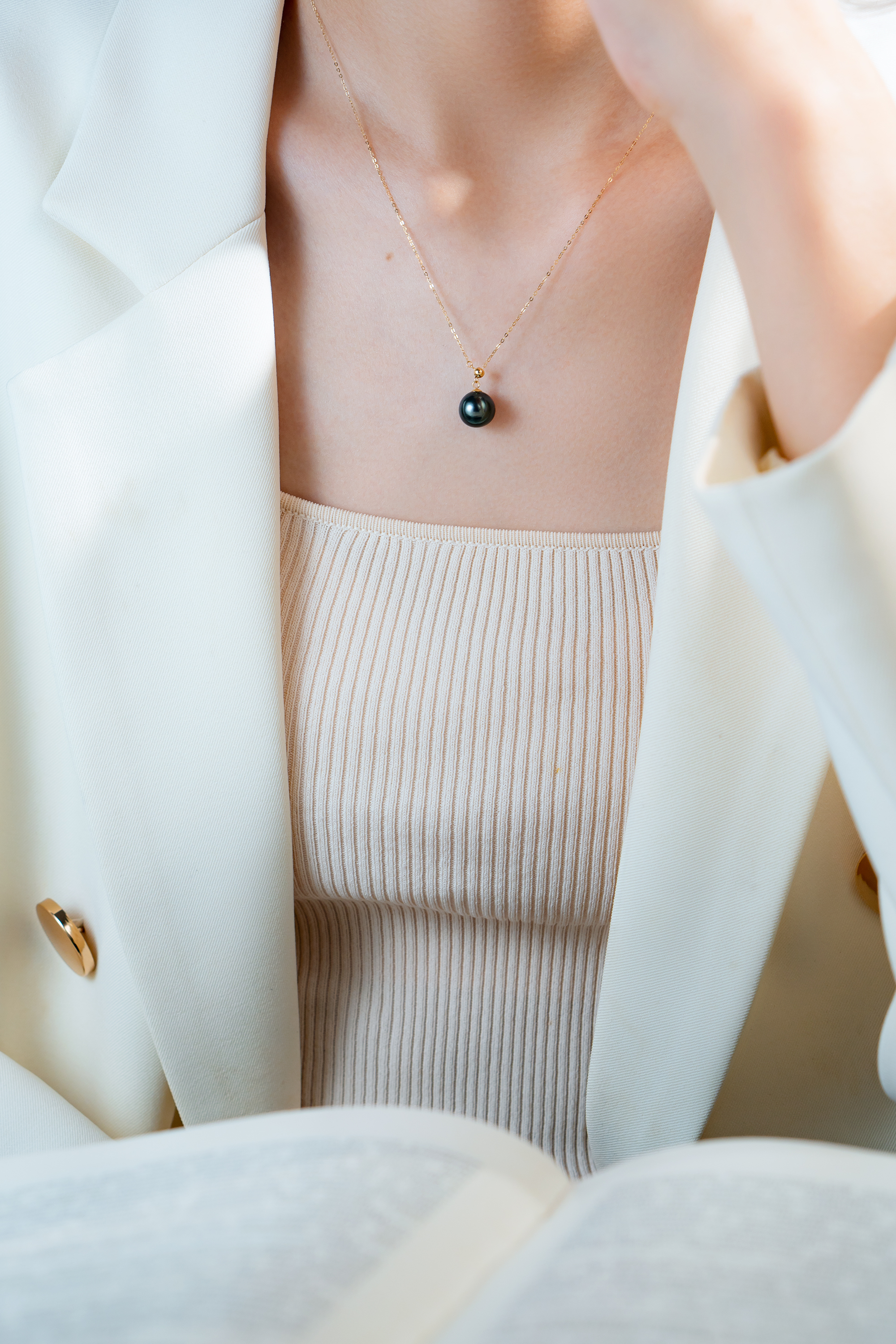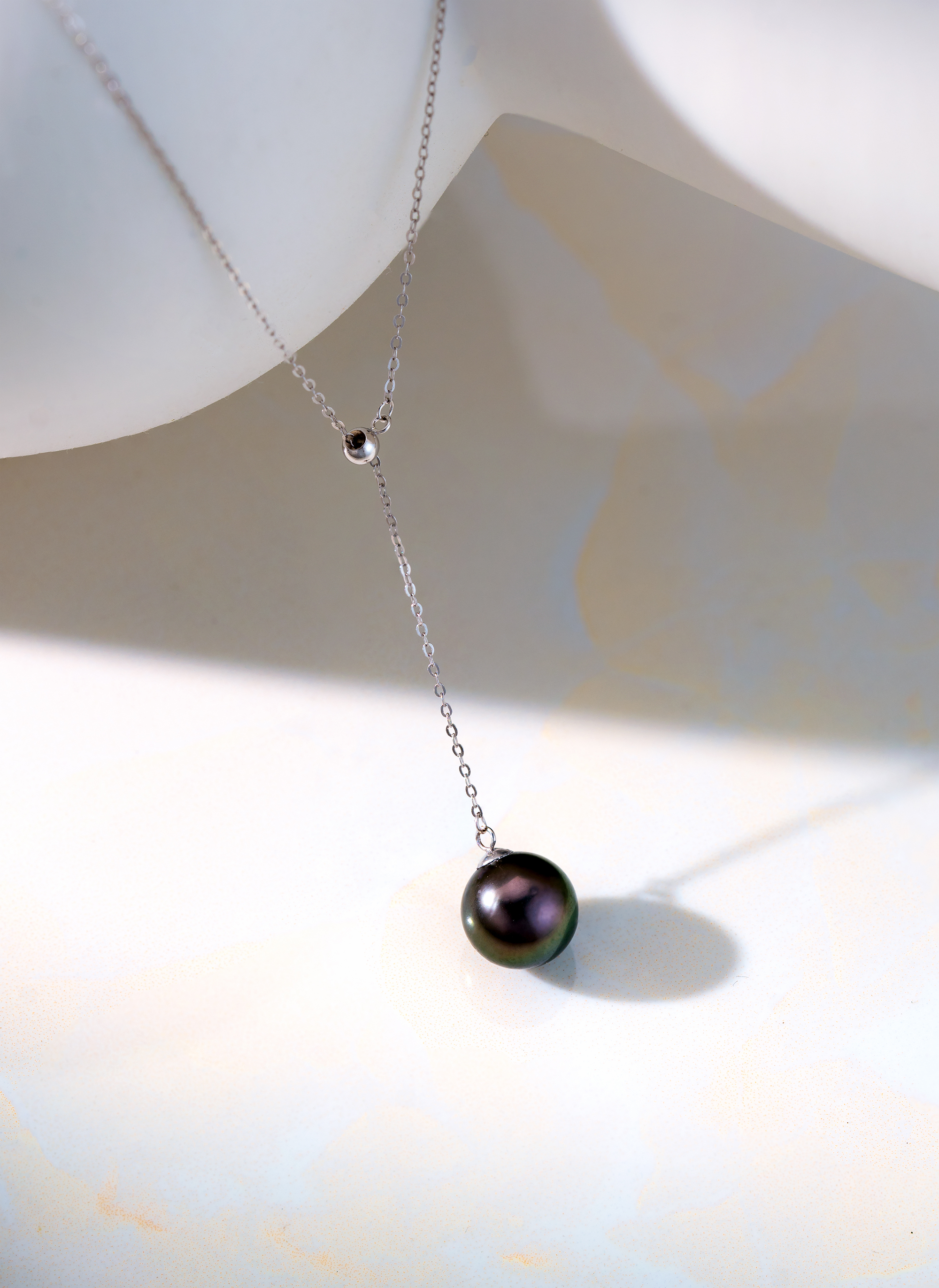 這款頸鏈展現簡約而知性的美感。孔雀綠的璀璨珠光為神秘的黑珍珠增添一抹奢華光彩,完美展現冷艷氣質與幹練風範。搭配流暢優雅的Y字設計,既時尚又能修飾頸部線條,完美襯托佩戴者的氣質與品味。