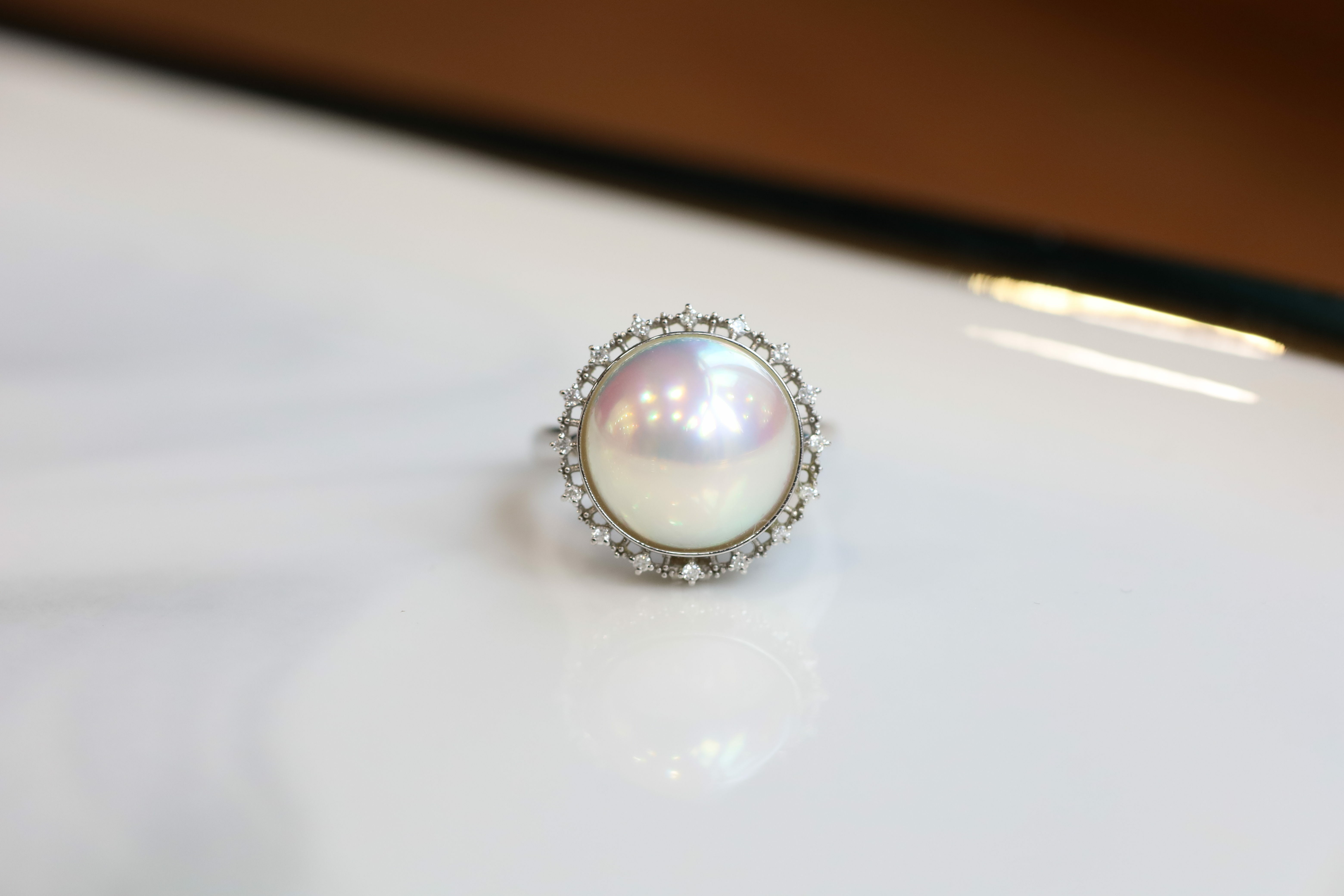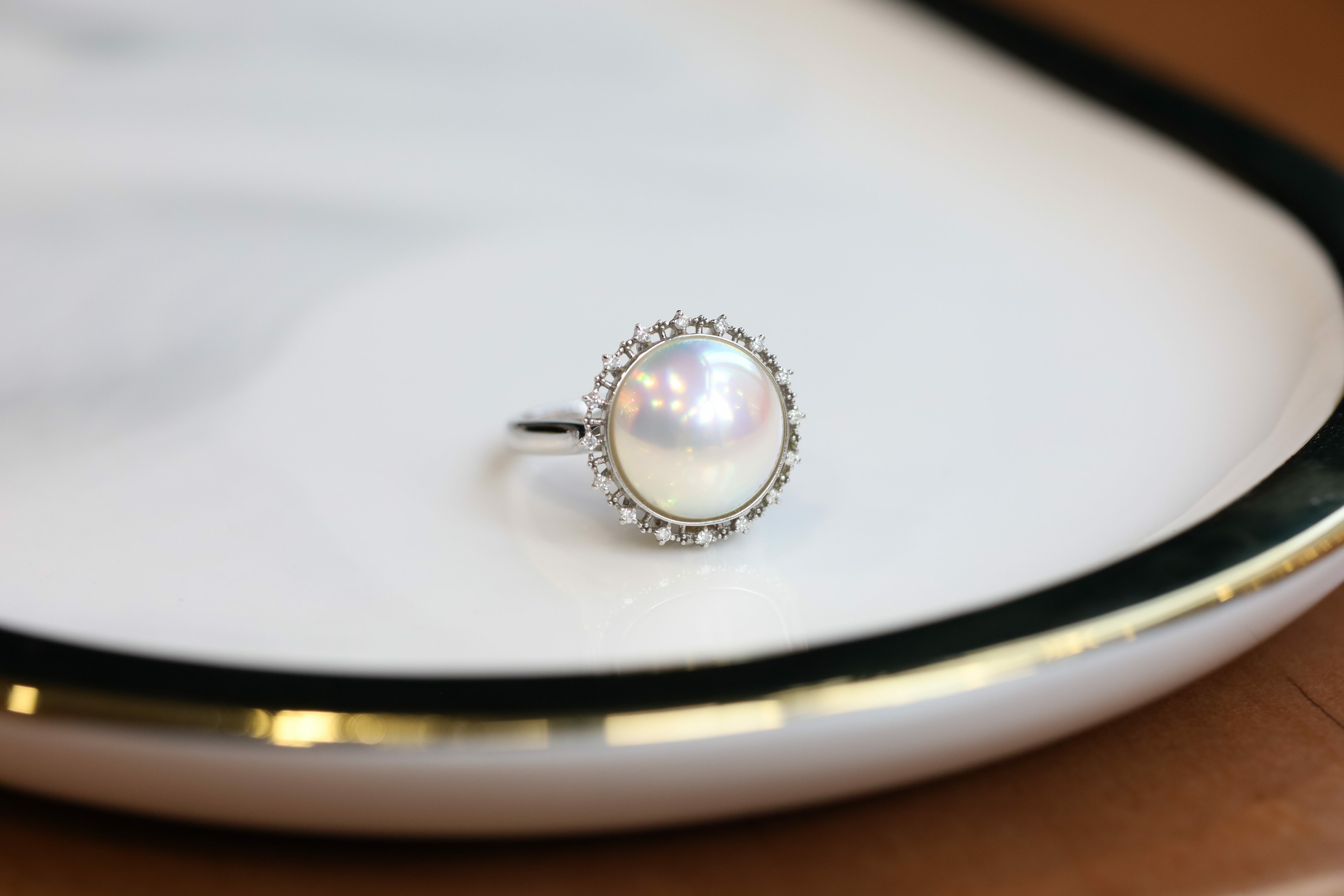 18K白金的花型戒指托搭配上渾圓碩大的白馬貝,復古味十足。圍繞著白馬貝的還有繁多的小碎鑽,戴上這枚戒指後,宛如宮廷貴族的一份子,高貴且得體。搭配上略略隆重的穿搭,就能顯得非常有氣派。